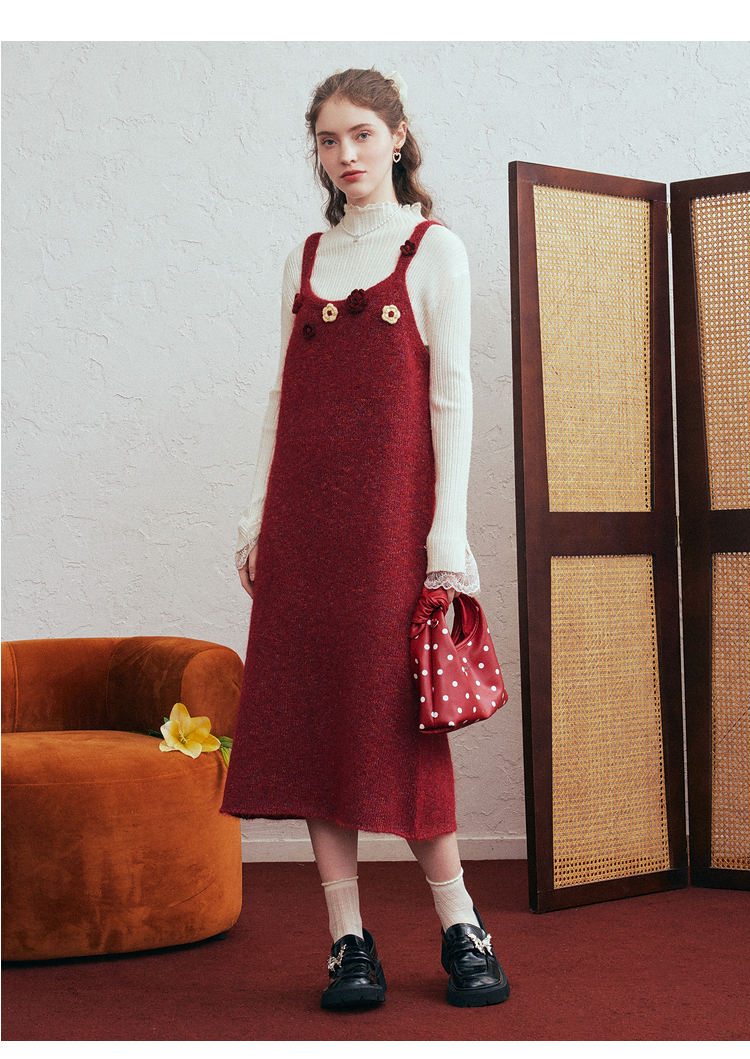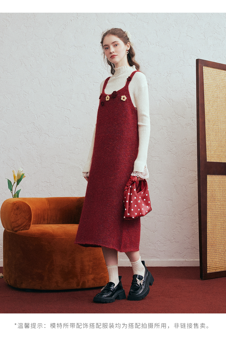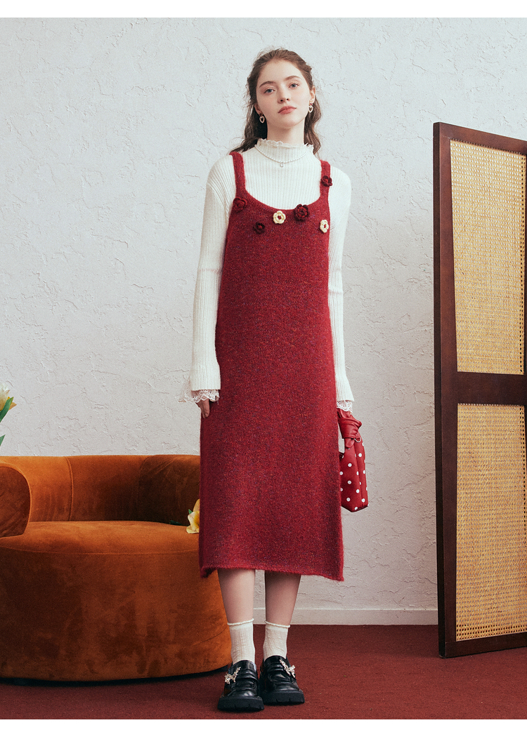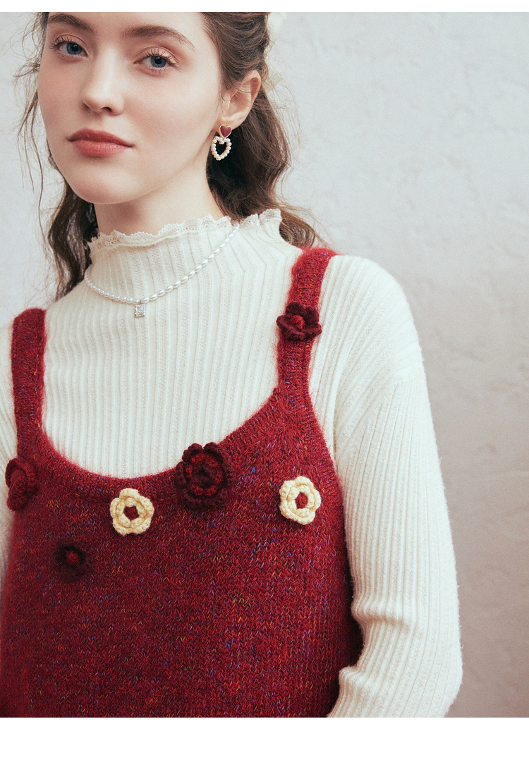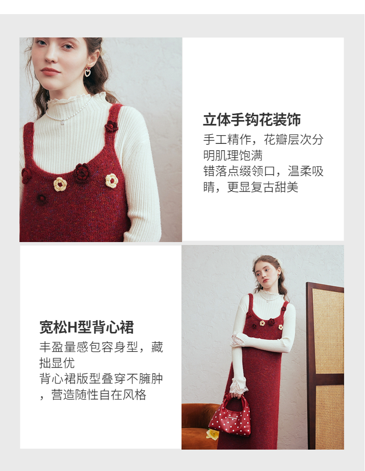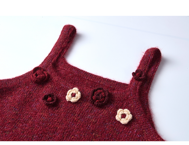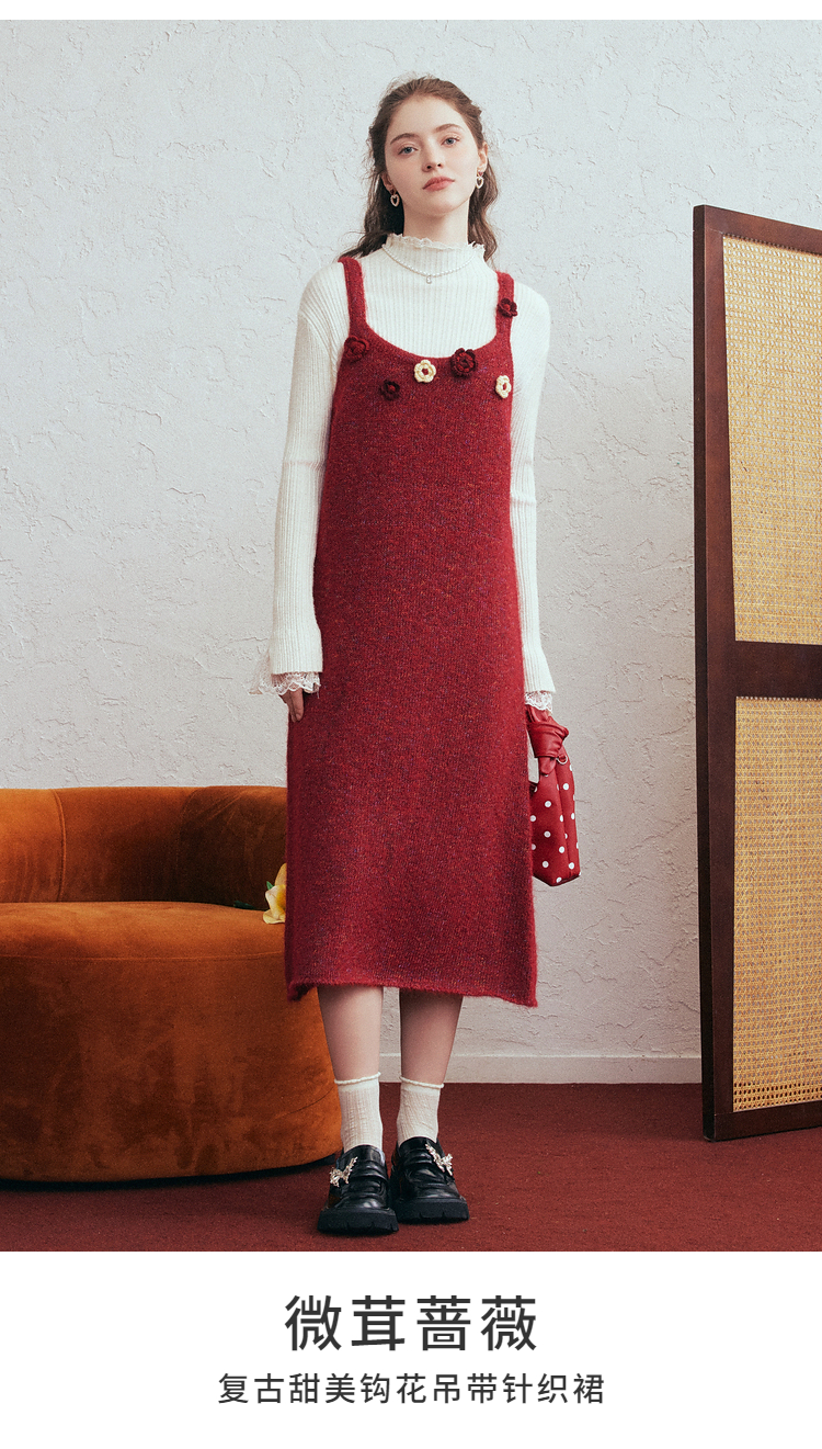 两三事 微茸蔷薇 2026春季新款立体手钩花吊带裙毛织连衣裙
