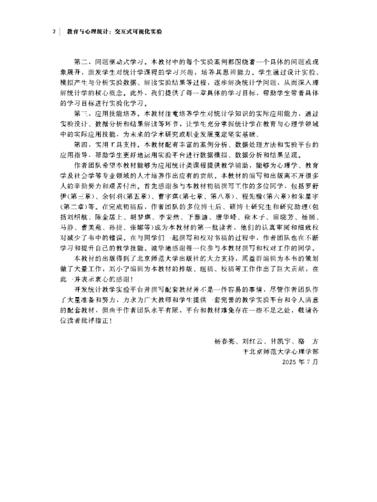 《教育与心理统计:交互式可视化实验》是作者团队结合自己在北京师范大学心理学部多年从事心理统计课程的教学经验开发的“教育与心理统计交互式可视化教学实验平台"的配套教材。本教材不仅能帮助读者更好地完成教育与心理统计的学习,还能培养谈者对统计知识的实际应用能力,充分掌握统计学在教育与心理学域中的实际运用技能,为未来的学术研究或职业发展奠定坚实基础。