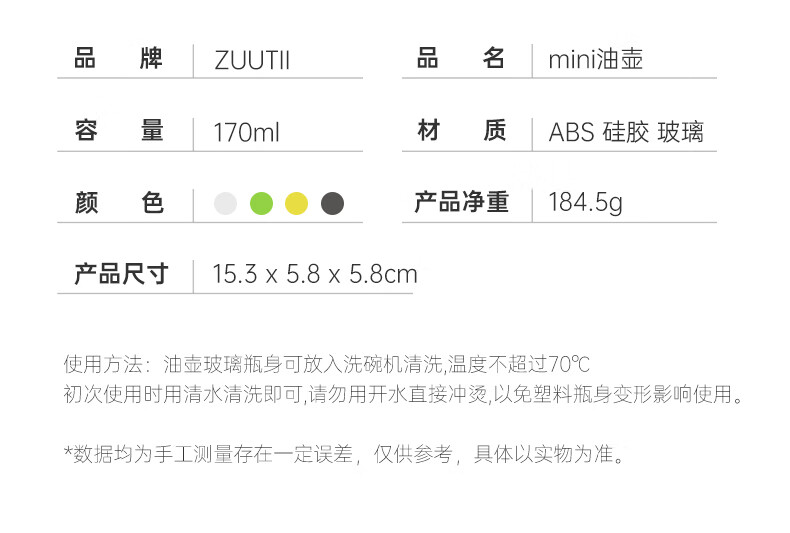 ZUUTII加拿大油瓶厨房自动开合玻璃罐调料罐Mini油壶 柠檬黄170ml【不支持补差,非质量问题不退不换】S