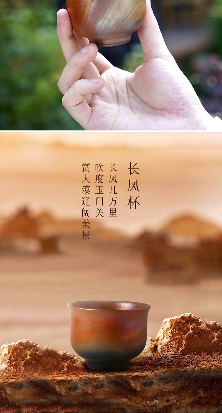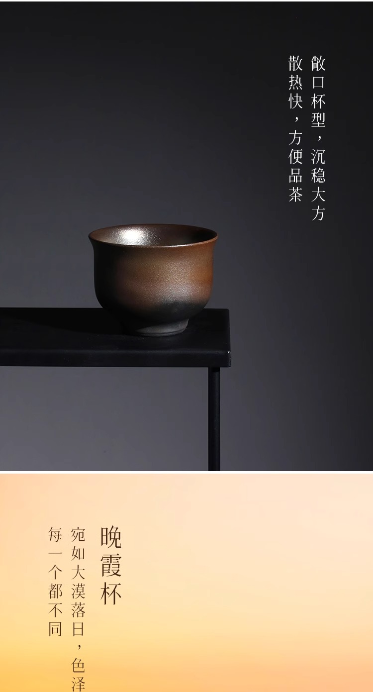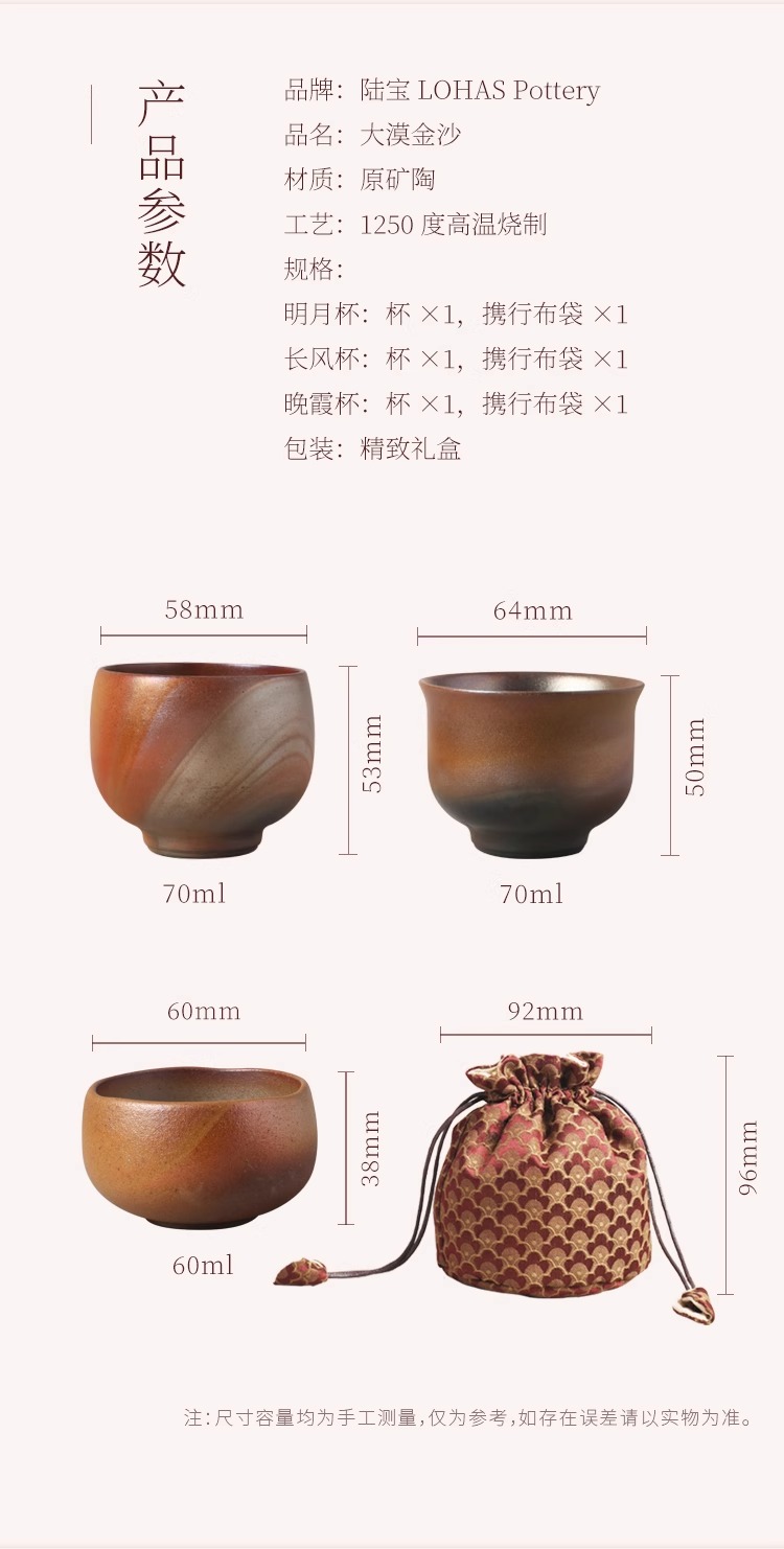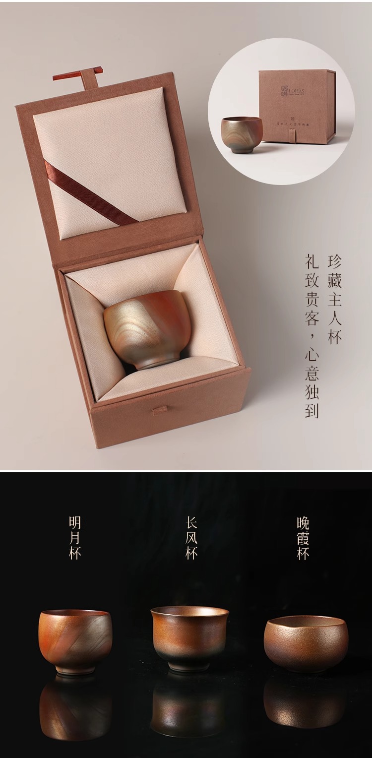 【样品特惠6折,仅1个,无货退款】台湾陆宝柴烧大漠金沙功夫茶杯品茗杯高档主人杯单个礼盒装单杯晚霞杯60ml明月杯70ml长风杯70ml