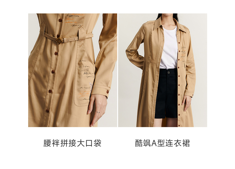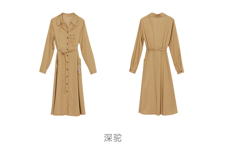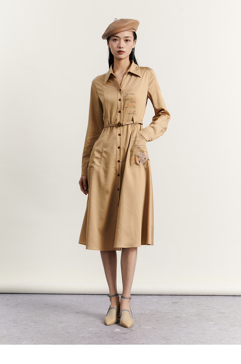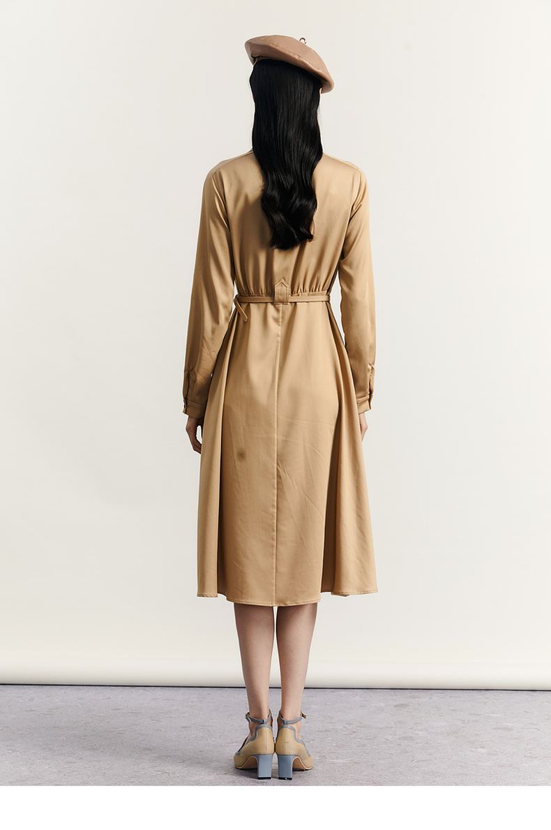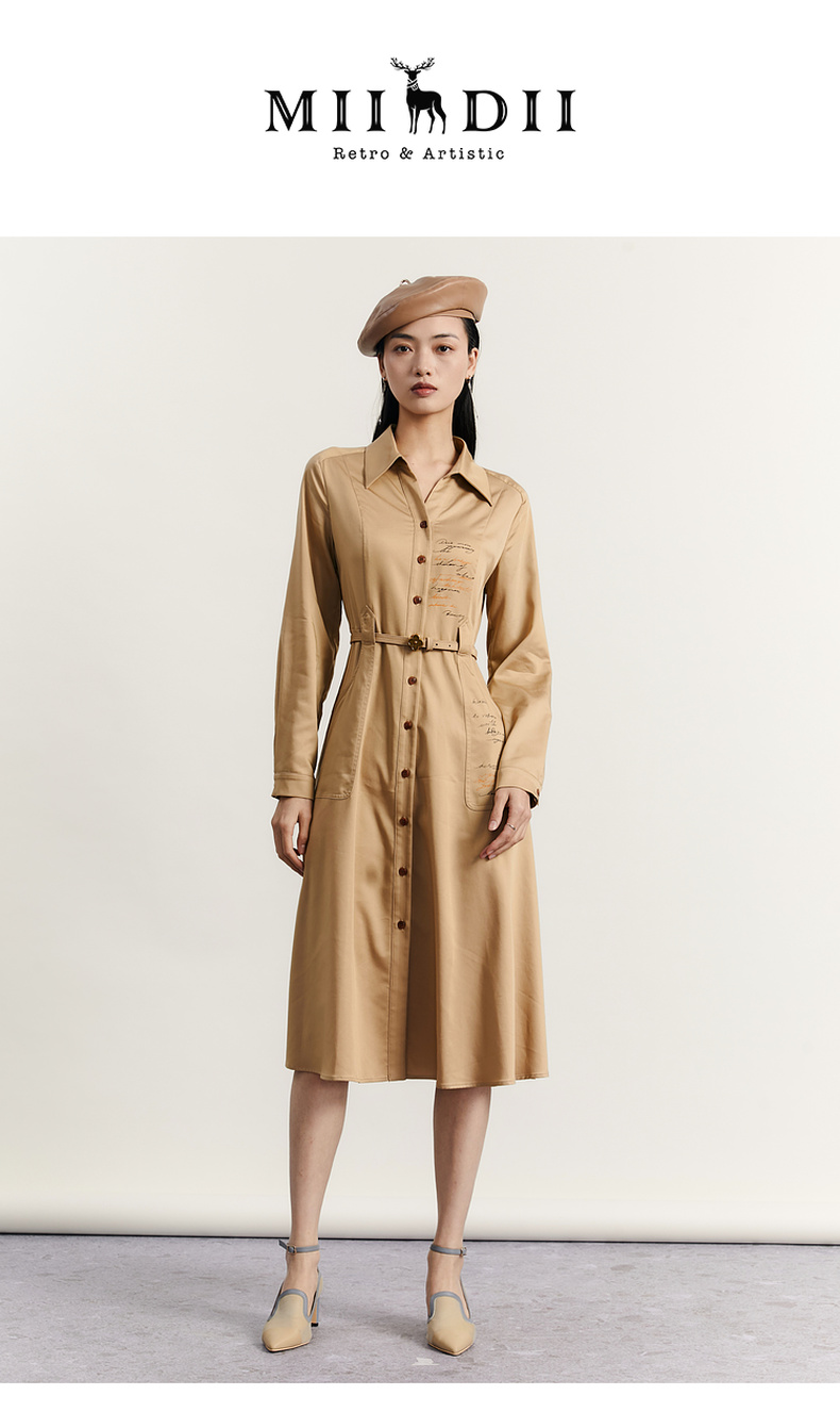 谜底通勤连衣裙2023秋季新款复古收腰中长裙长袖配腰带233ML1145