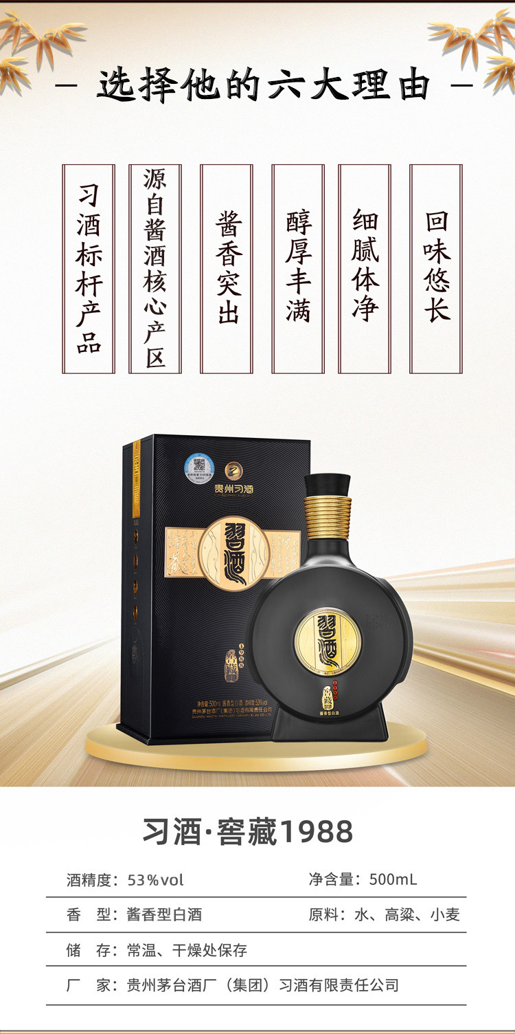 【国内贸易】习酒 53 度酱香型白酒 窖藏 1988 500ml(海口发货)