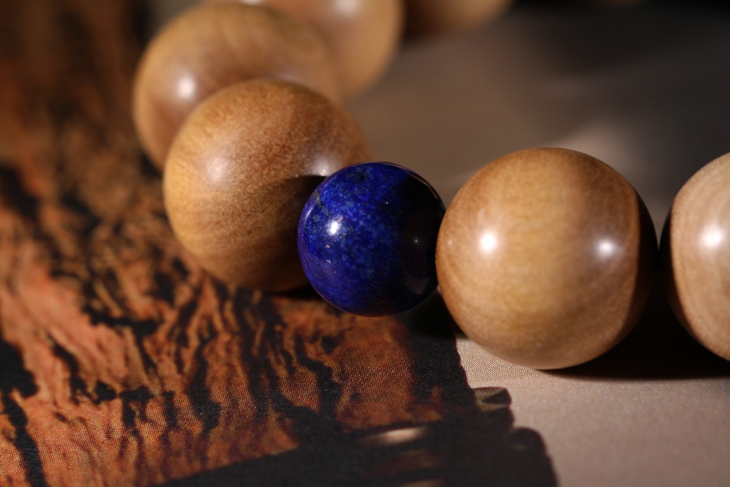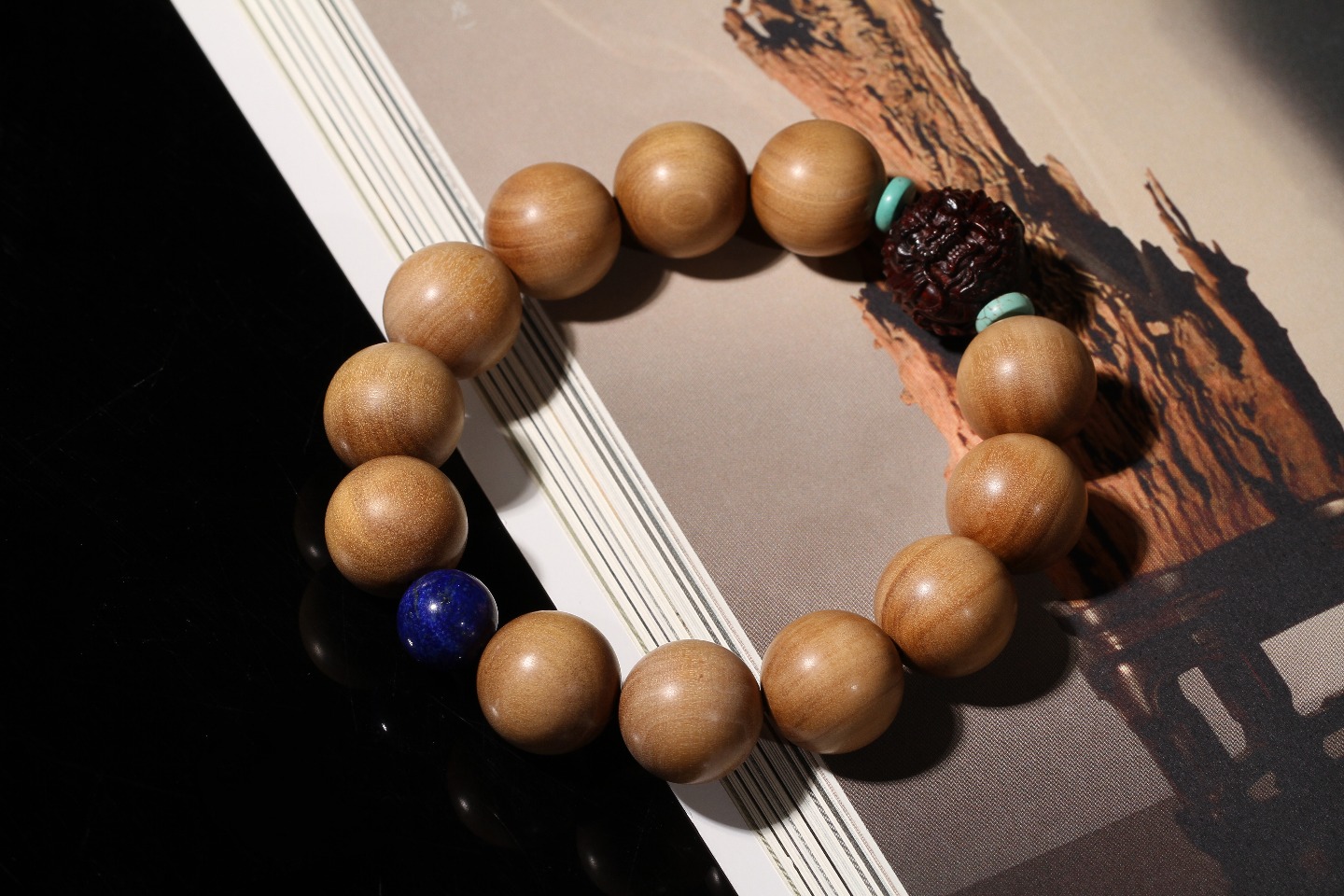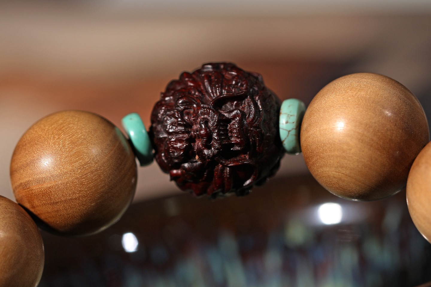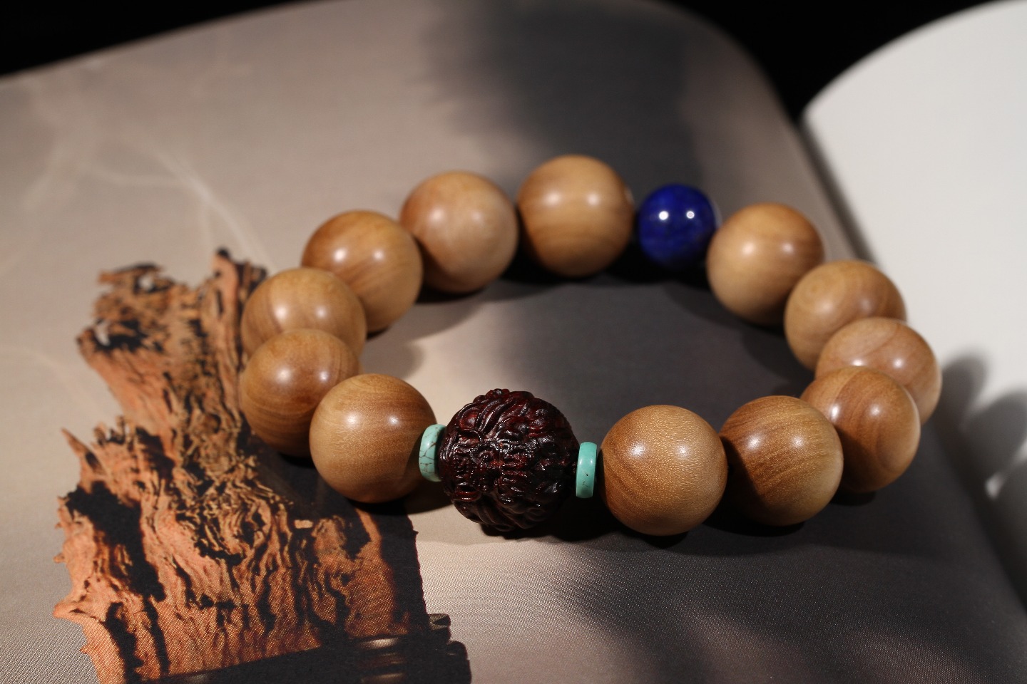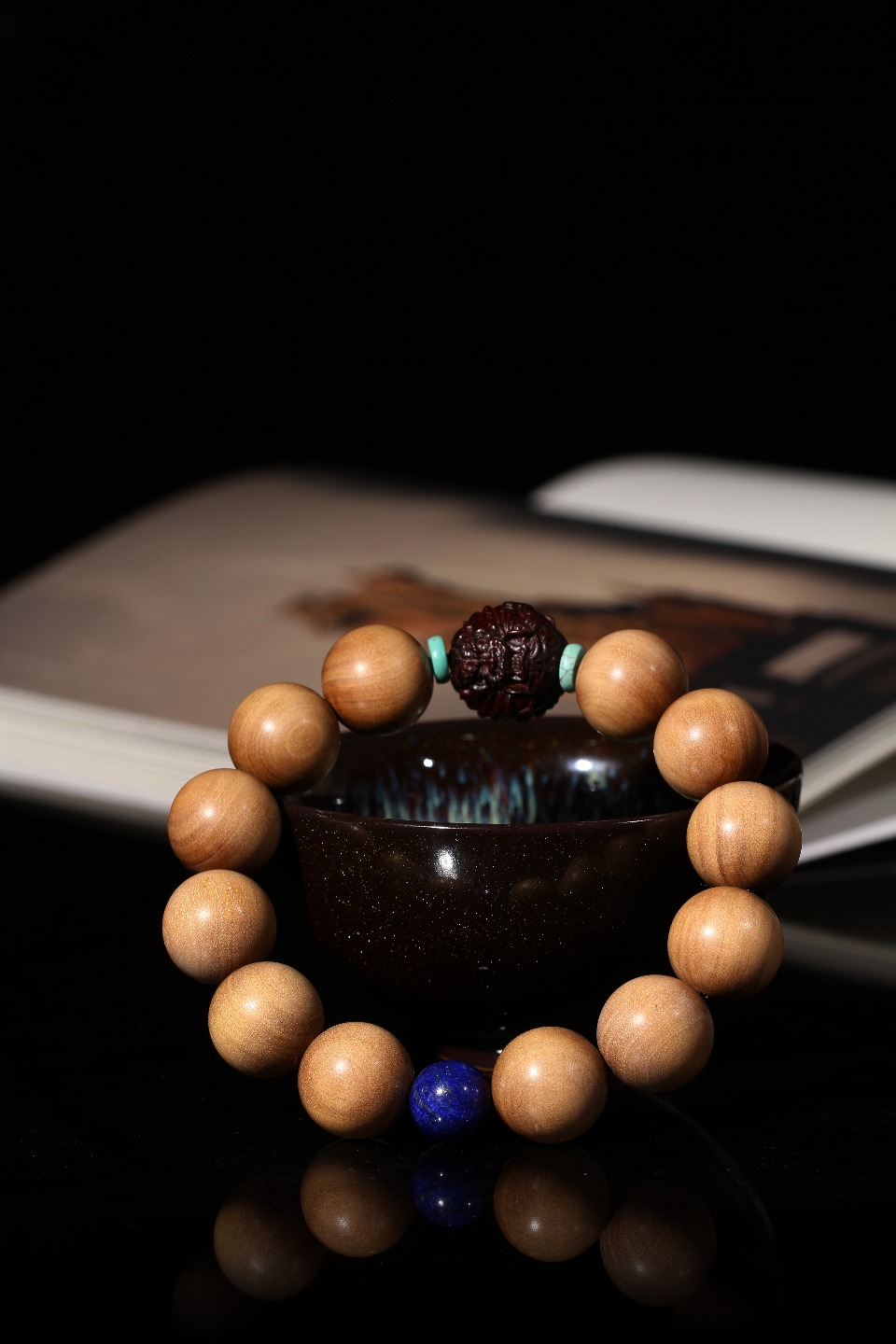 搭配:精工老山檀香为主,搭配小叶紫檀护身龙,青金及绿松点缀,奶香味醇厚迷人,有提神醒脑之功效,可驱散焦虑的情绪。