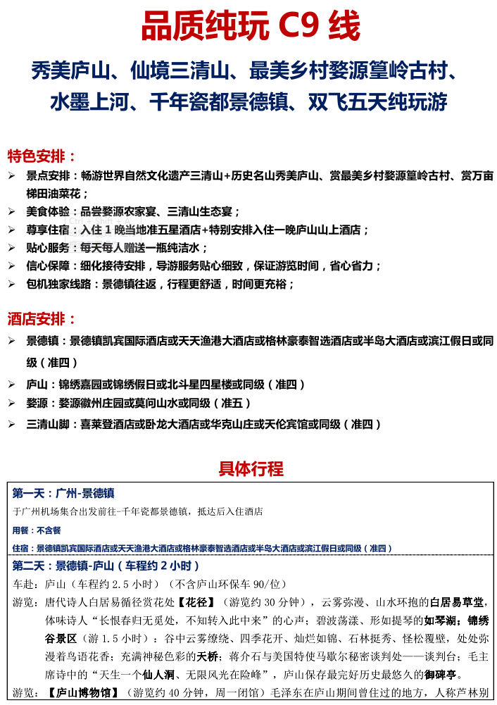 品质纯玩C9线 秀美庐山、仙境三清山、最美乡村婺源篁岭古村、 水墨上河、千年瓷都景德镇、双飞五天纯玩游
