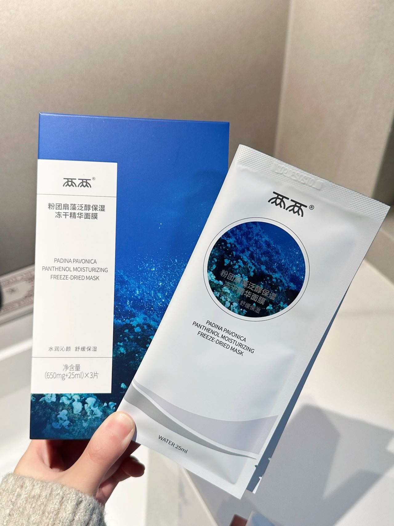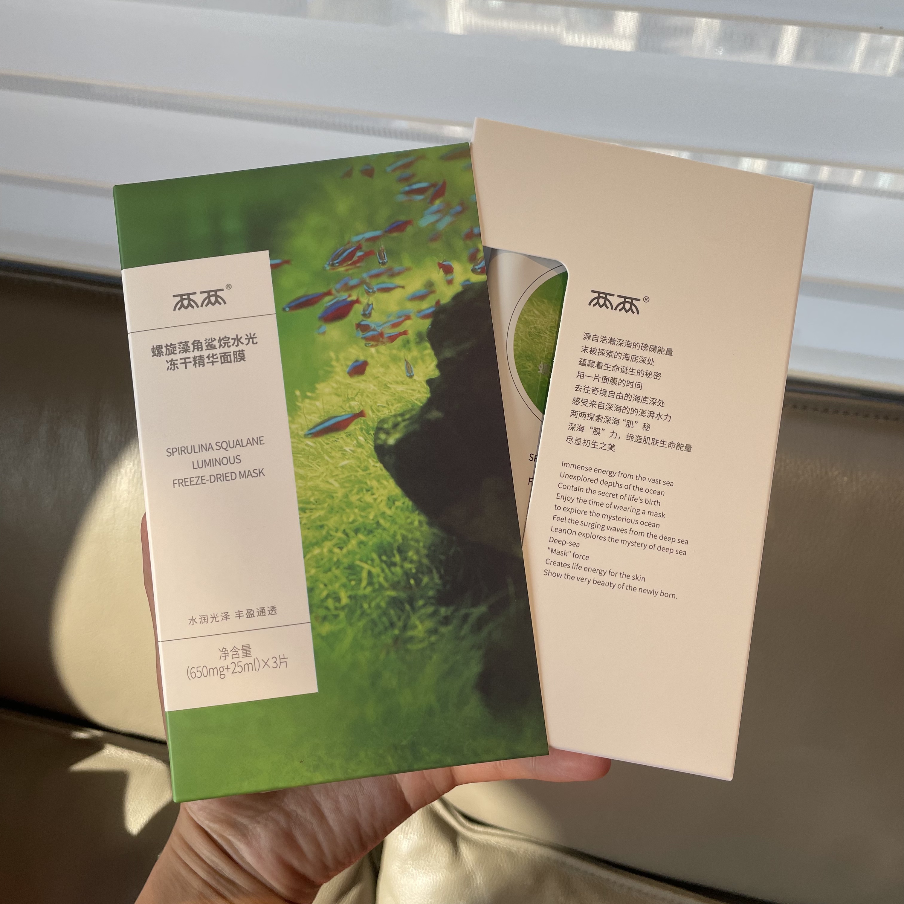 【品名】两两粉团扇藻泛醇保湿/螺旋藻角鲨烷水光冻干精华面膜(650mg+25ml)*3片/盒