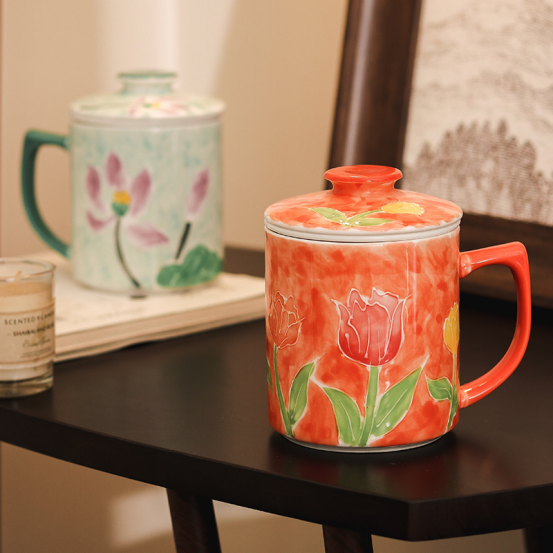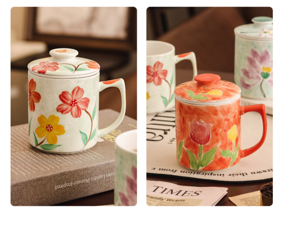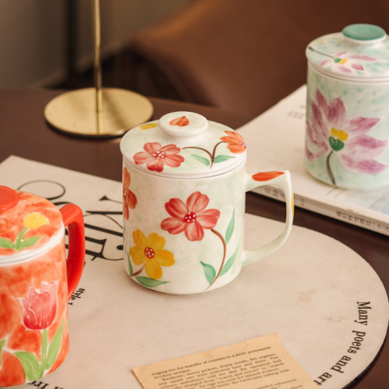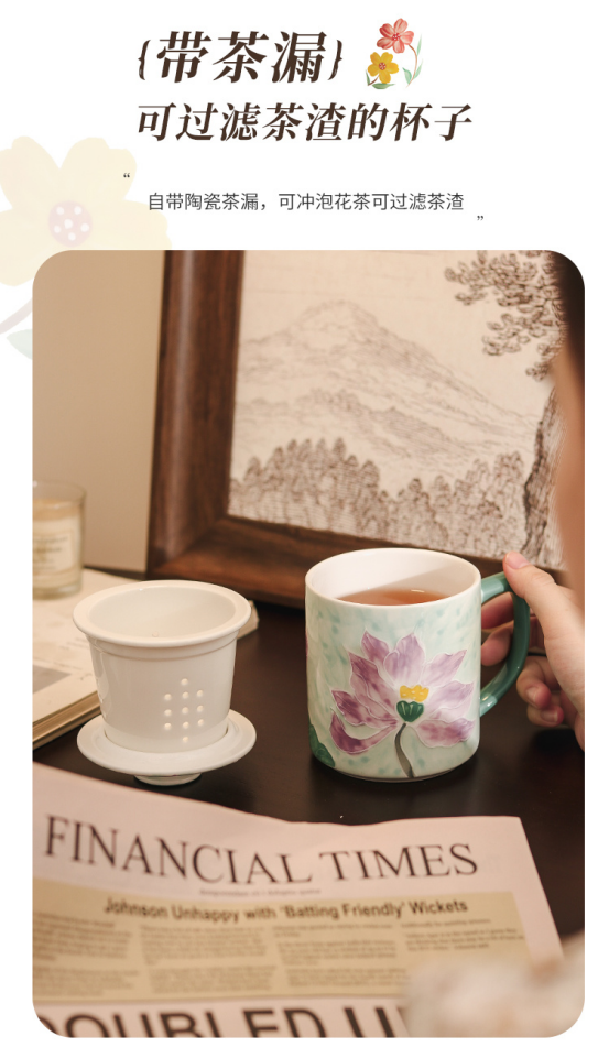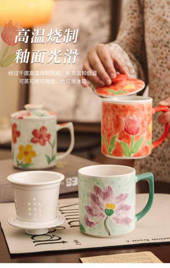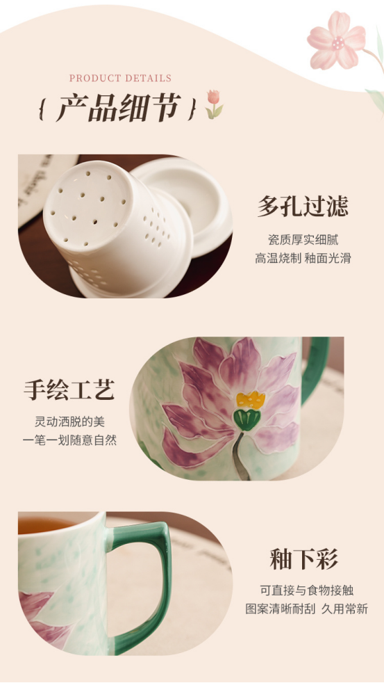 永远相信美好的事情即将发生 满足全部喝水需求的办公杯~~~ 羊脂玉材质细腻,花色清新淡雅 自带过滤内胆,自由控制茶汤浓淡,实现茶水分离。 盖子可以倒扣用来放置过滤,不用担心滴落茶水。 一只高颜值的办公杯,可以提升办公幸福感~~~ 容量550毫升,大口径大容量 满足整天的喝水需求 因为忙起来,真的连倒水的时间都没有~~~ 作为老师,更是每天讲课口干舌燥的,泡上一杯花茶,上一节课回到办公室,咕噜咕噜,一大杯花茶下去,真的太爽了 每天老师喝水的时候,都会看到这个精美实用的杯子,感受到送礼人满满的心意!!!