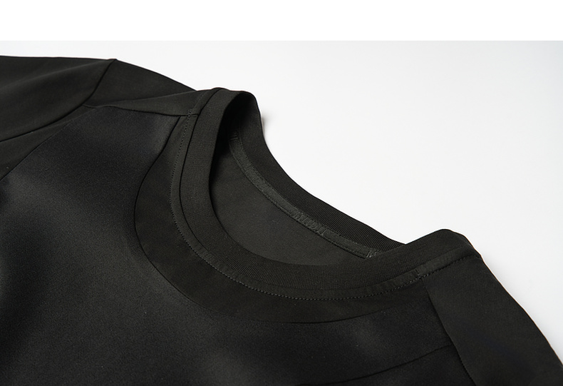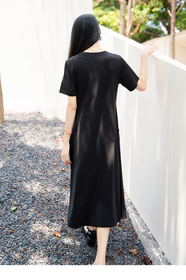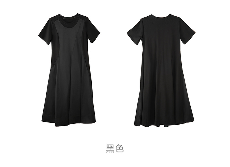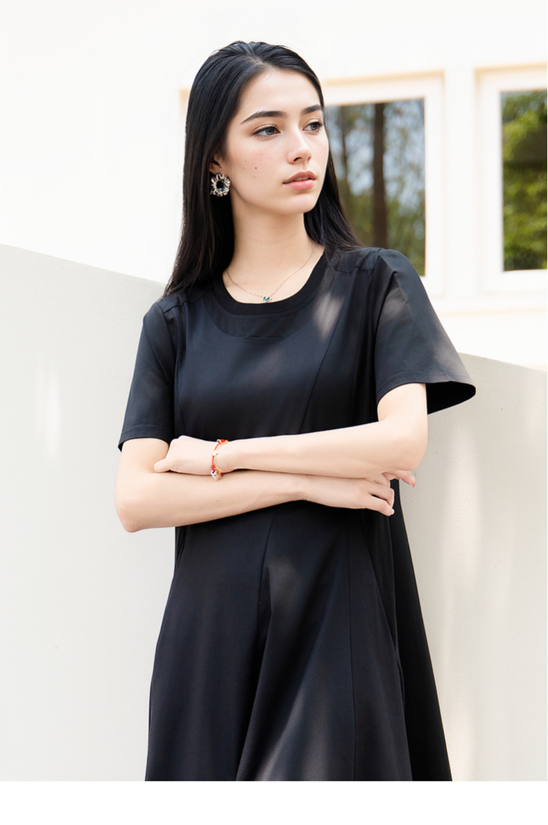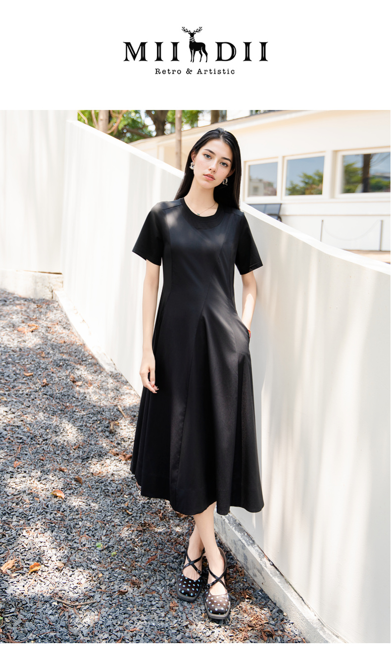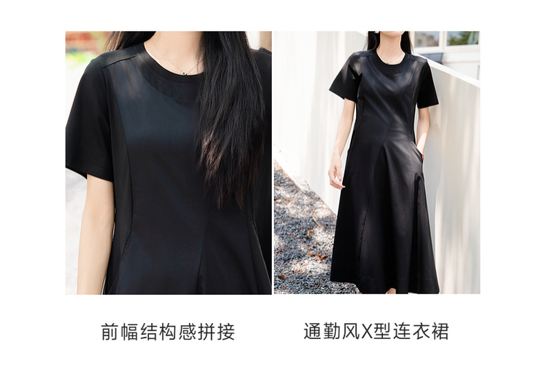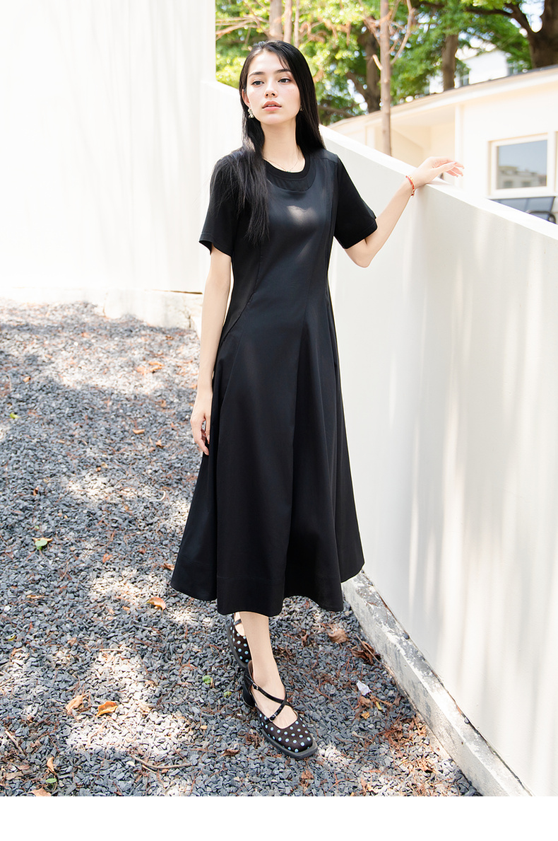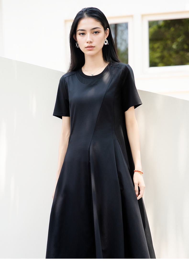谜底黑色连衣裙短袖2025秋款简约风圆领拼接长裙大摆裙25CML5001