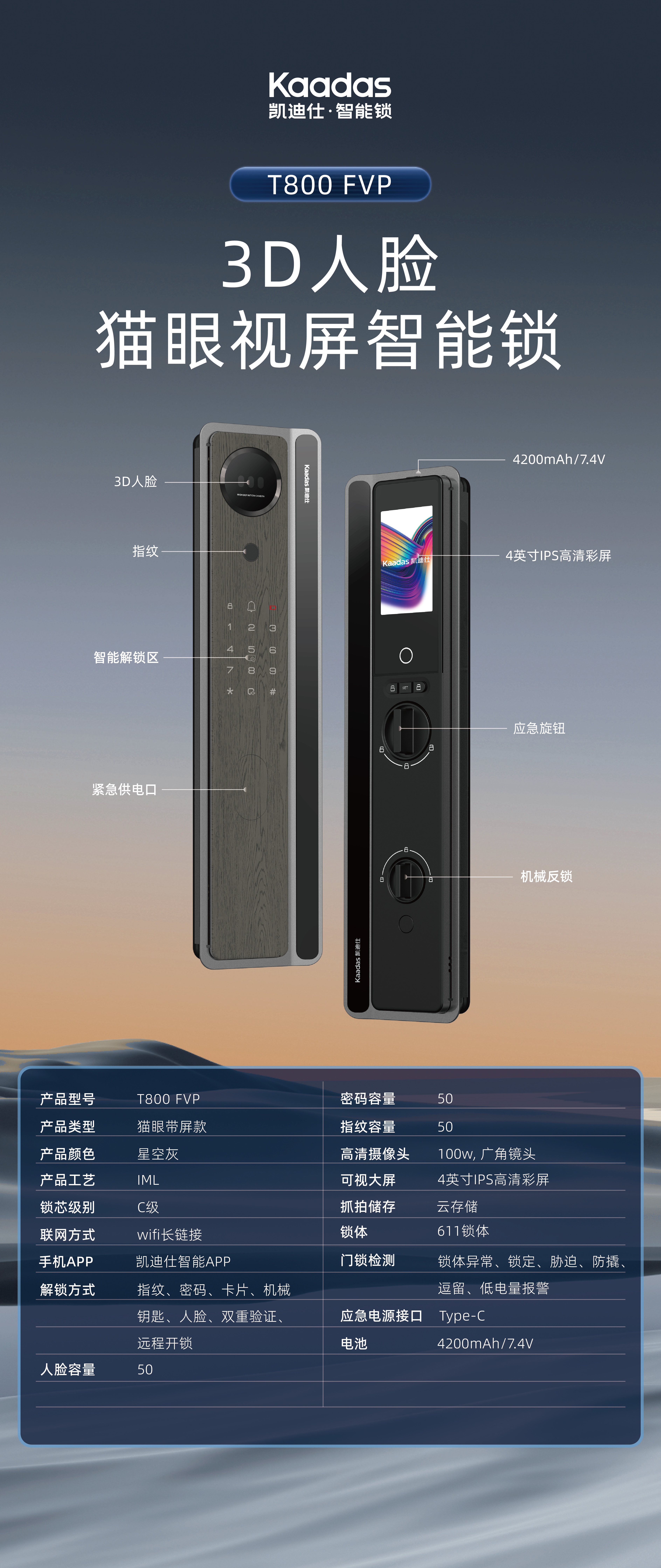 凯迪仕T800FVP 智能锁【春季焕新】3D人脸大屏猫眼远程监控智能锁 密码锁 指纹锁 【3D人脸+哨兵猫眼+室内大屏】 KDS