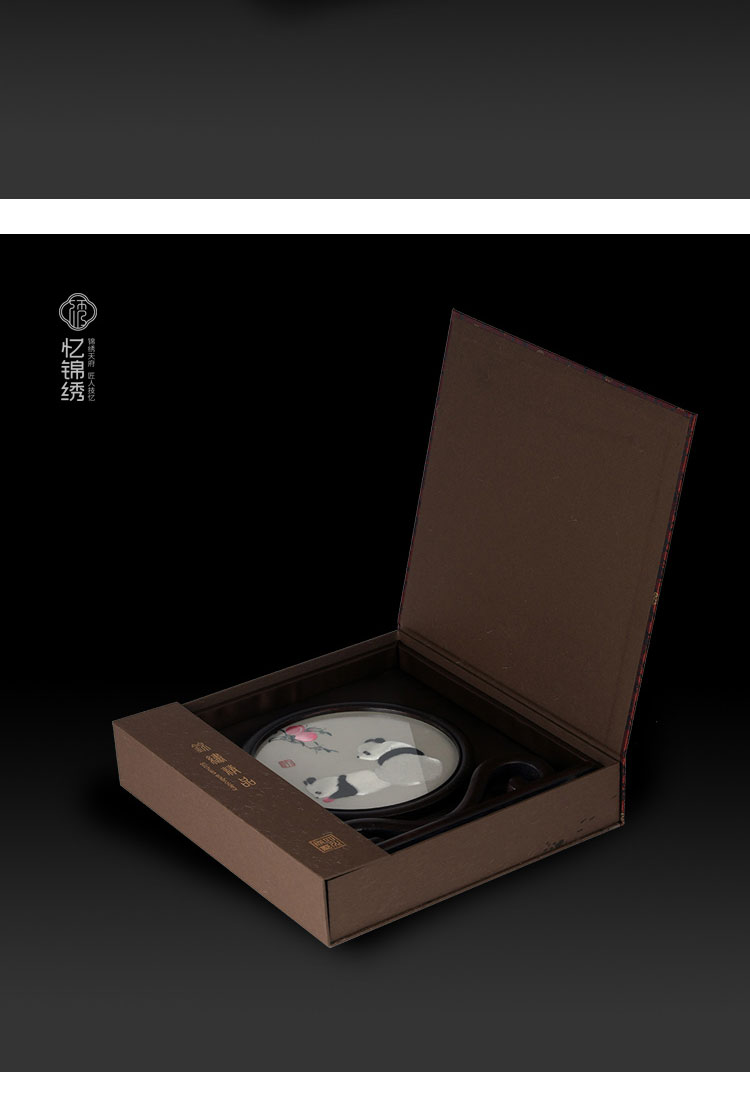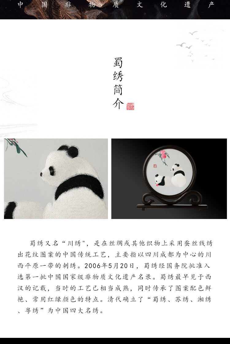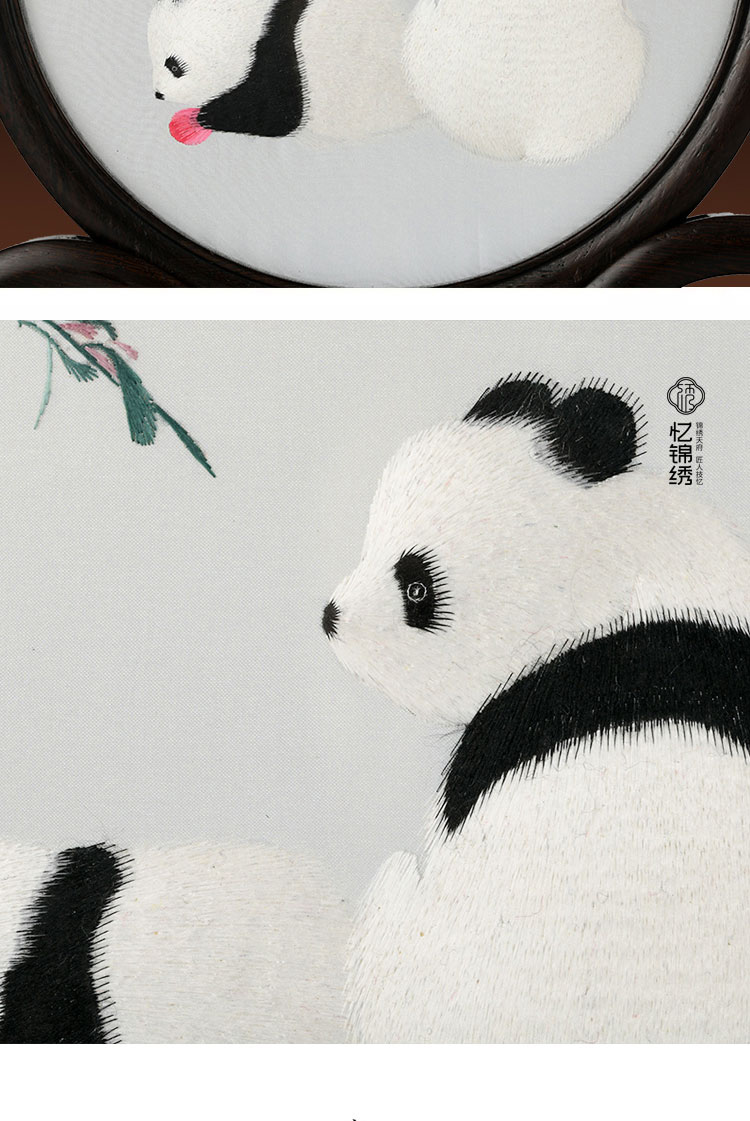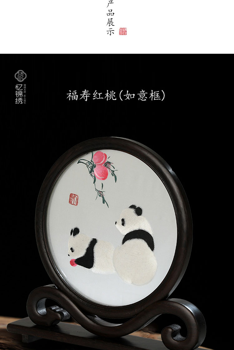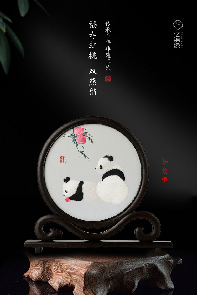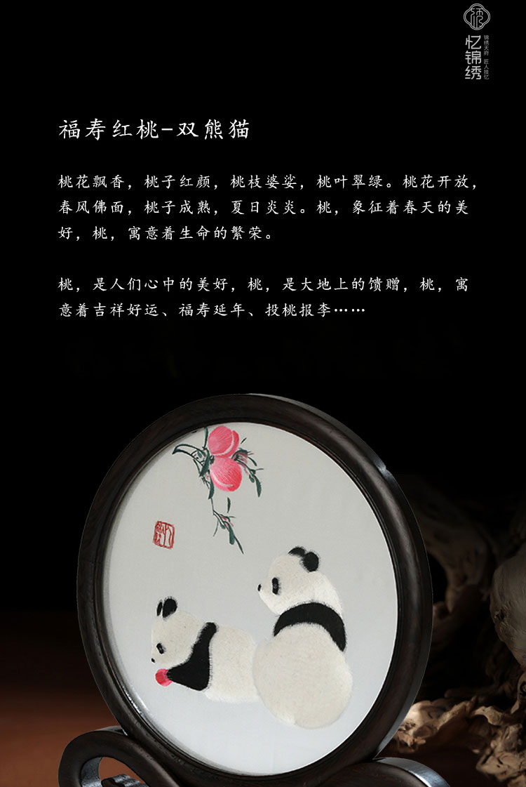 非遗手工工艺蜀绣福寿红桃双熊猫(如意框)