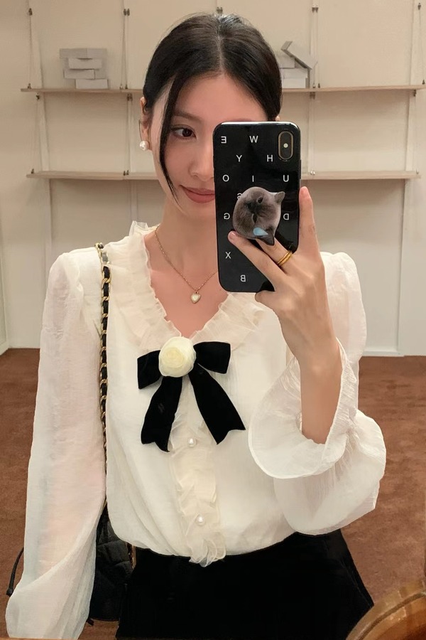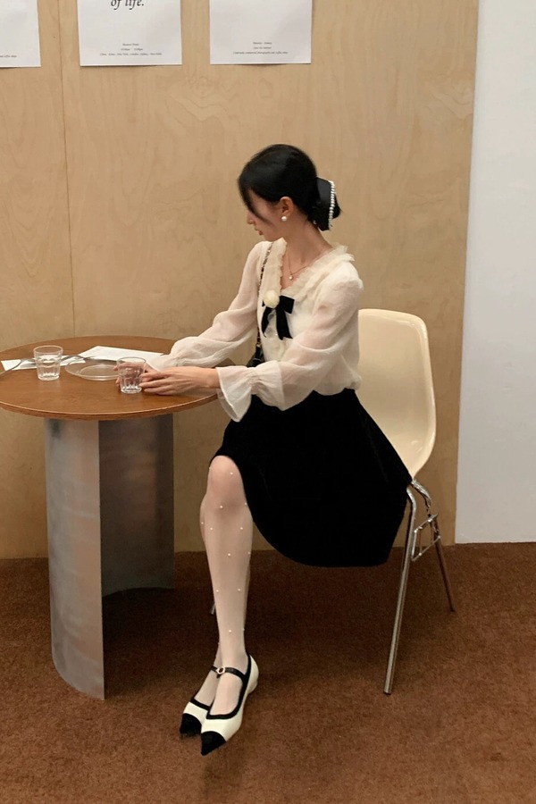 ELLA JADE 花边领米色领结饰半透明衬衣 19778