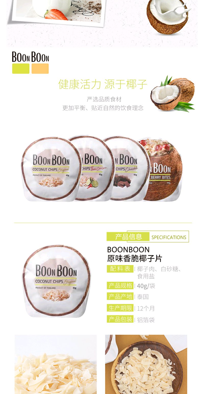 椰满满泰国进口椰子片休闲零食boonboon椰子脆片原味40g*2包巧克力40g*2包
