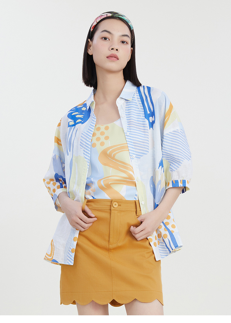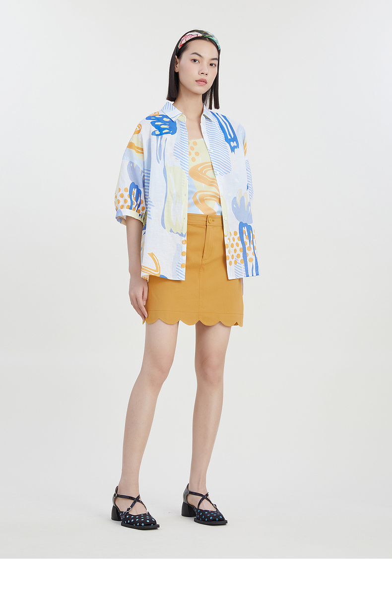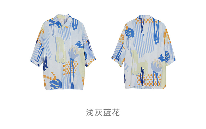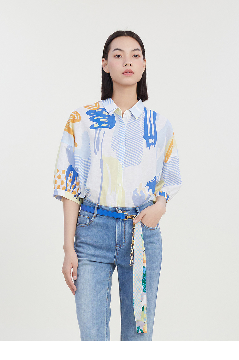 谜底复古抽象印花大廓形衬衫短袖女2023夏新款棉麻衬衣232MC0585