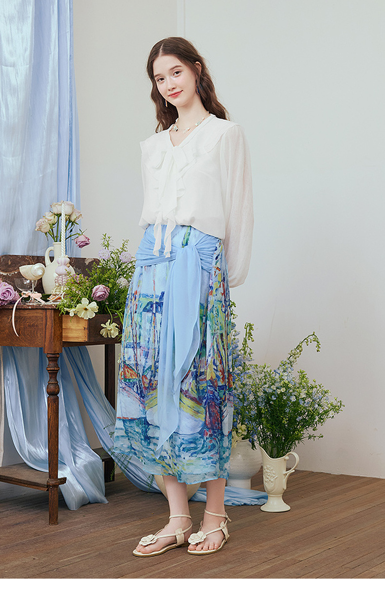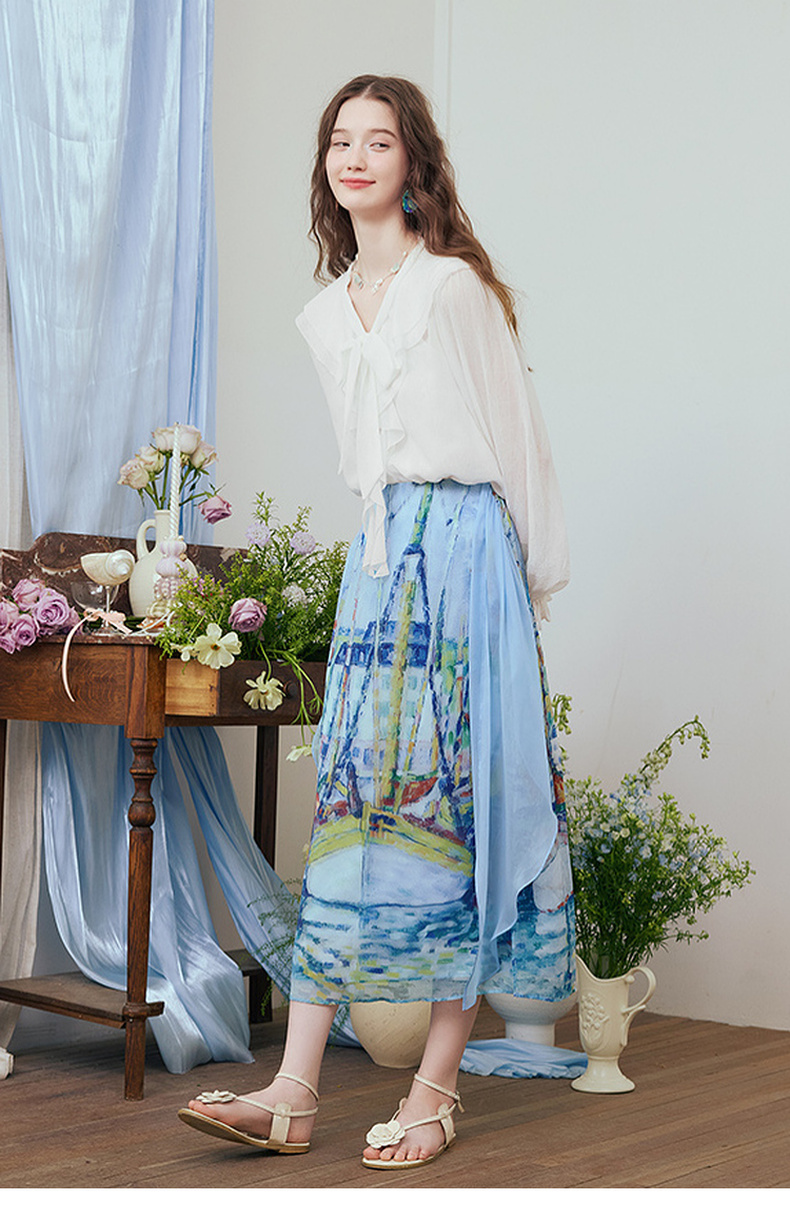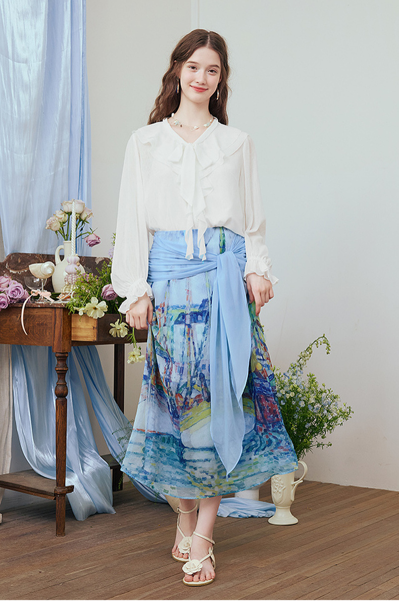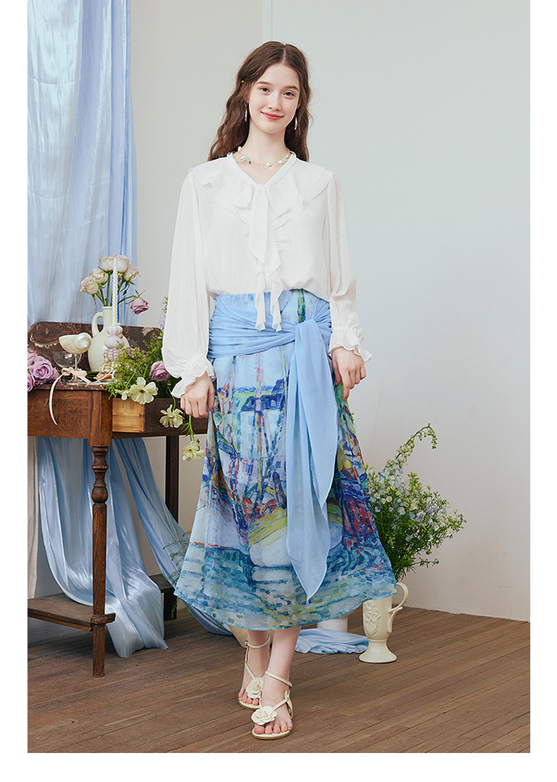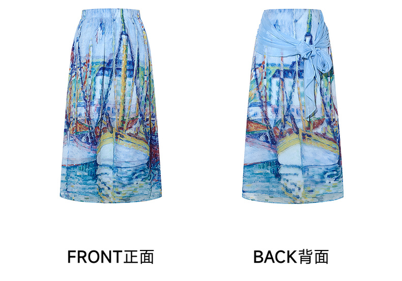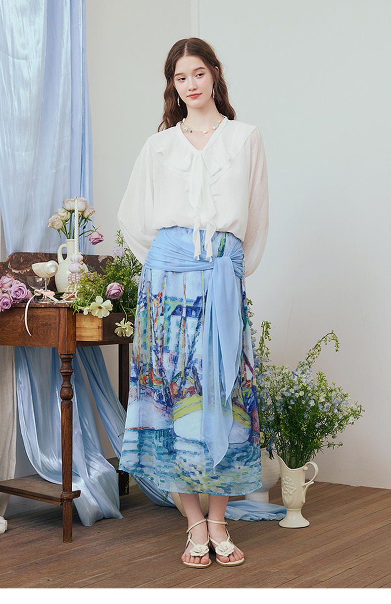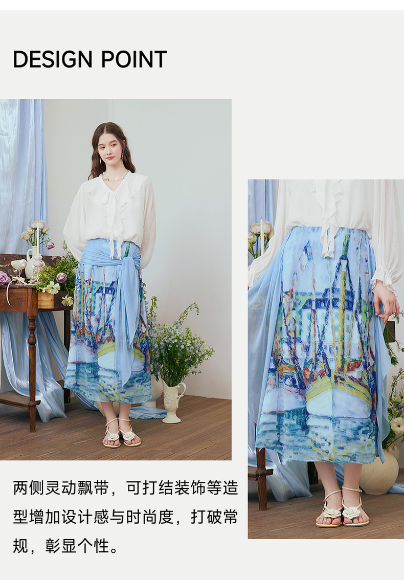 两三事 夏海潮生 2025夏季新款复古双层印花绑带高腰半身裙长裙