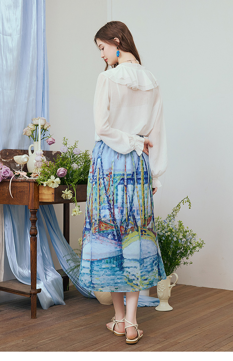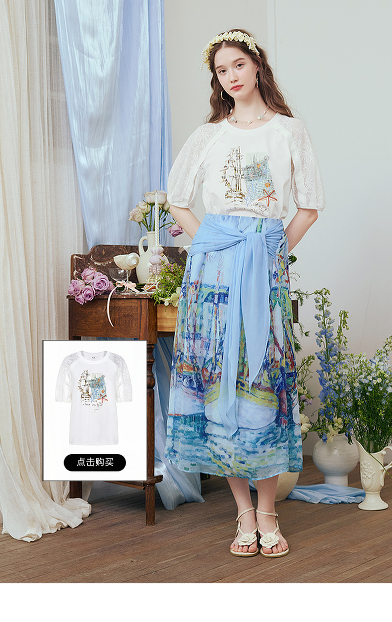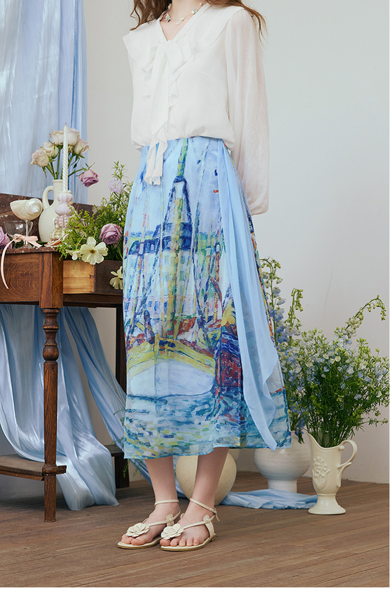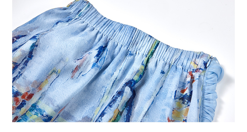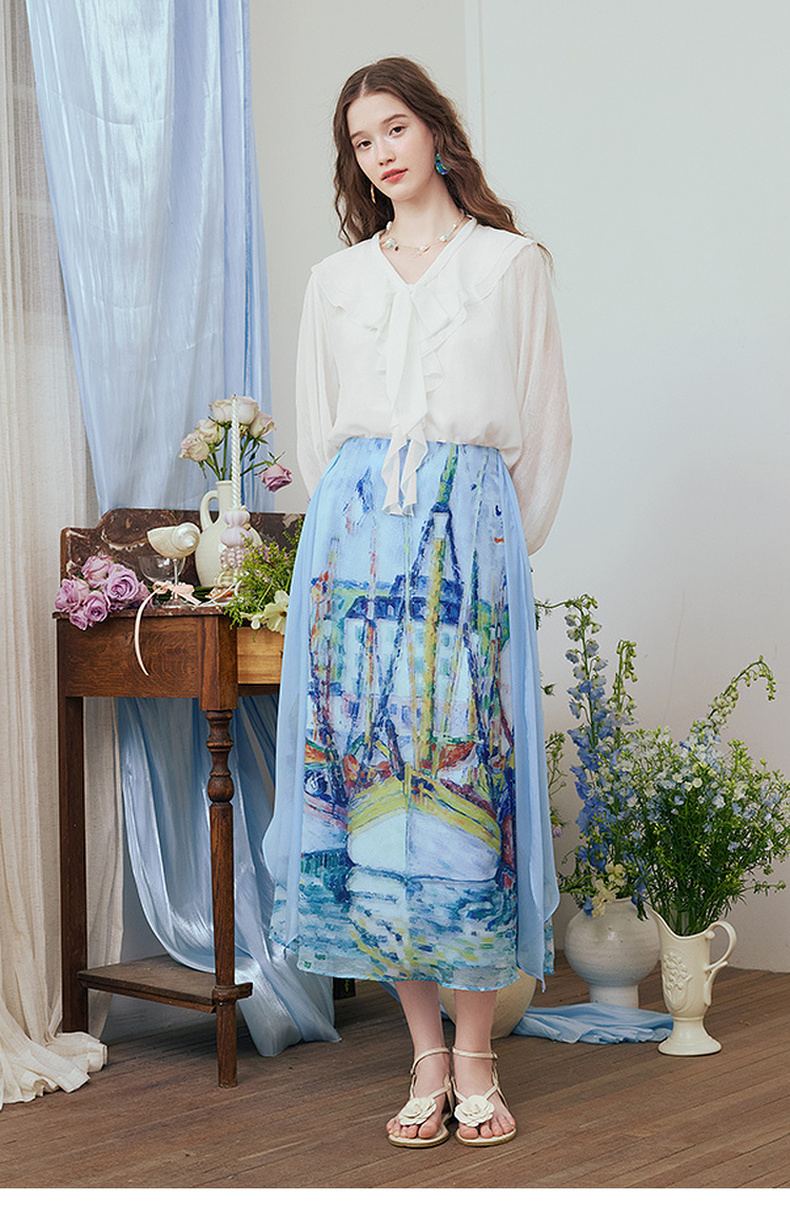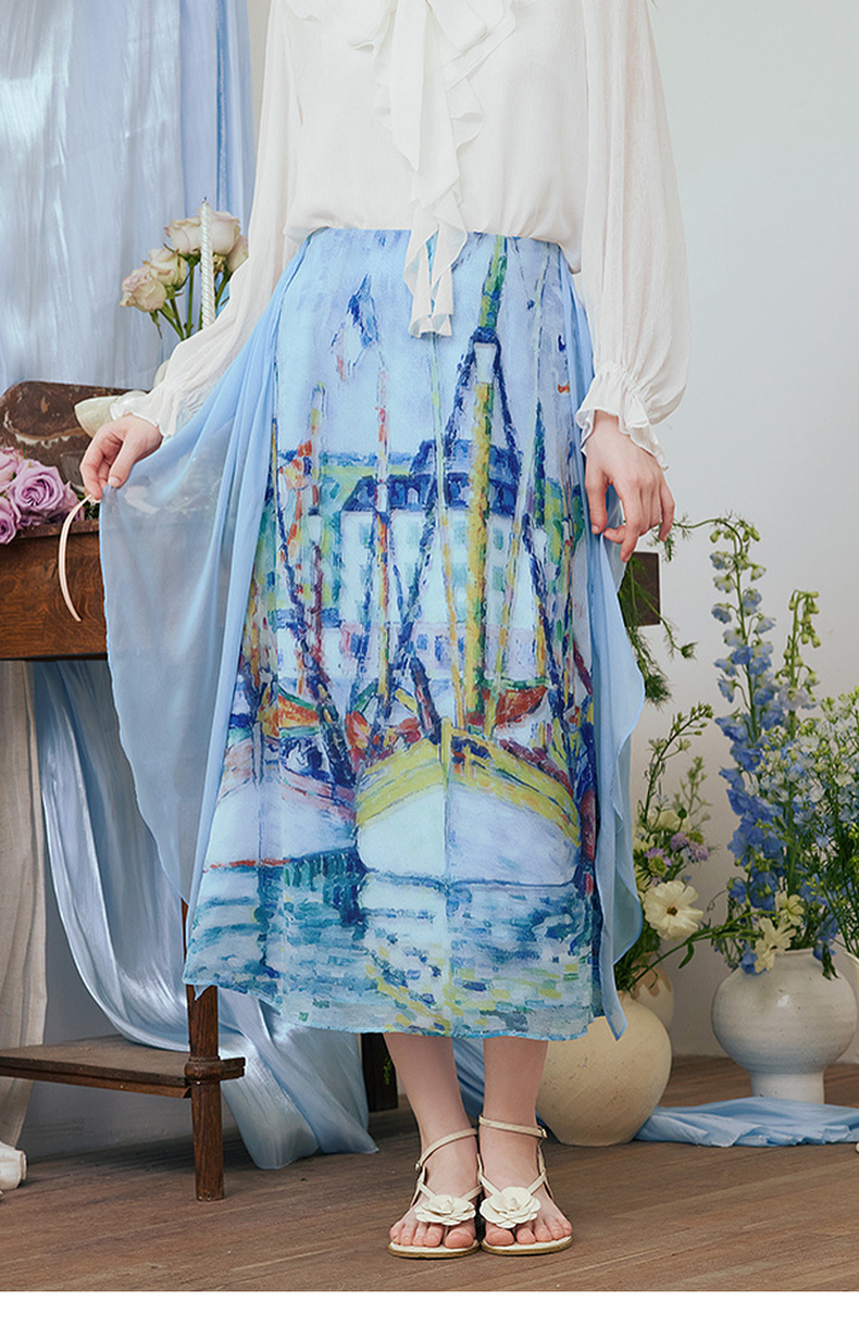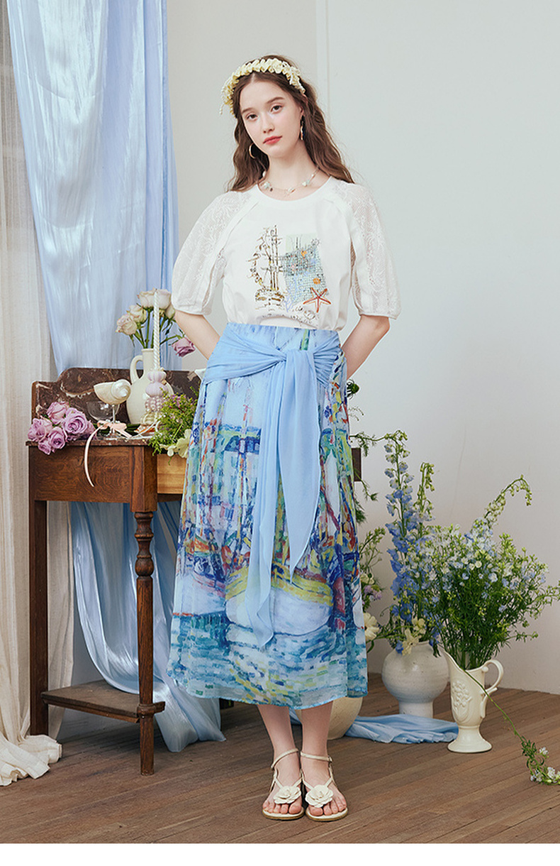 两三事 夏海潮生 2025夏季新款复古双层印花绑带高腰半身裙长裙