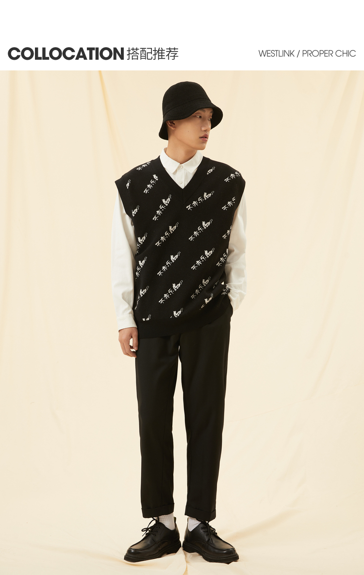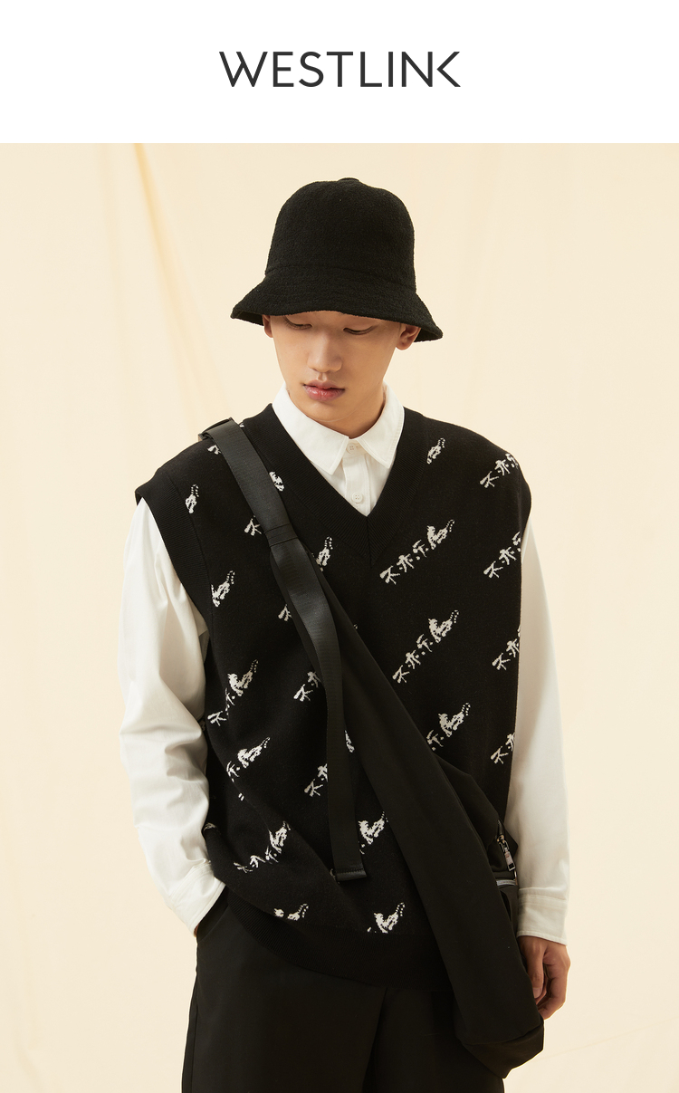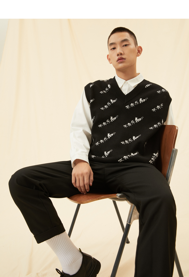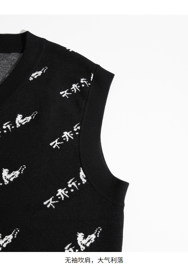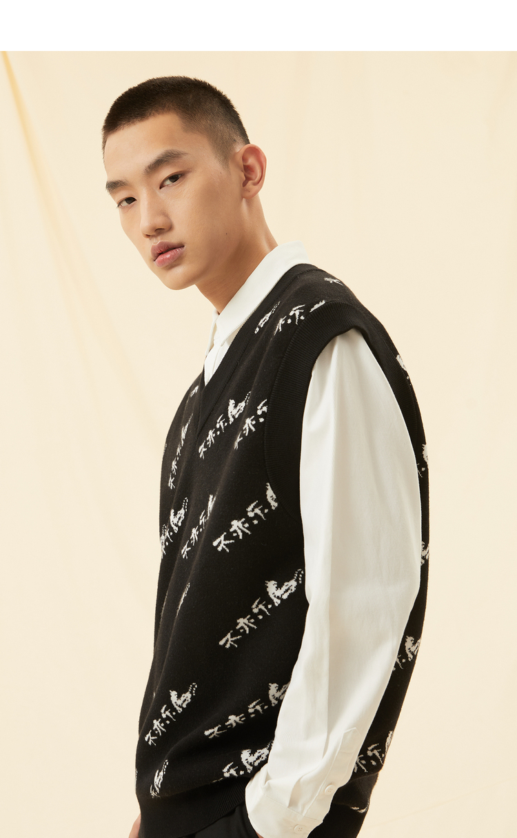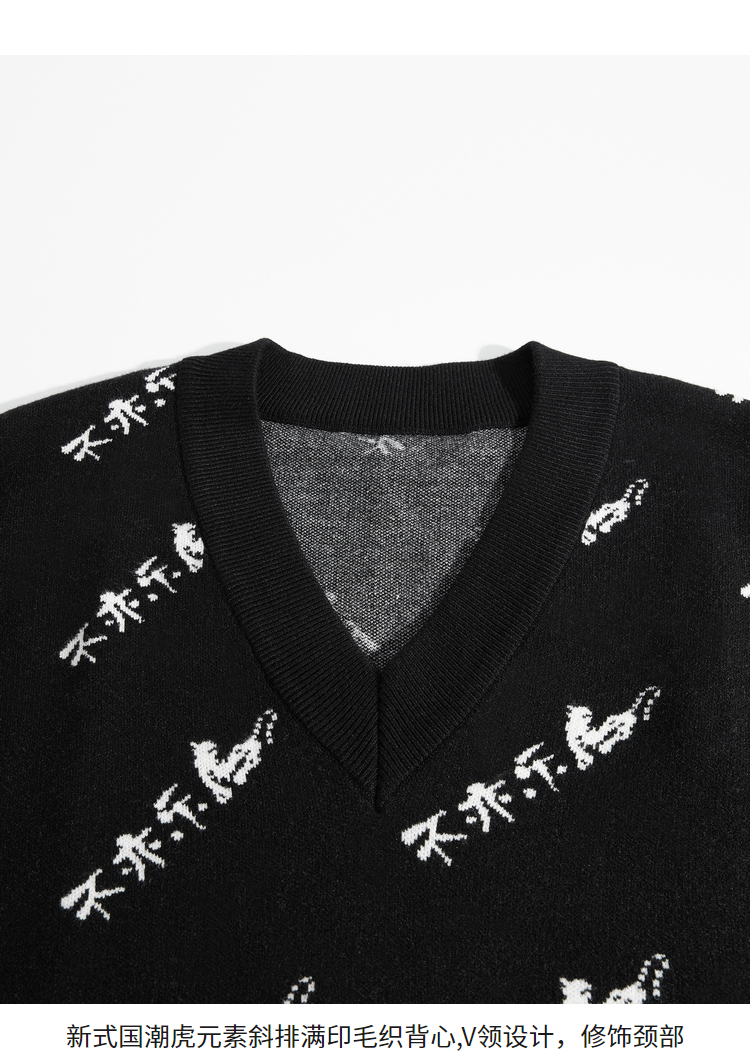 西遇V领毛衣背心男新款原宿风国潮虎针织马甲10122008
