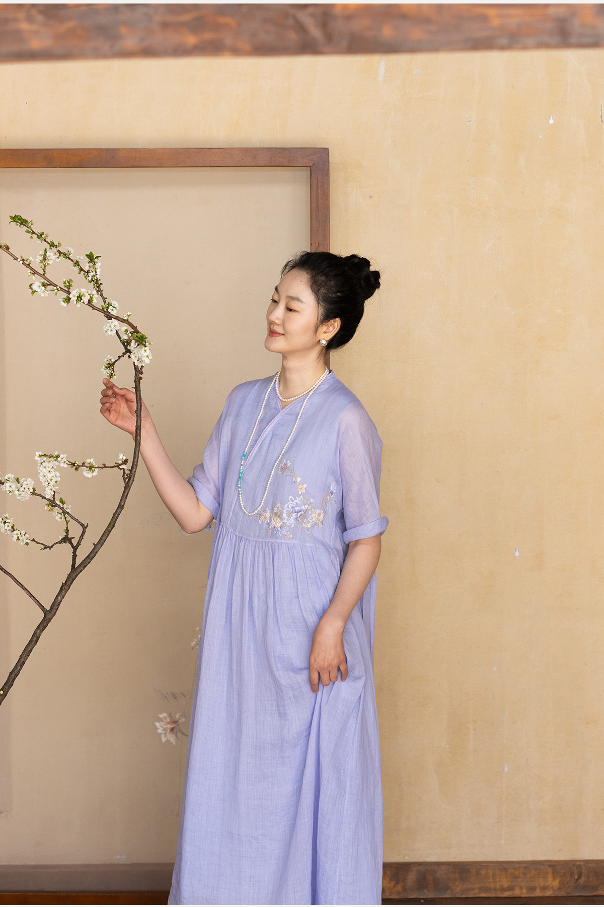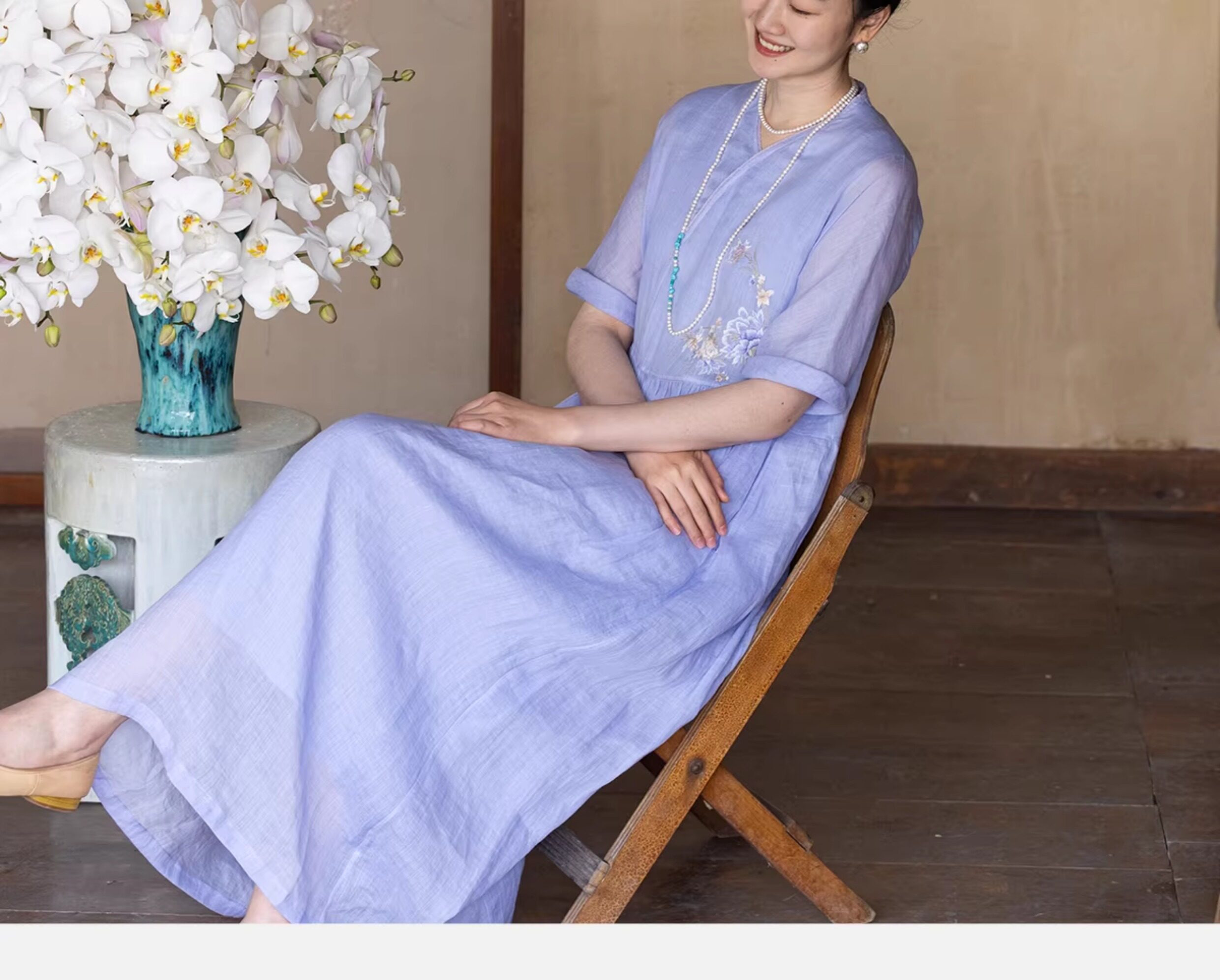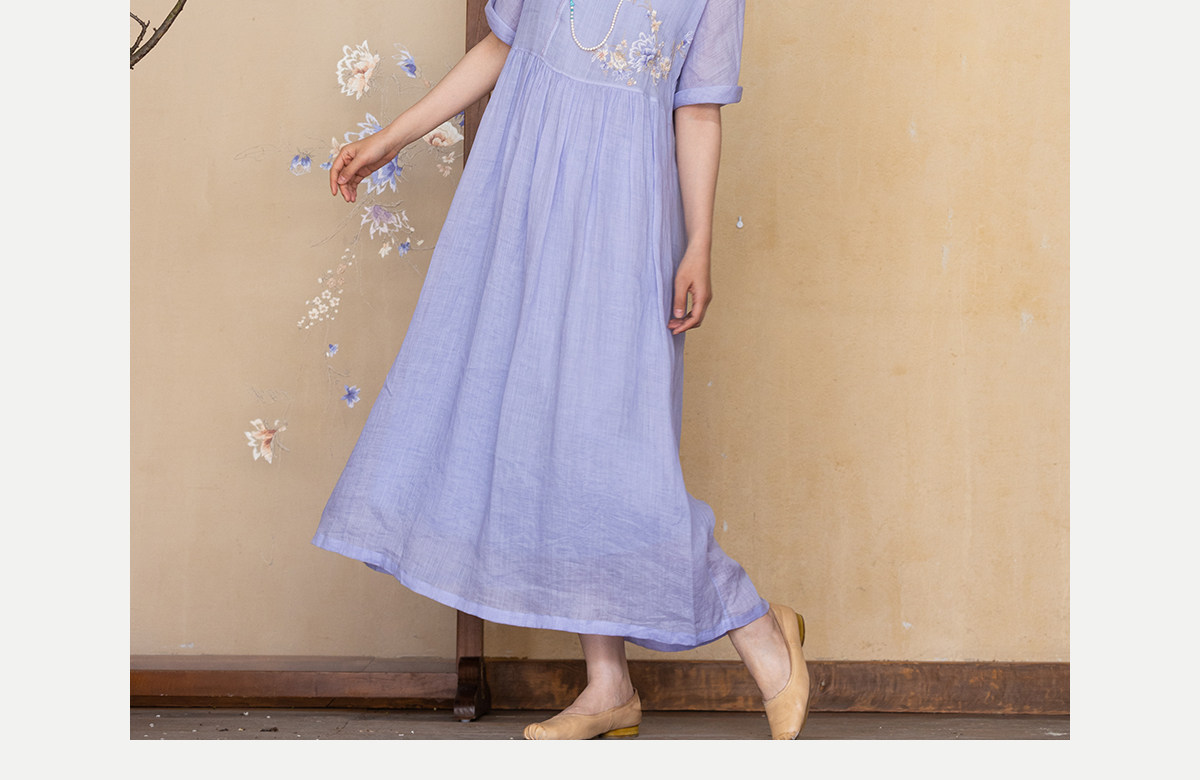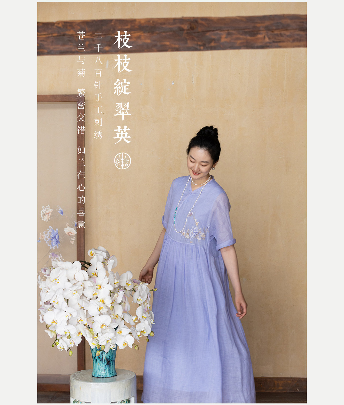 牧衣游原创 手工刺绣苎麻连衣裙女新款宽松轻薄古朴文艺长裙 云肆