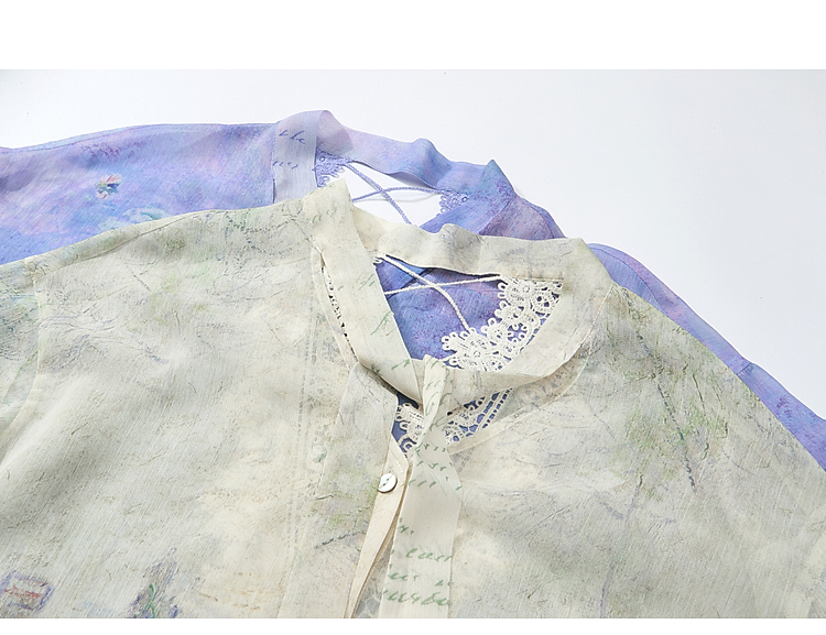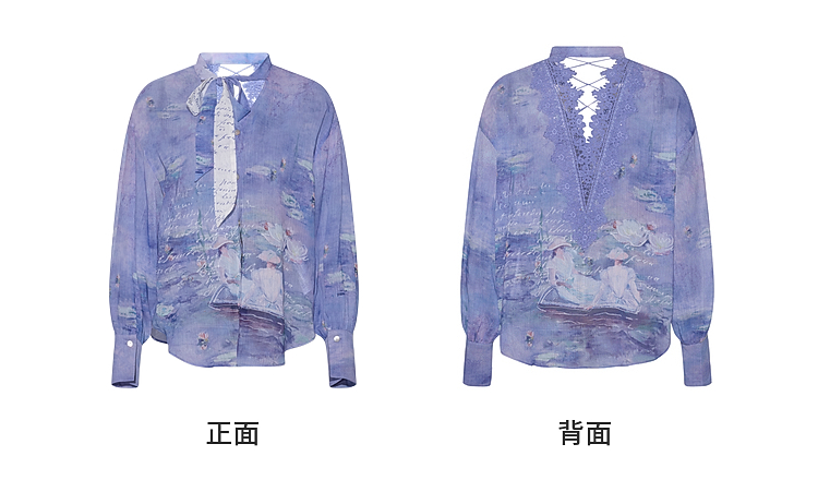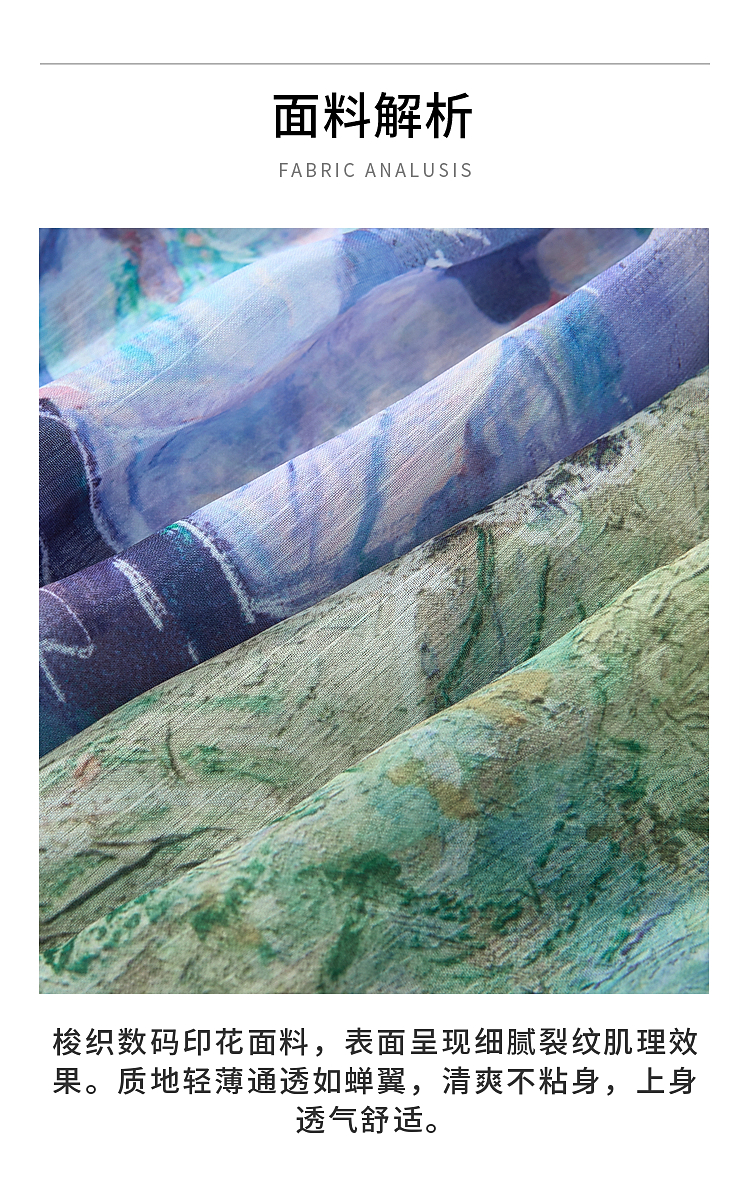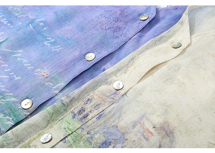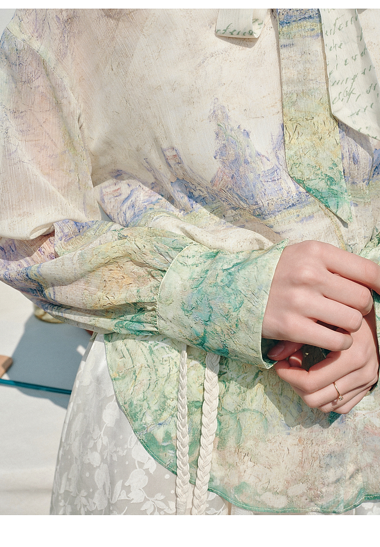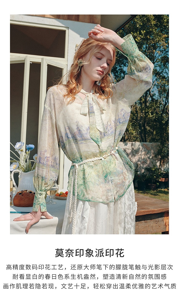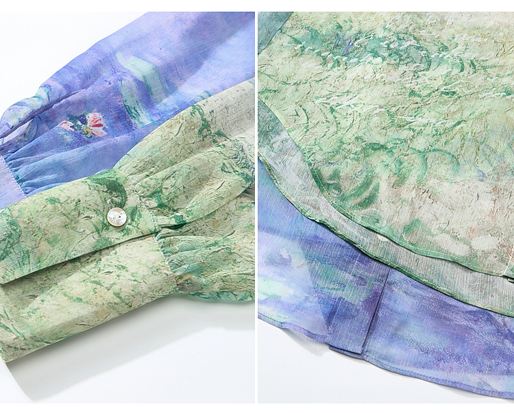 两三事梵高艺术花也谈情夏季压褶拼接印花两面穿雪纺衫女