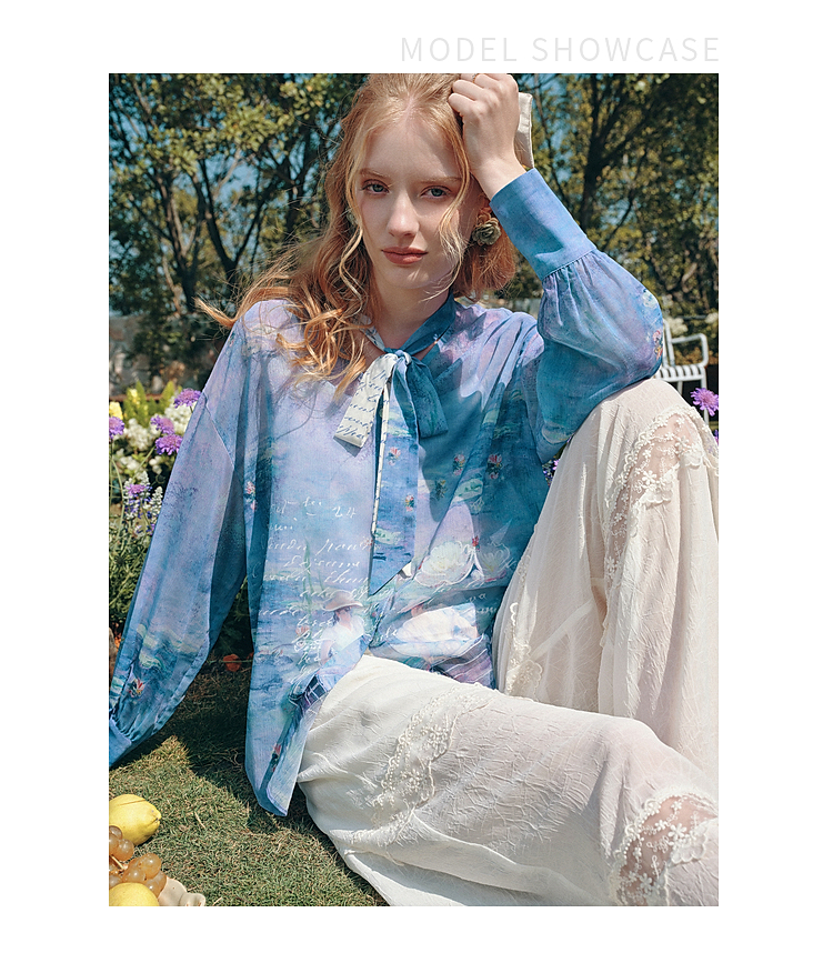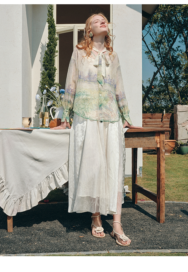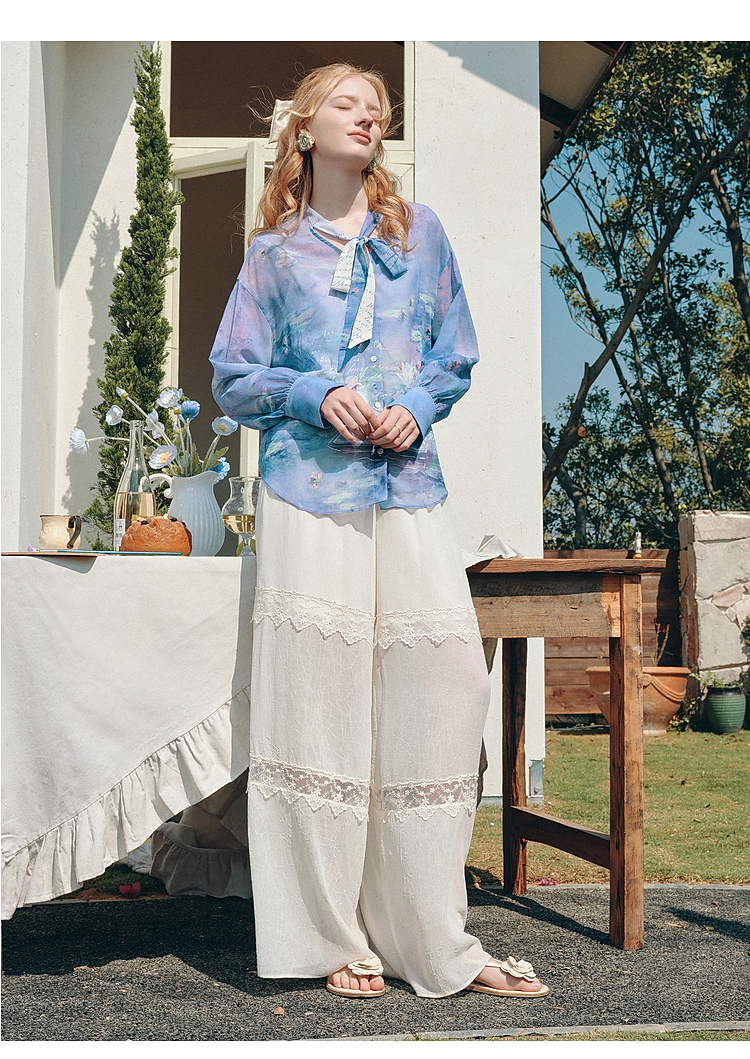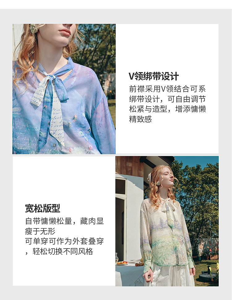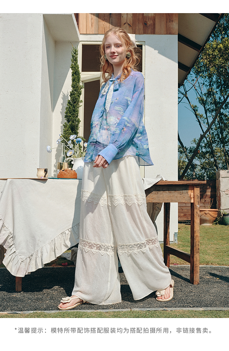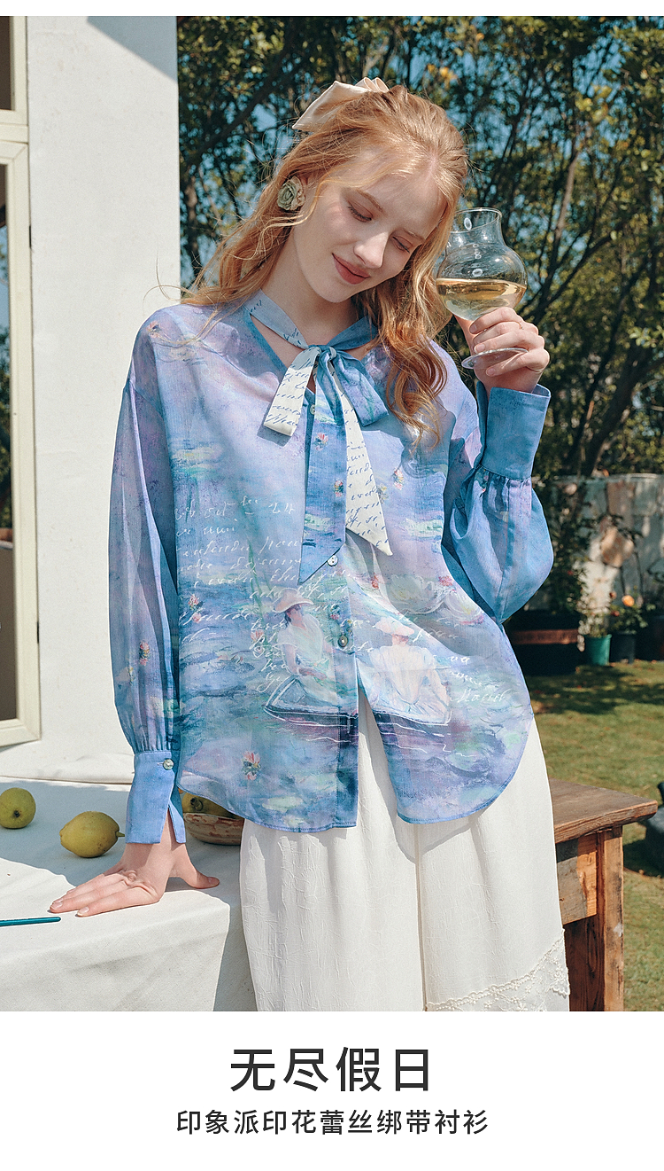 两三事 无尽假日 2026春季新款温柔风印花蕾丝拼接绑带长袖衬衫女