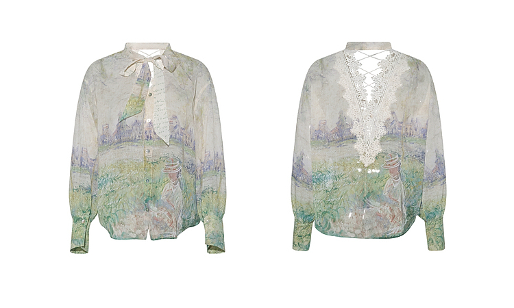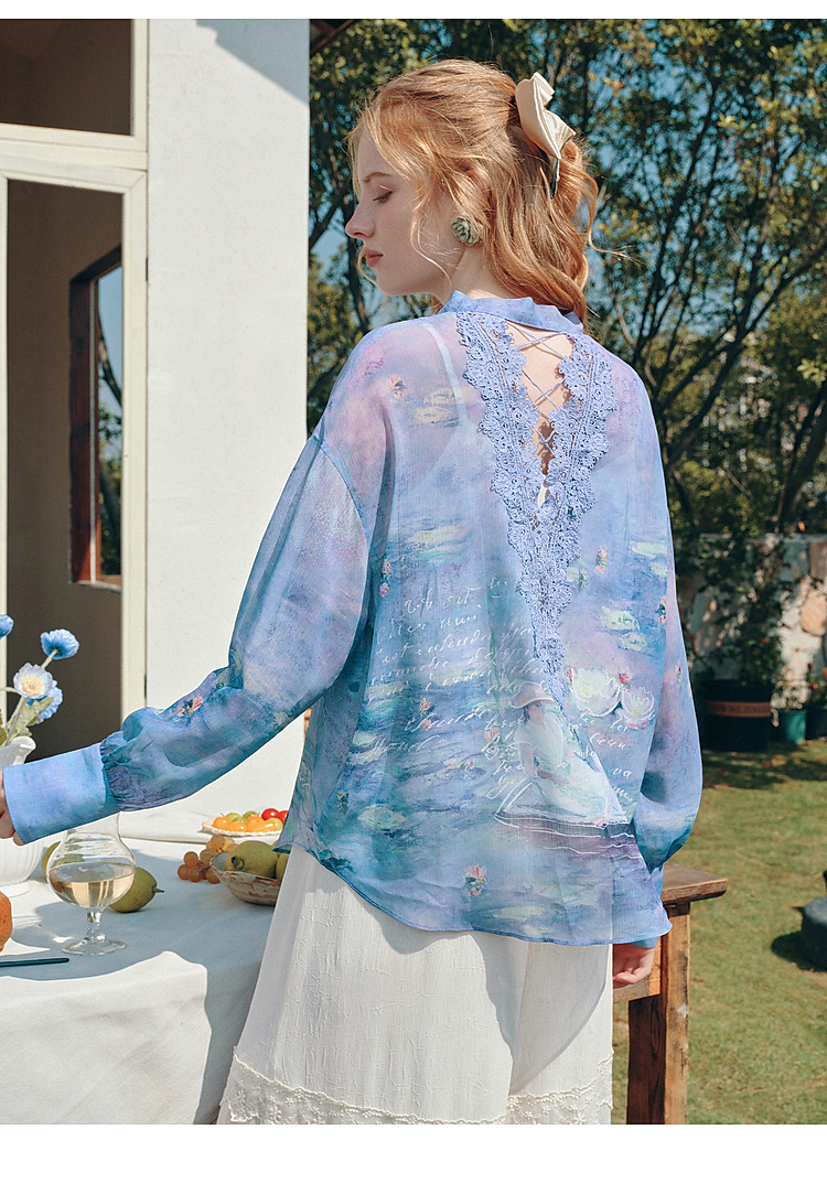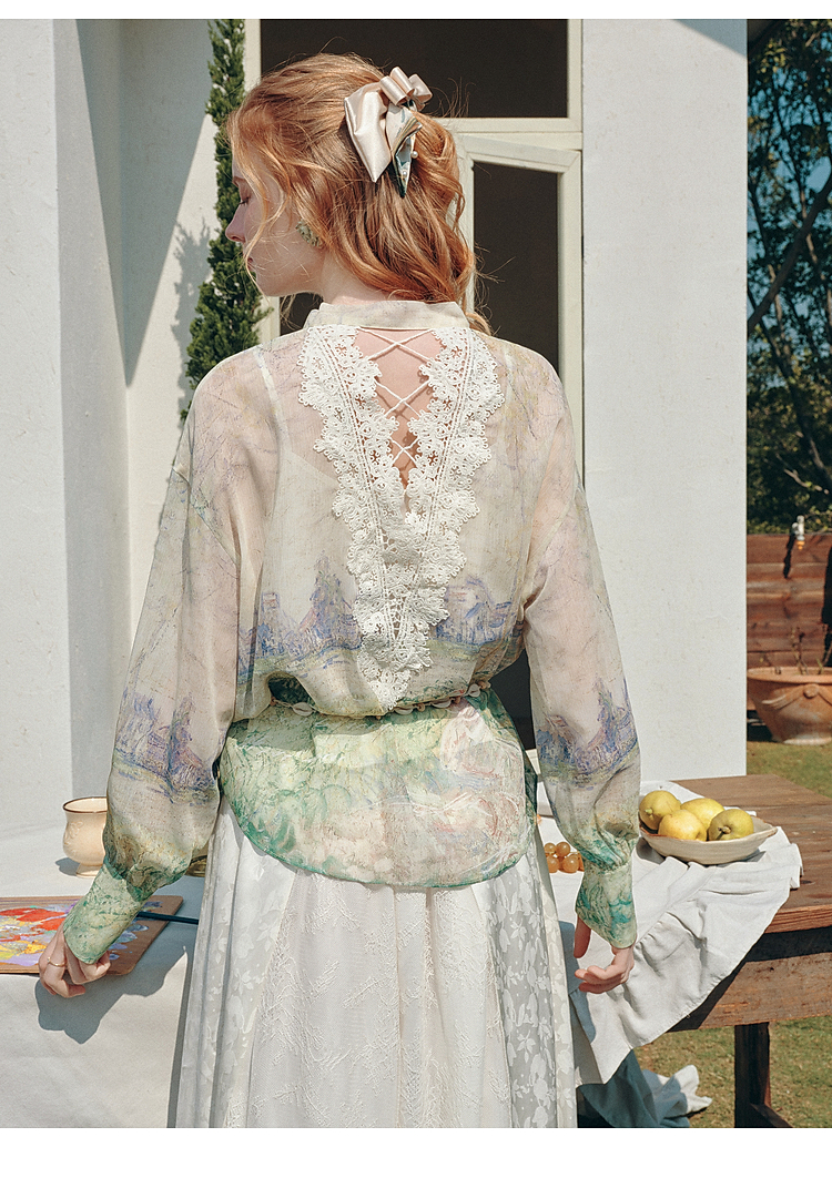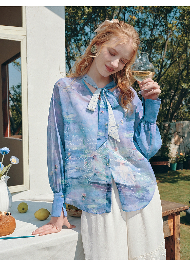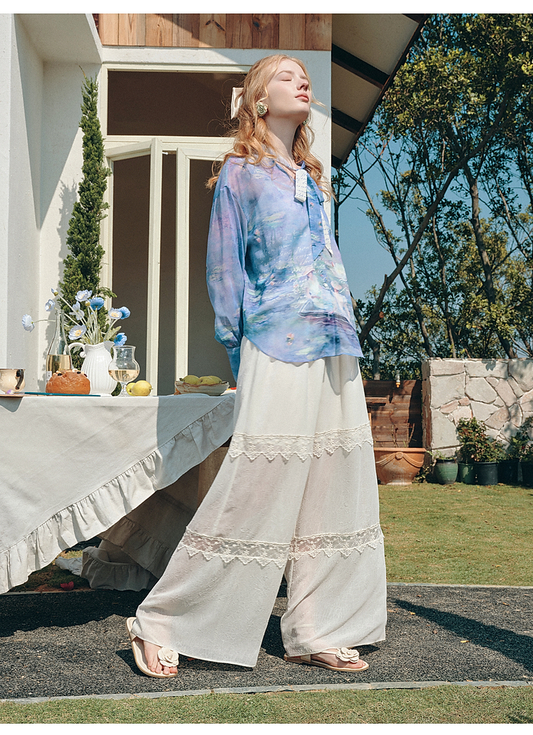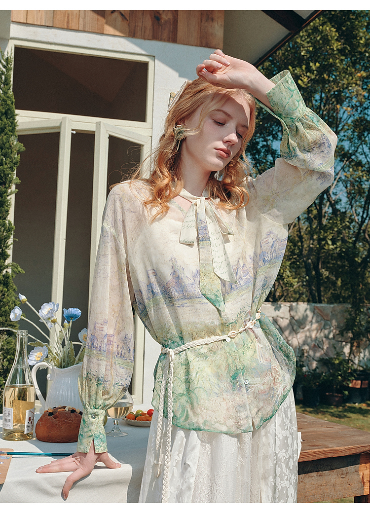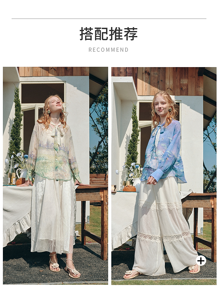 两三事 无尽假日 2026春季新款温柔风印花蕾丝拼接绑带长袖衬衫女
