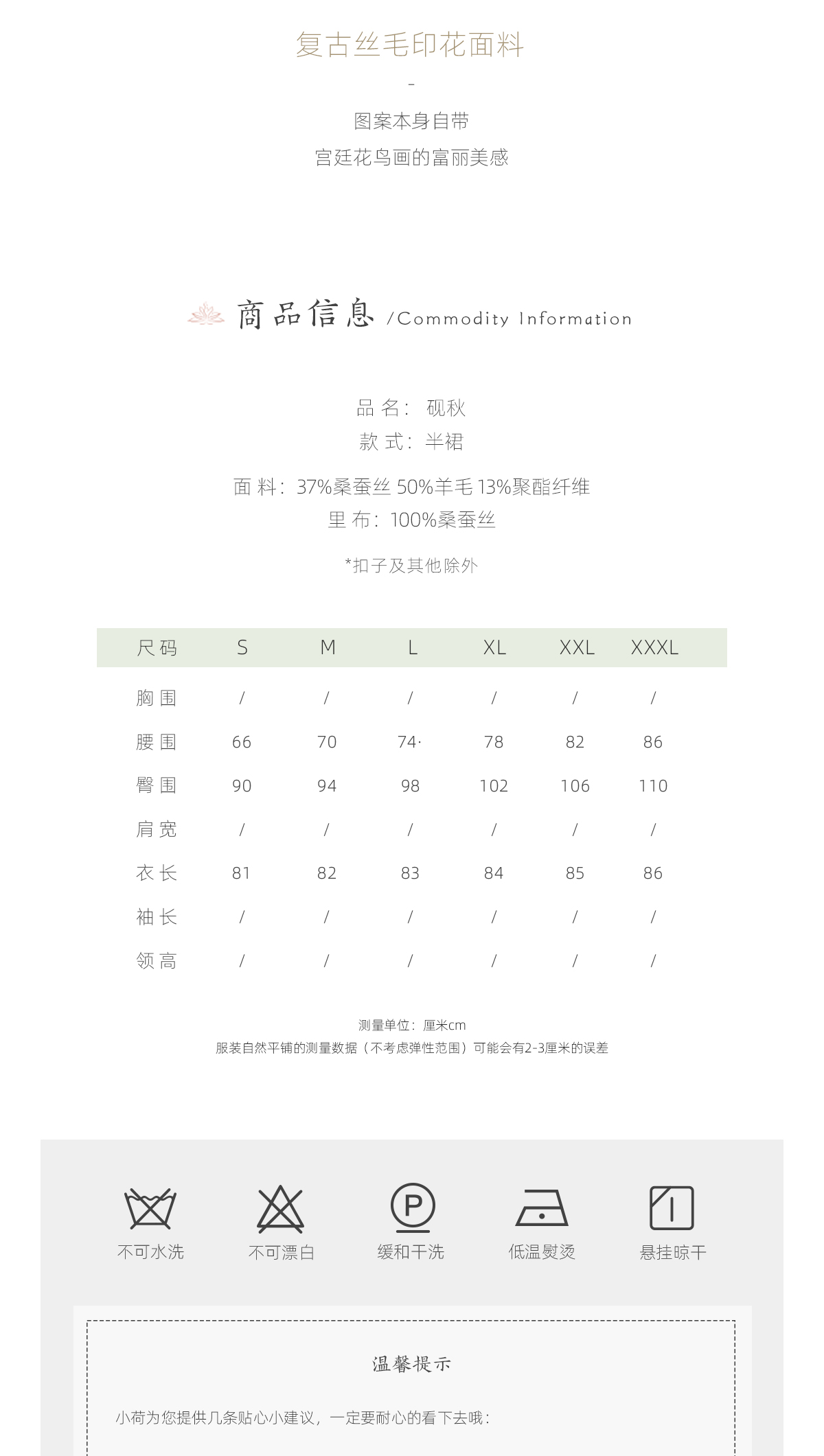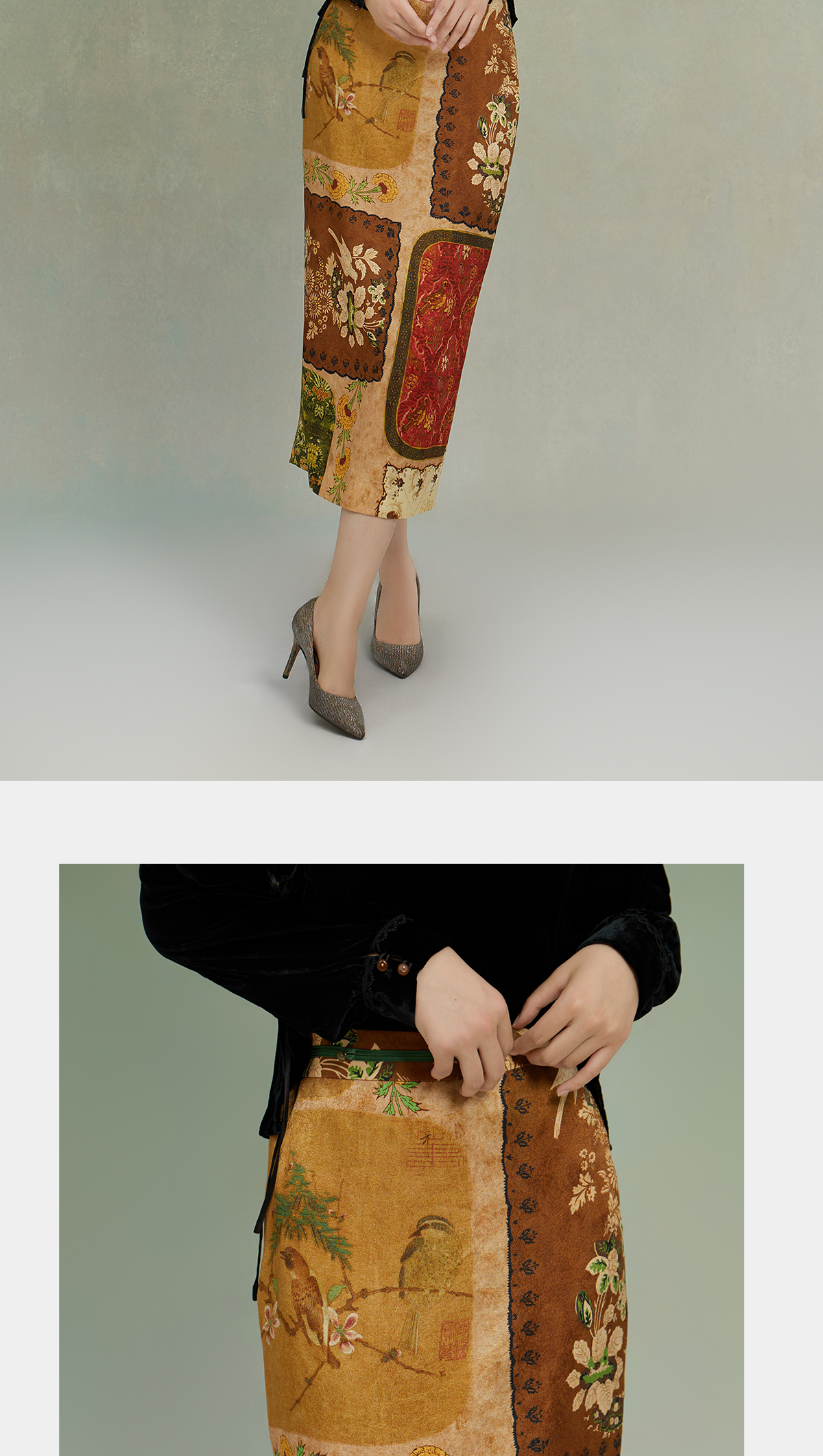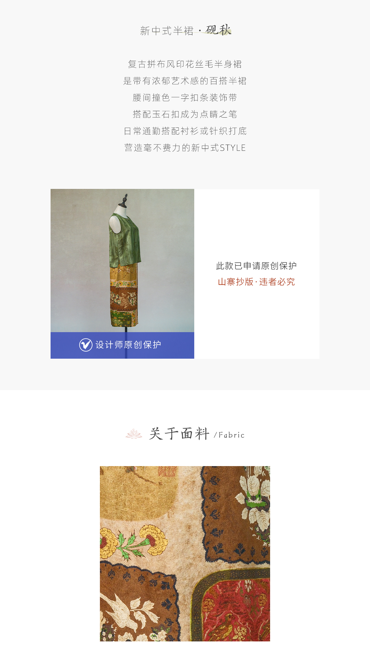 荷言GL 砚秋 复古丝毛印花半裙百搭拼布风柔爽舒适