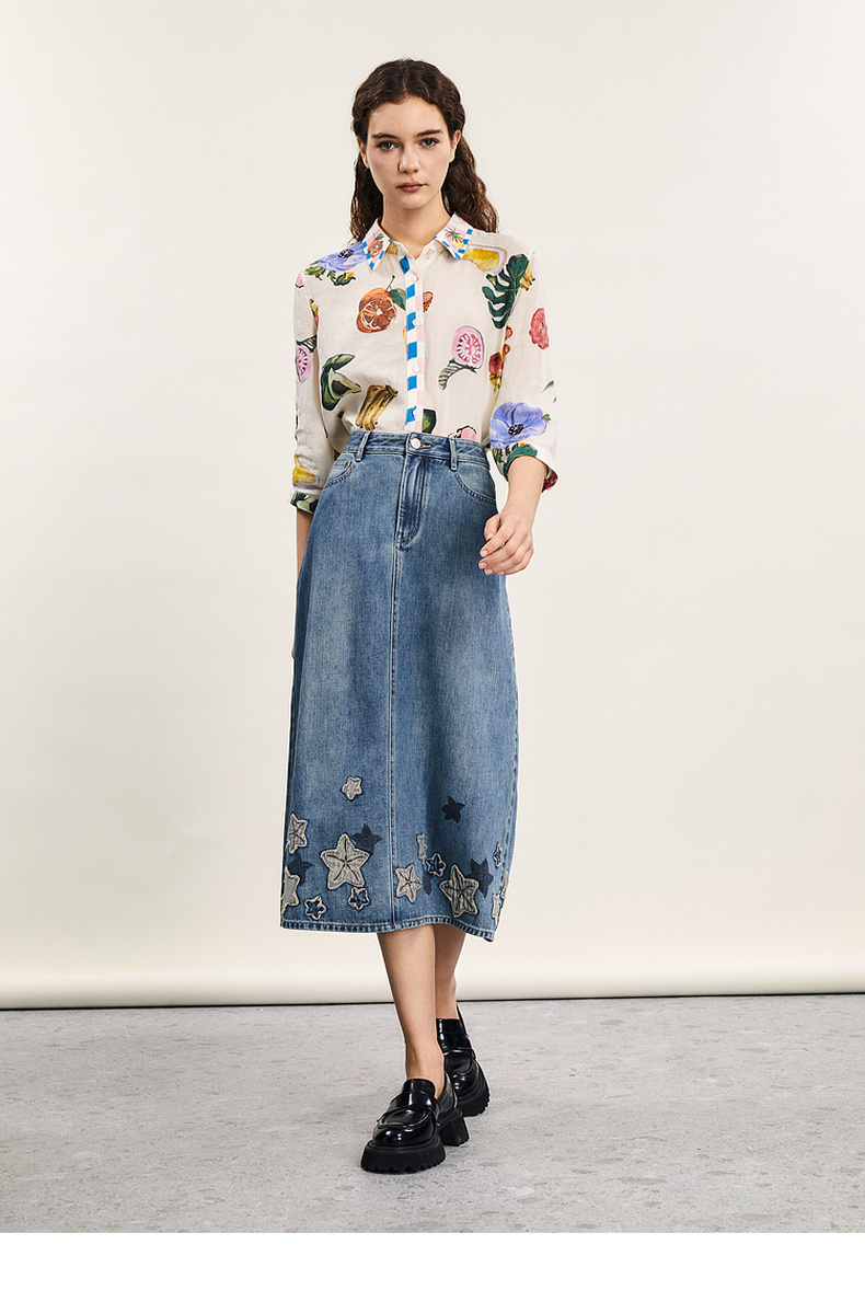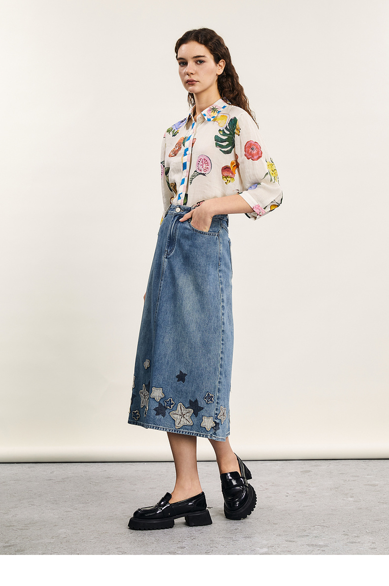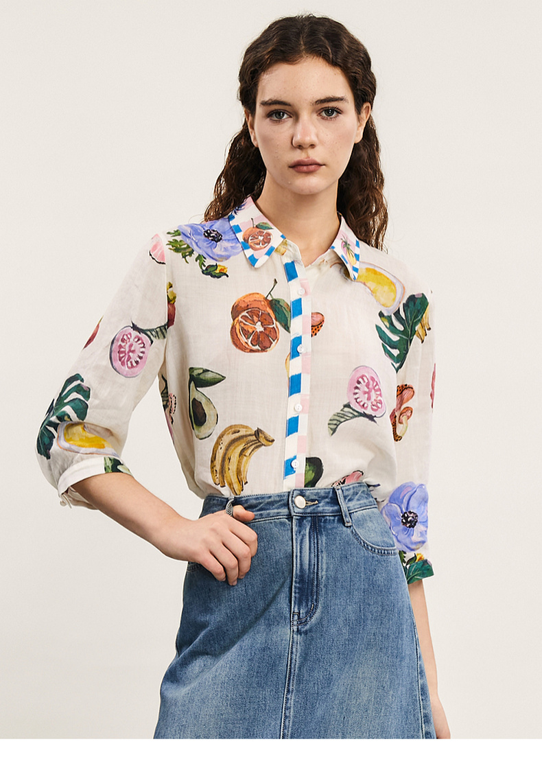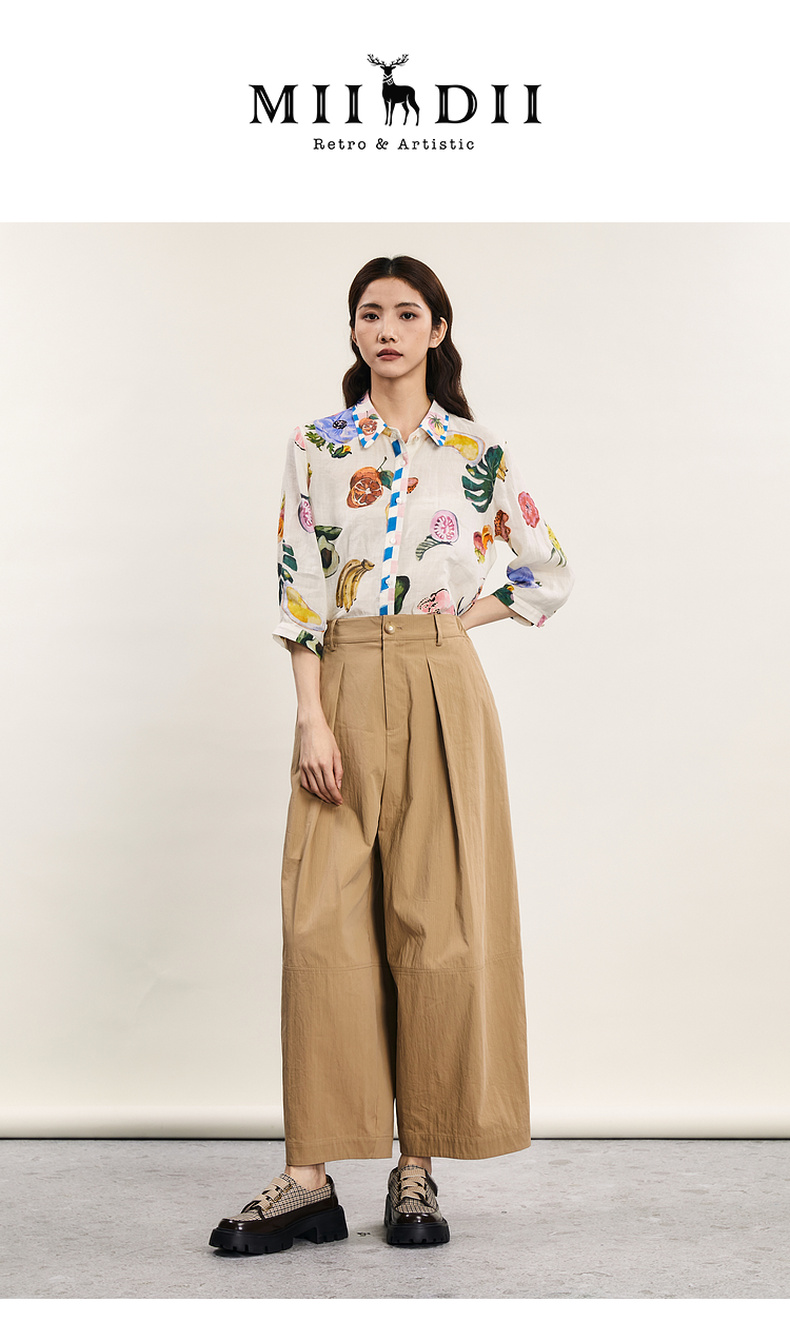 谜底花色衬衫七分袖女2024年夏款复古优雅苎麻透气衬衣242MC0537