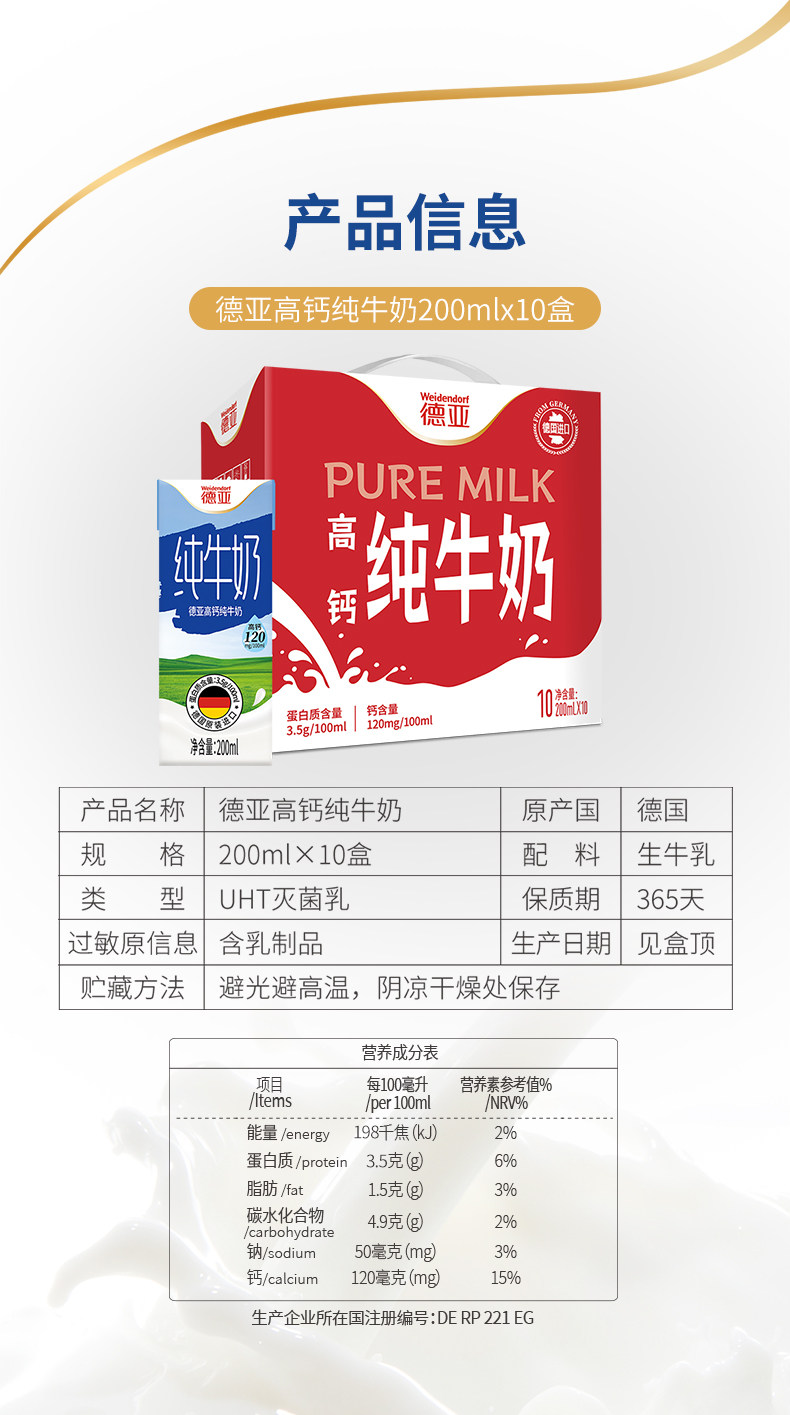 200ml*10德亚高钙纯牛奶 原生高钙 营养美味