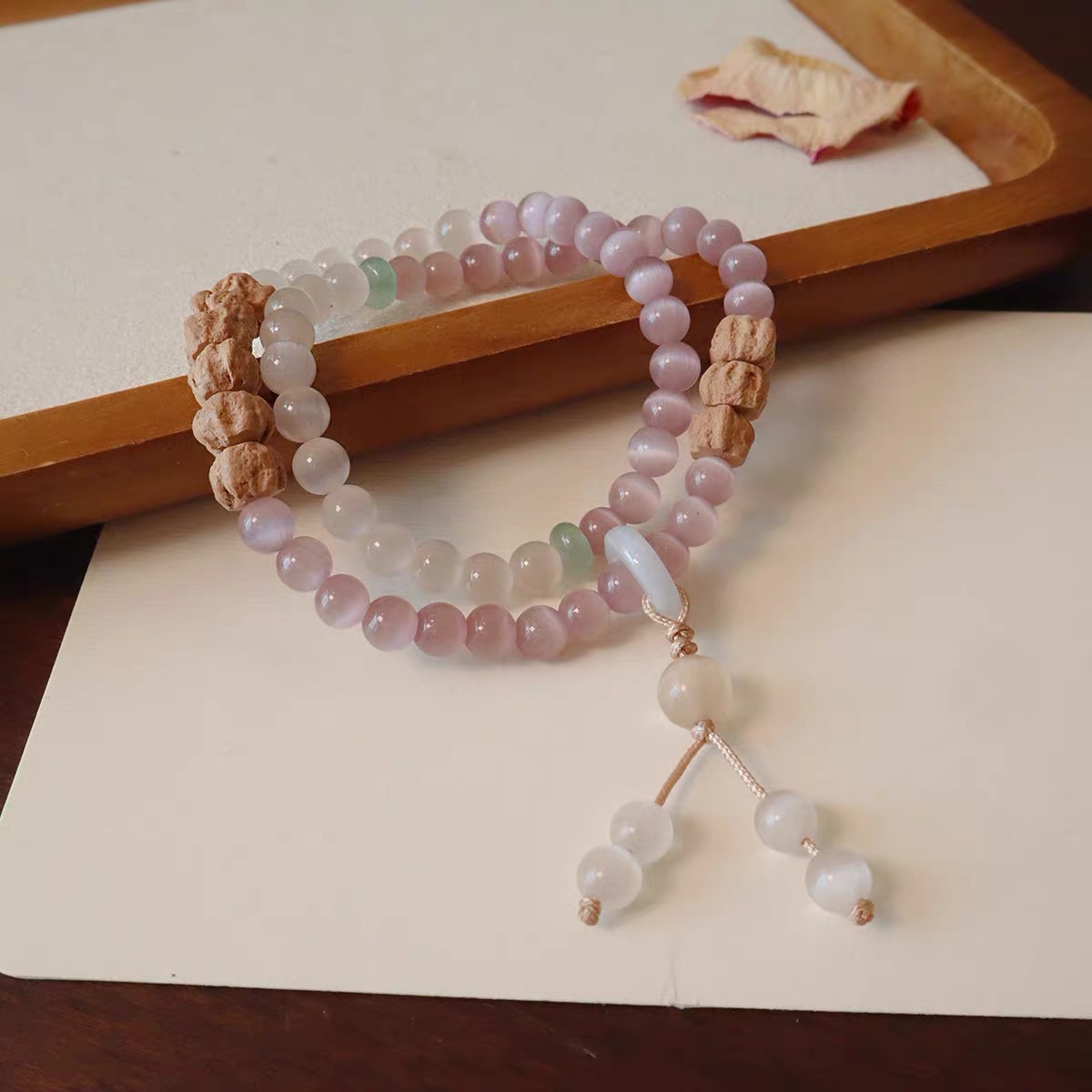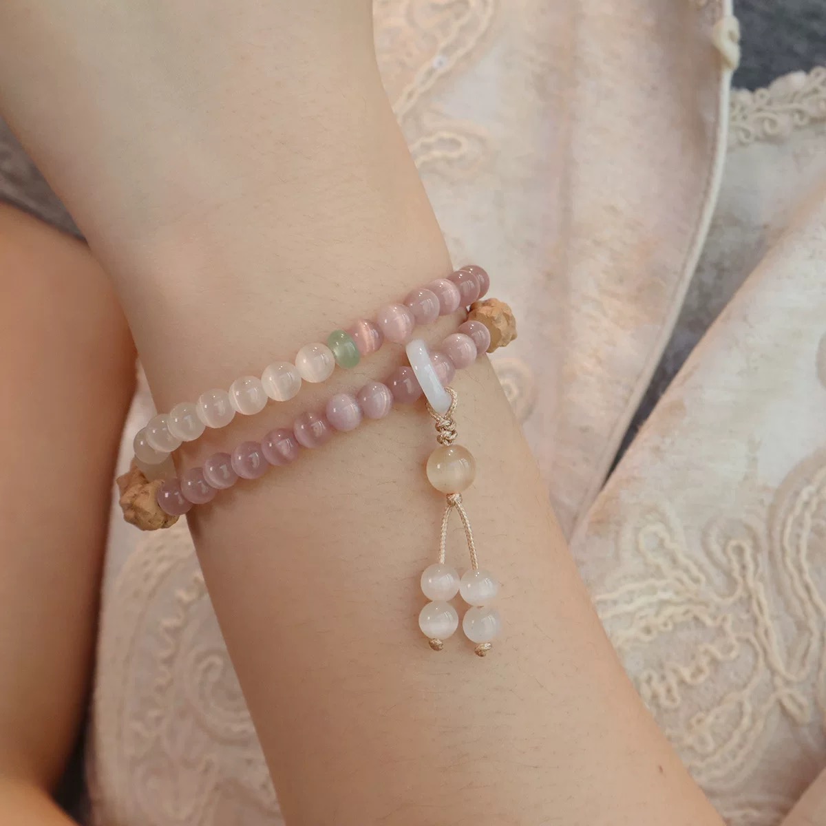 【品名】松雾蔷薇·猫眼百香籽双圈手串