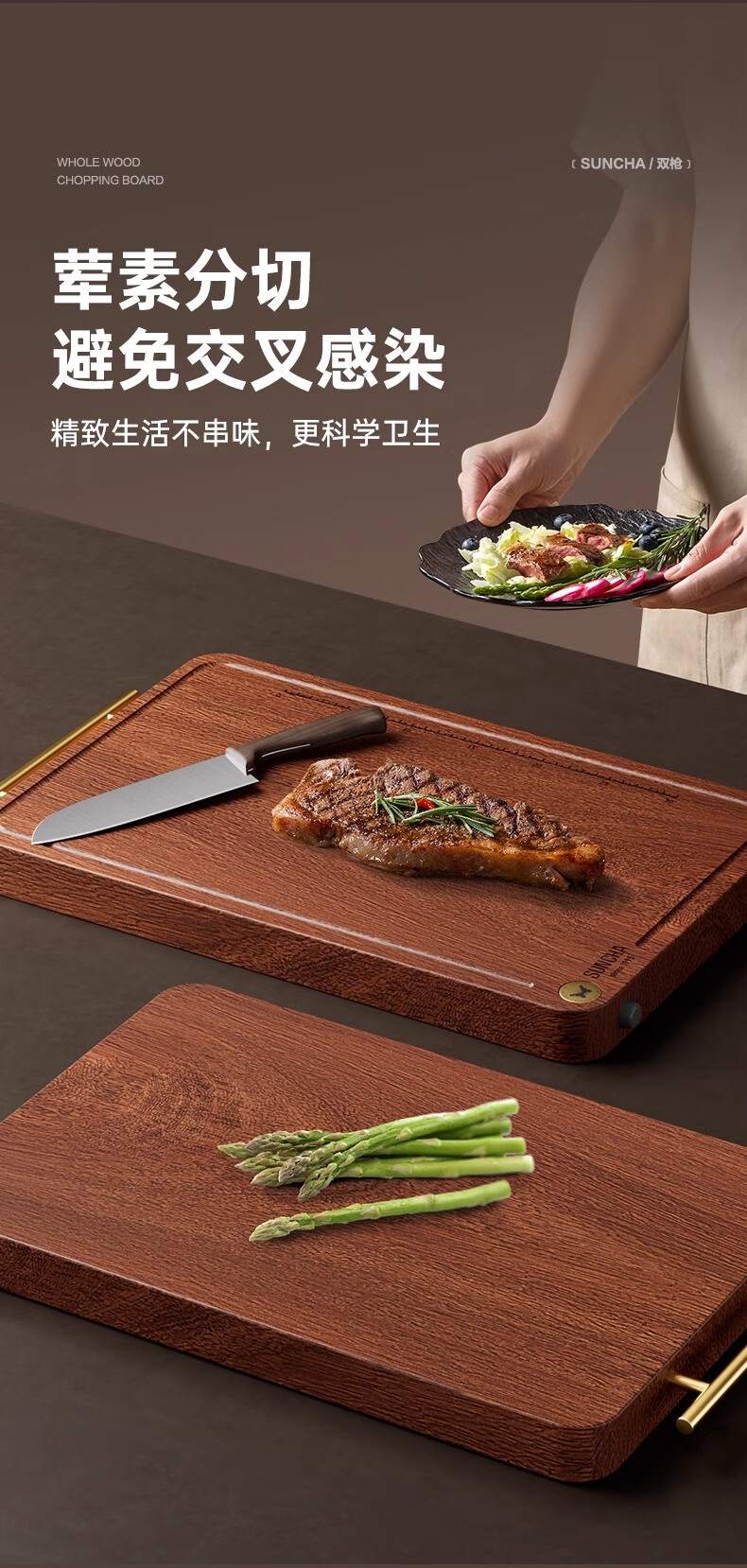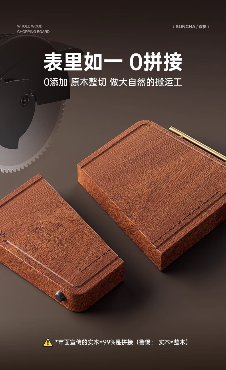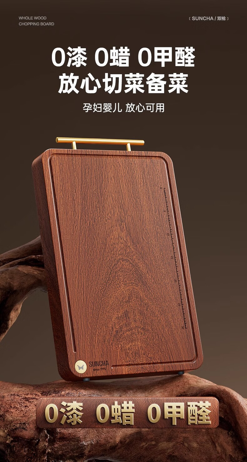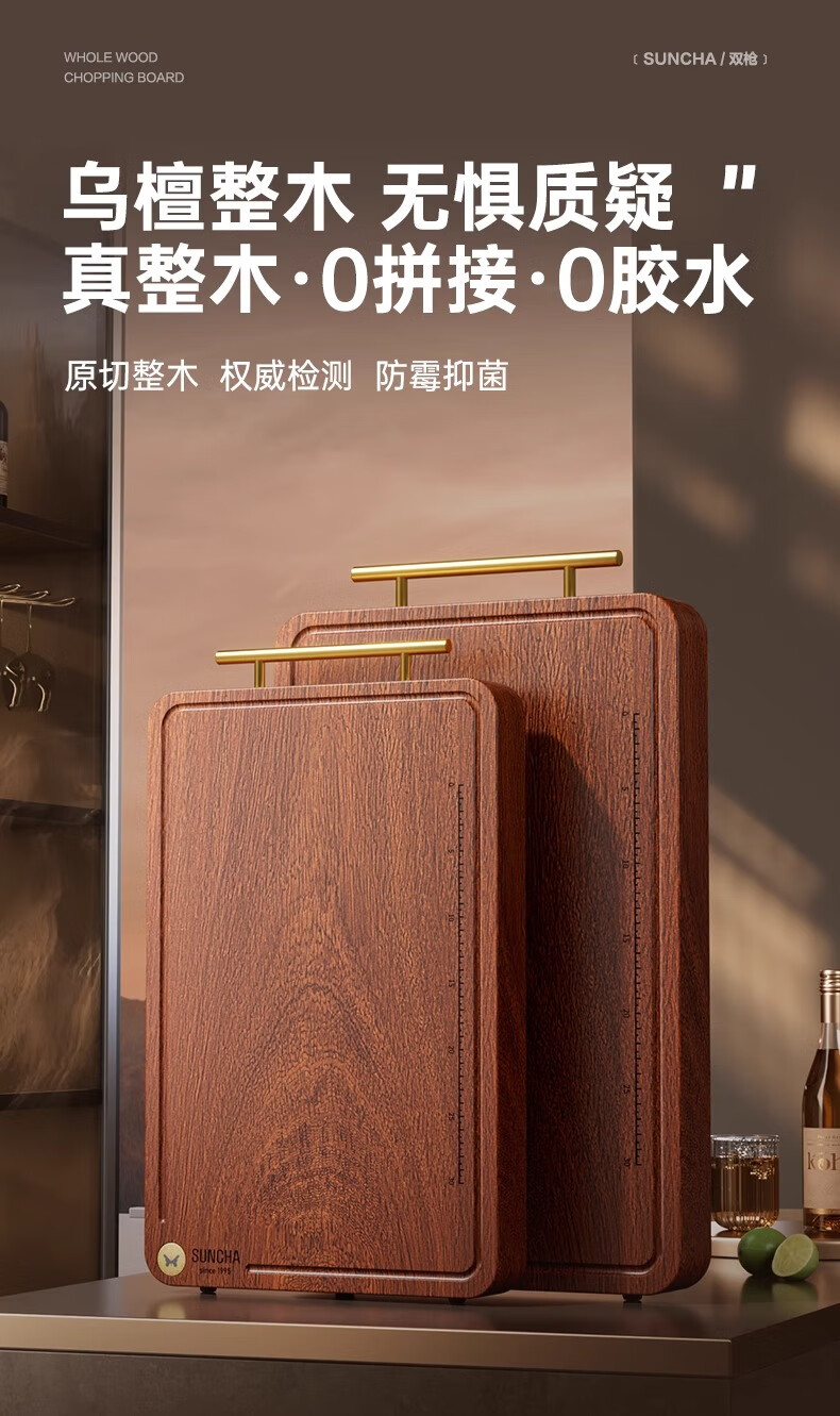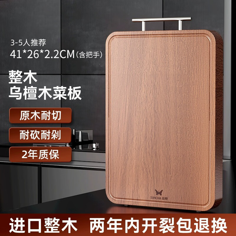 积分免费兑:双枪乌檀木整木菜板实木抗菌防霉家用切菜板案板大号砧板 【整木芯材】41*26cm(含把手)