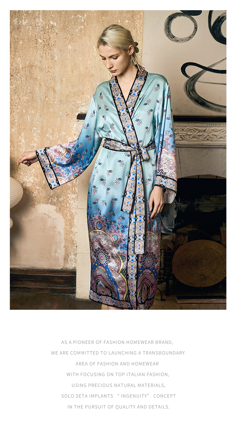 - soloseta专注于真丝织物,灵感源自意大利语,中文含义为“只做真丝”的意思。让睡衣变时尚,居家和外出瞬间切换,使其更具有出街,度假,参加宴会等功能。