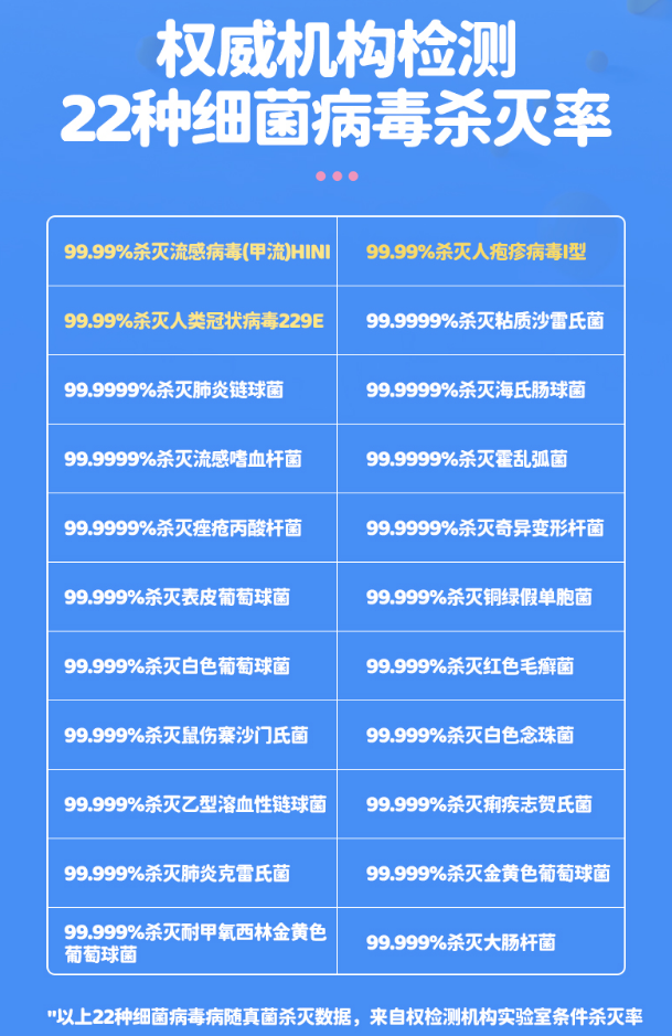 对常见的22种细菌、病.毒灭杀率高达99.999%!