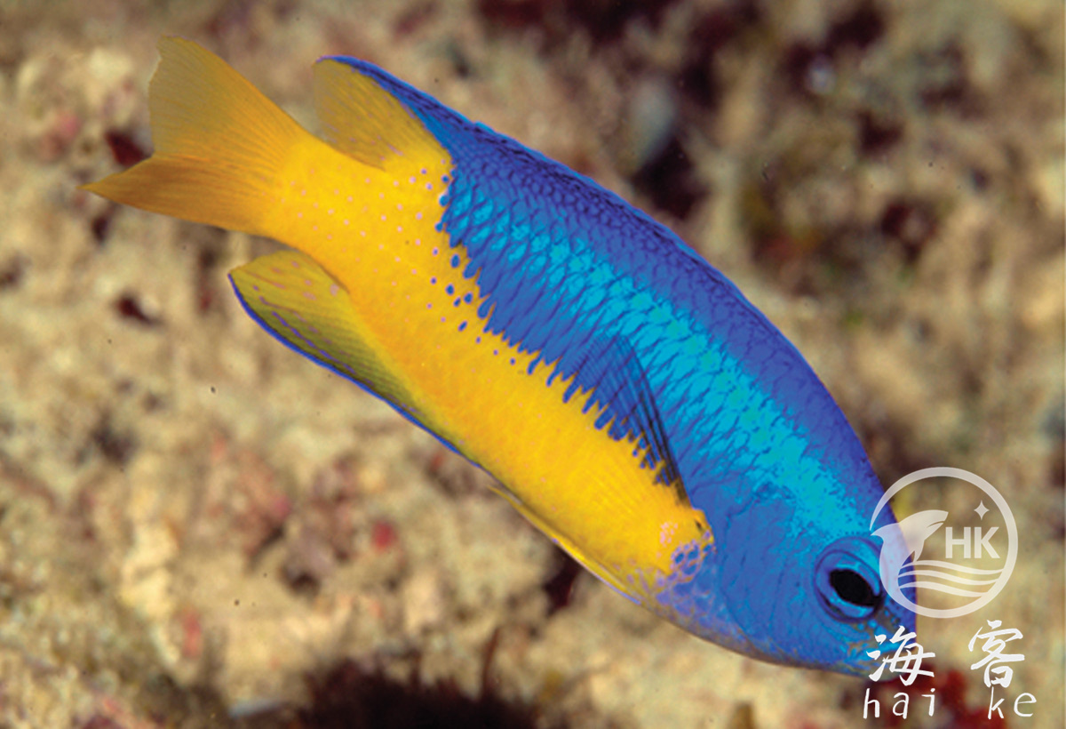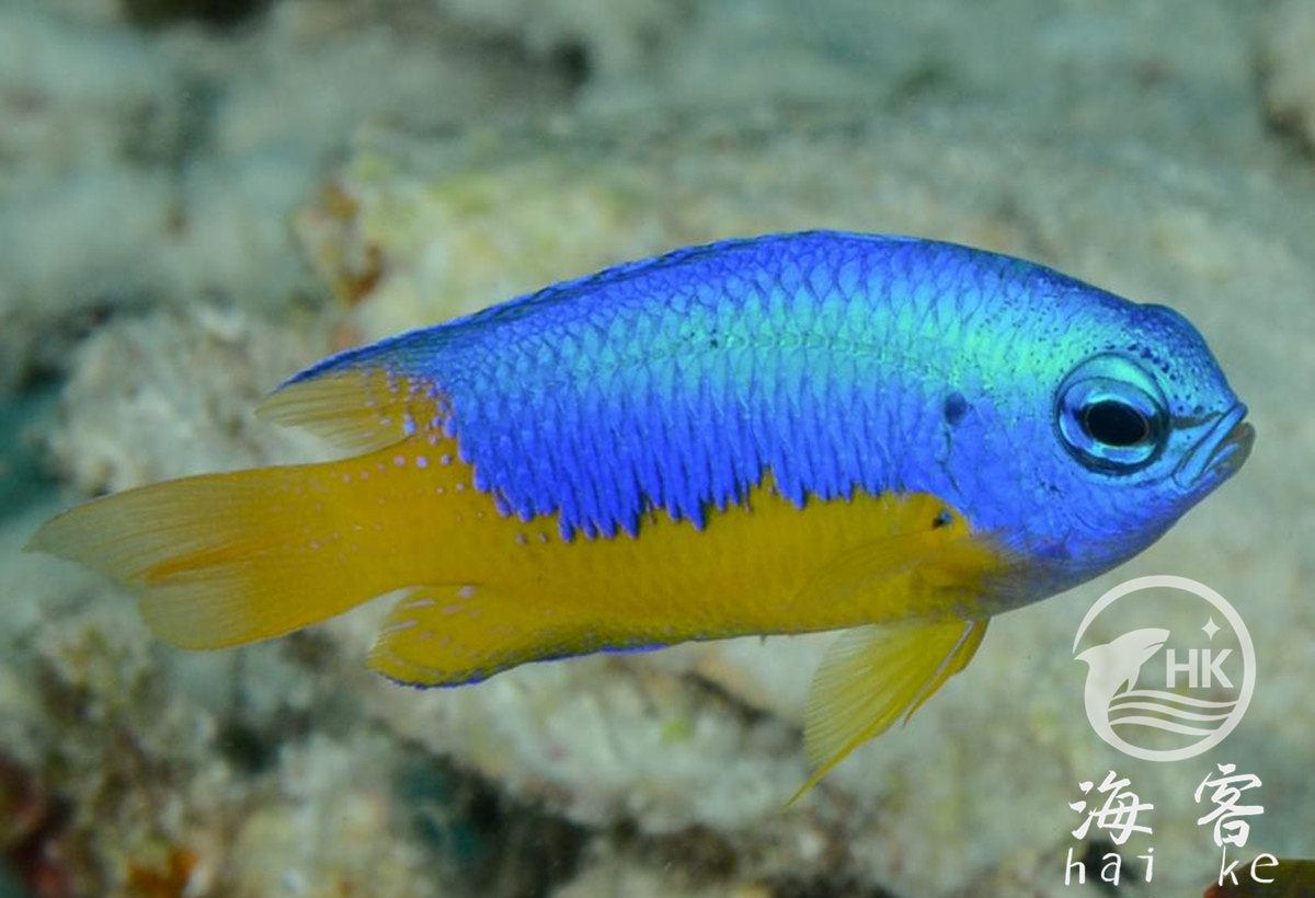 身体颜色为亮蓝色,腹部和尾部是黄色。