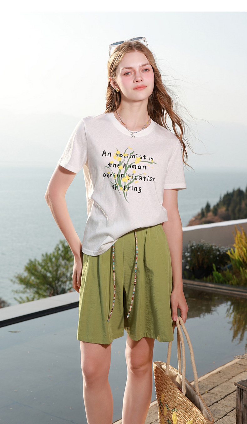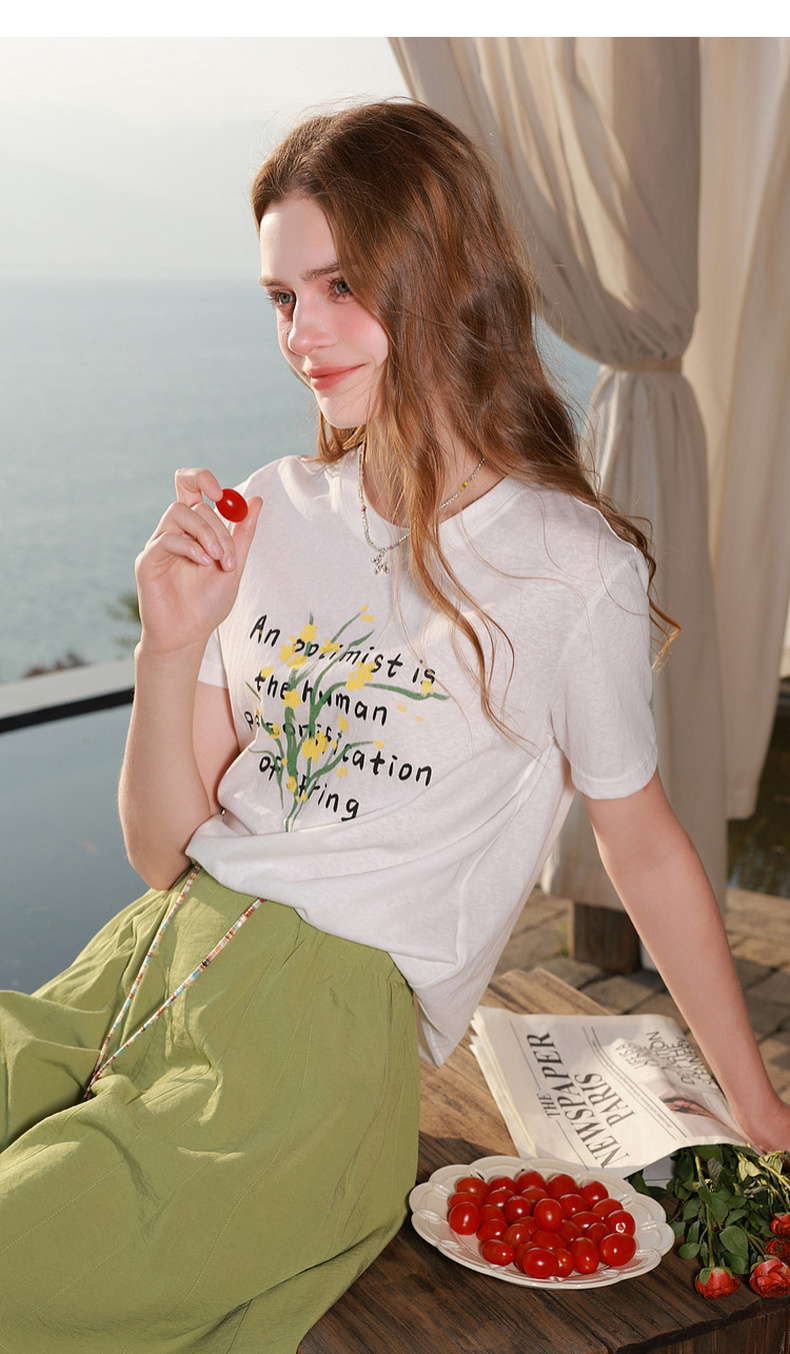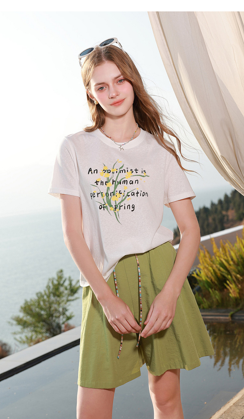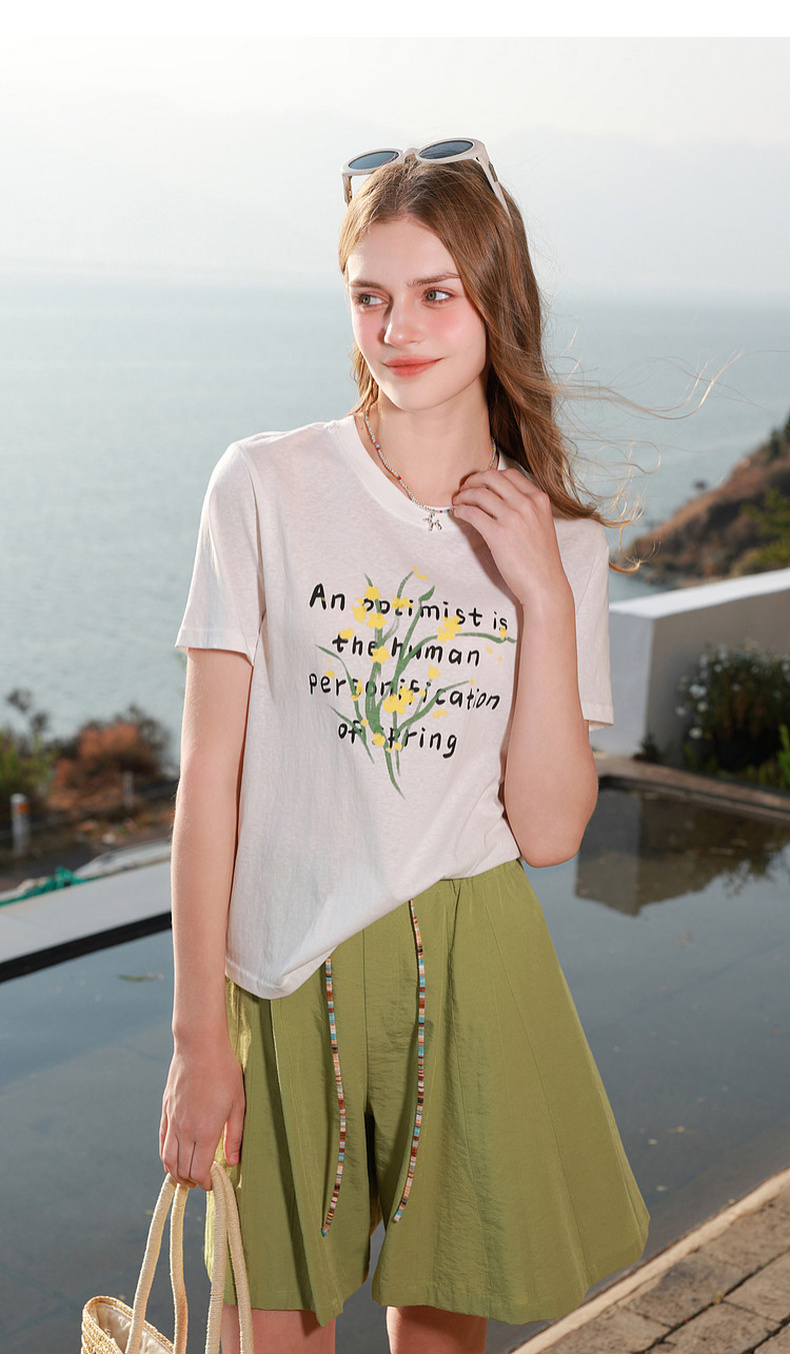 三彩2026夏季新款字母花卉印花T恤短袖上衣宽松套头衫M