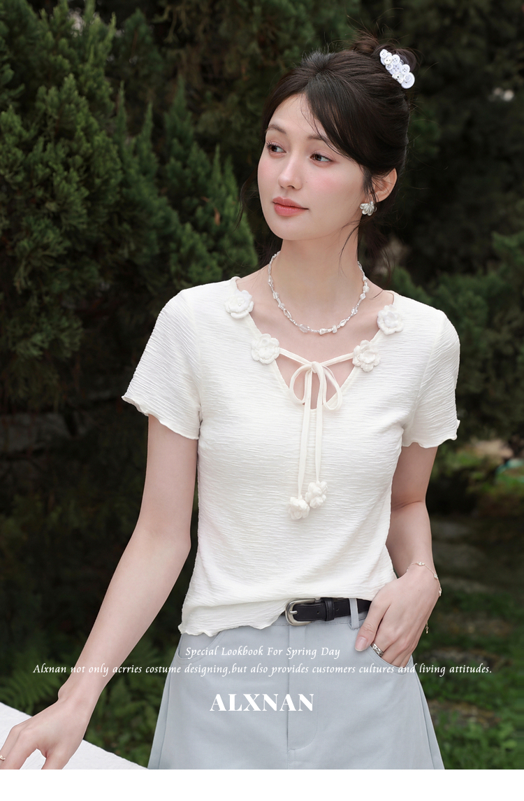 鹿向南「云间浅梦」米白色T恤女夏季新款法式洋气设计感短袖上衣