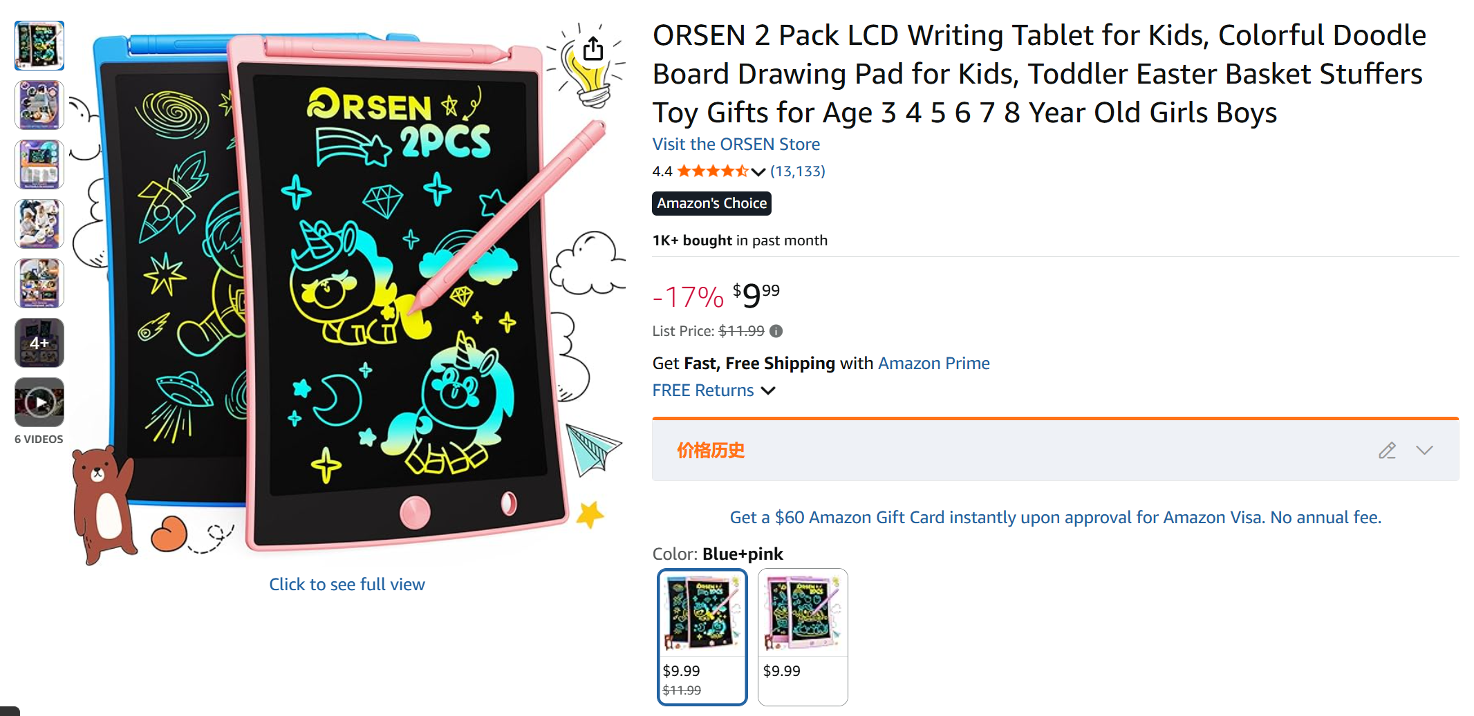 美国 ORSEN 8.5英寸LCD儿童手写板 多彩涂鸦绘画板 一键删除