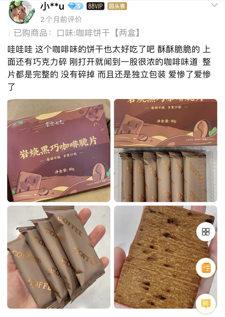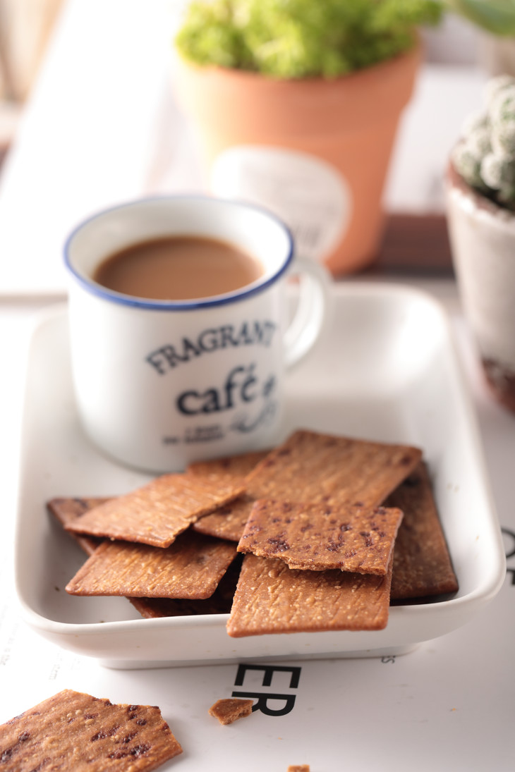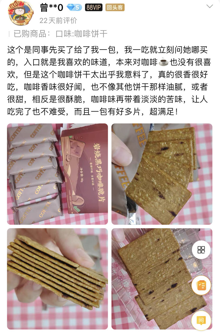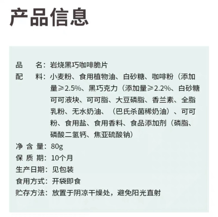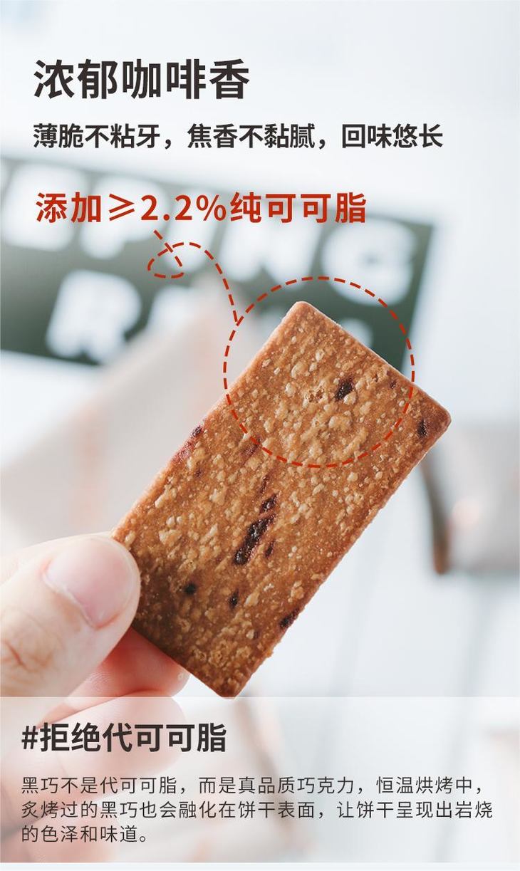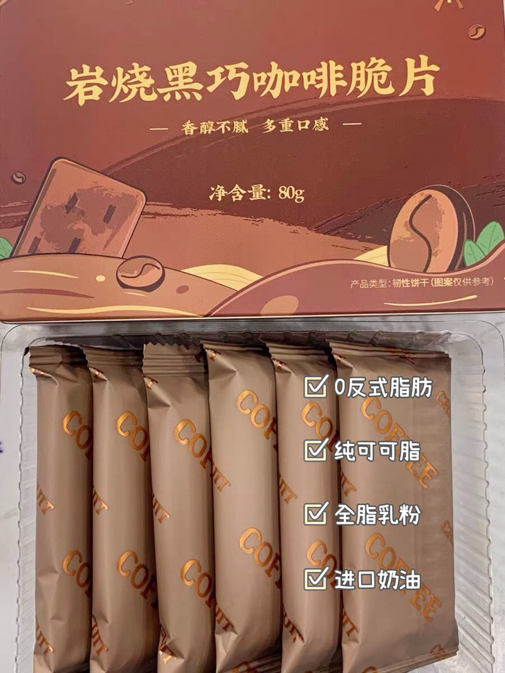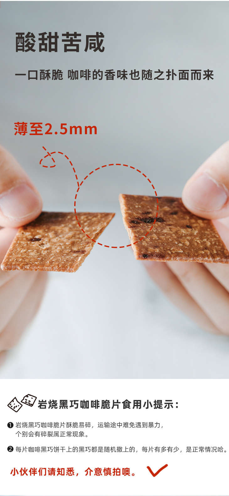 🤎向全世界安利! 三重口感 岩烧黑巧咖啡脆片! 幸福不需要太甜蜜的模样 可以是咖啡的甘醇☕️ 可以是黑巧的馨香🍫 还可以是海盐的微咸🌊 让甜也有风情万种的香 轻轻一咬如同浓醇咖啡在口中化开, 微咸带着黑巧的微苦,而饼干🍪又微甜,一切都那么刚刚好。 🤎轻薄酥脆,是小时候吃过的那种小饼干的口感。 🤎酸甜苦咸,是2.5%咖啡粉和2.2%黑巧的情投意合。 🤎醇厚焦香,是恰到好处的苦甘和甜香。 口感层次真的好丰富哇,真的幸福满满!