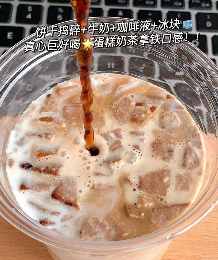 这样的吃法绝绝子 ☕️咖啡捣碎+🥛牛奶+咖啡+🧊冰块 有一种蛋糕奶茶拿铁的口感🥤 越吃越香的那种, 只要吃上肯定刹不住