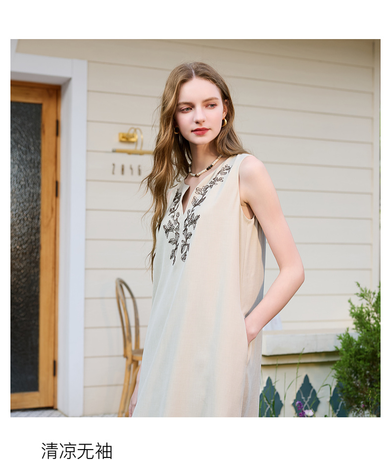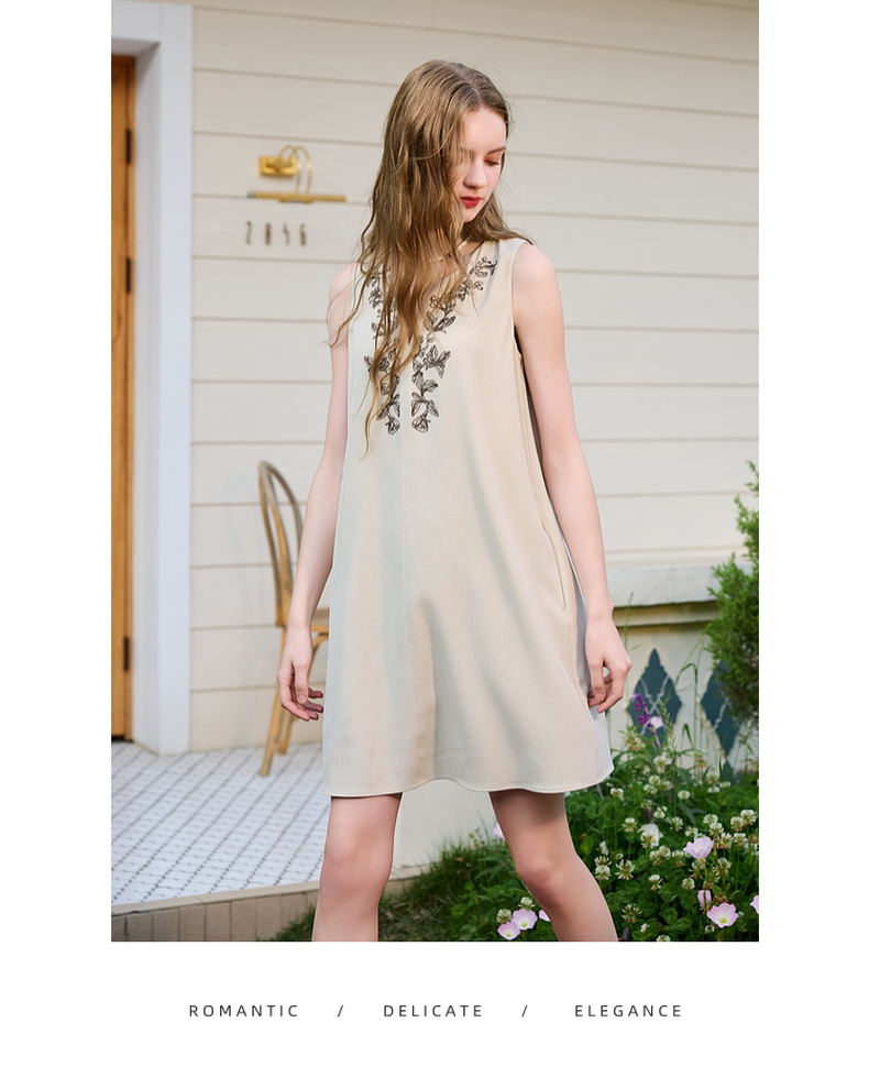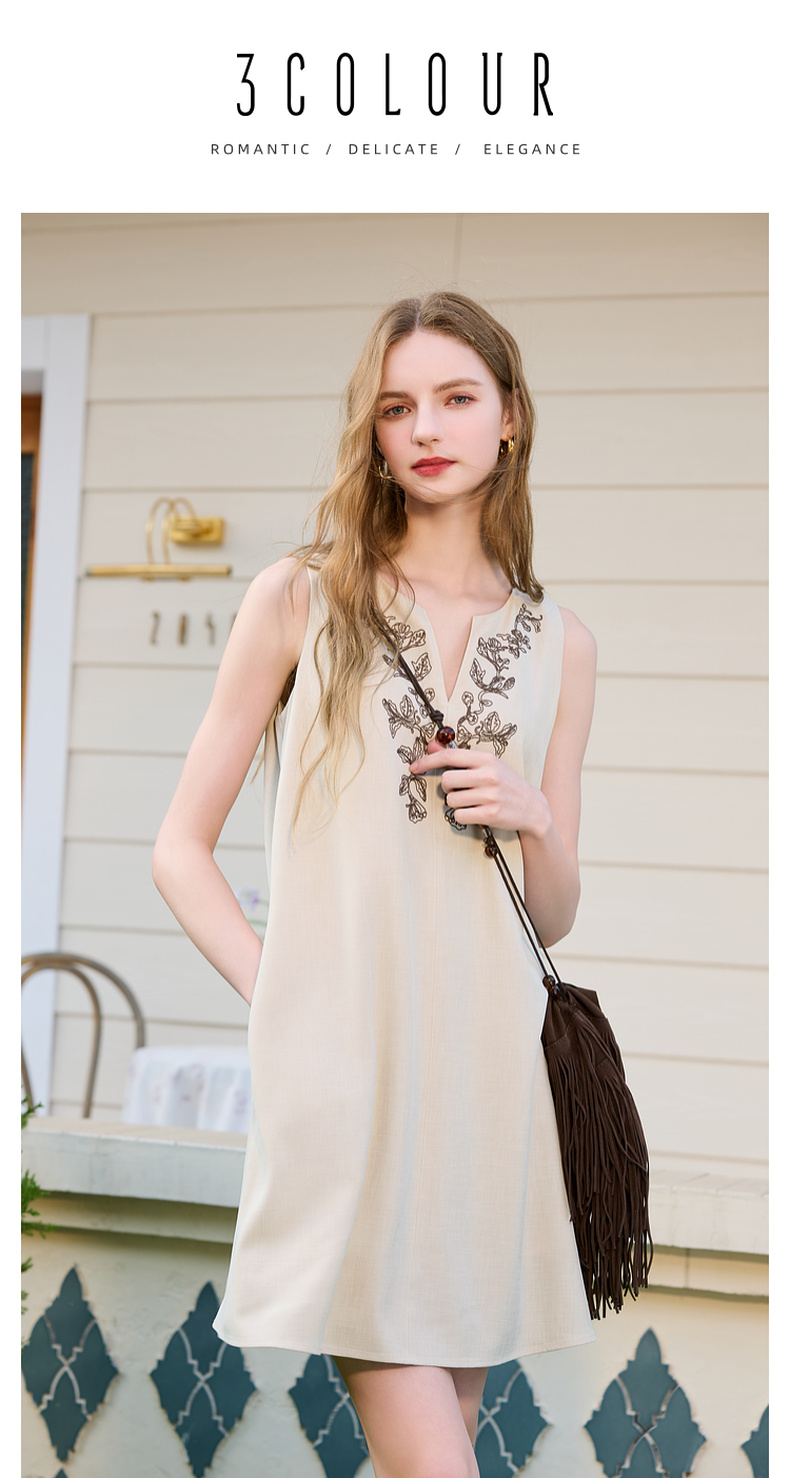 三彩2025夏季新款圆领无袖连衣裙宽松短裙小A字裙绣花背心裙M