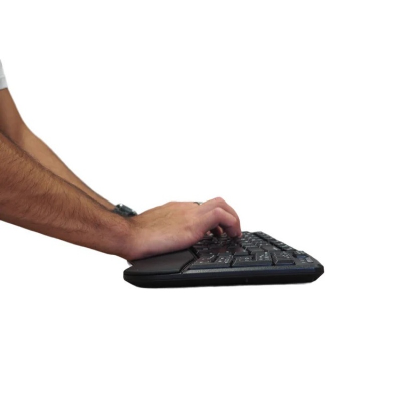人体工学设计:带有腕托,弯曲的键位,对手腕的友好设计,键盘设计注重人体工学,配有带腕托,以减轻手腕的压力。弯曲的按键符合手指的自然形状,促进更舒适的打字姿势,并降低重复性劳损的风险。