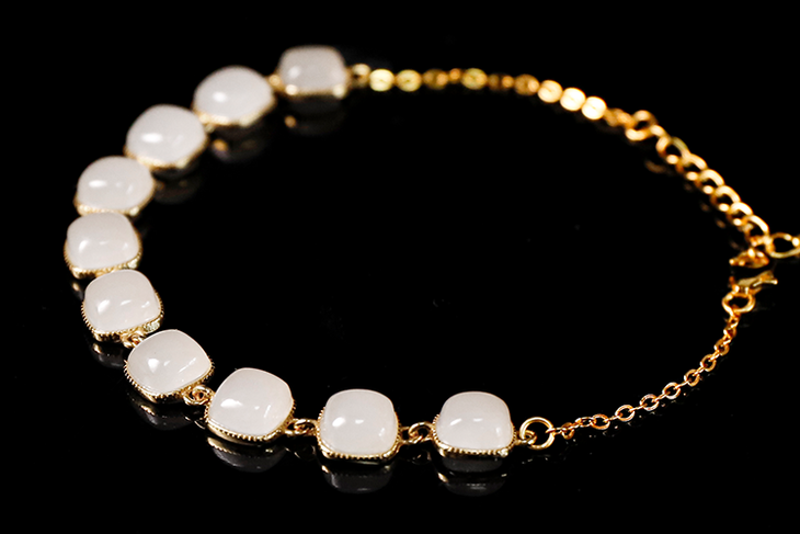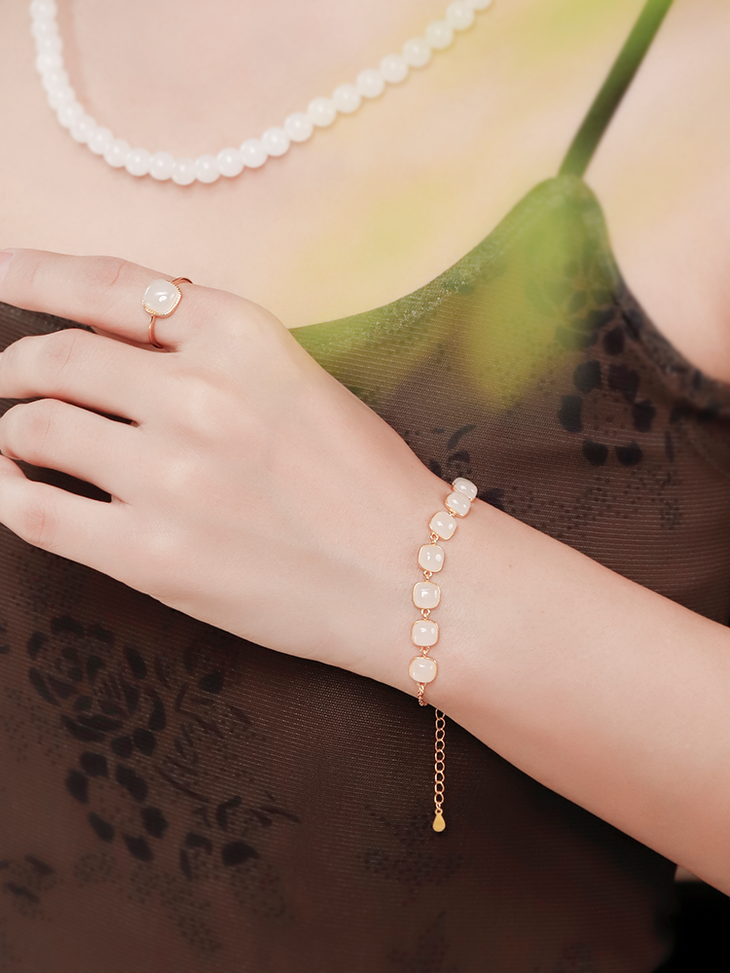 甜蜜如糖,温润如玉。 精选珠宝级和田白玉,切割成精致方糖造型,串联成链,简约而不失优雅。