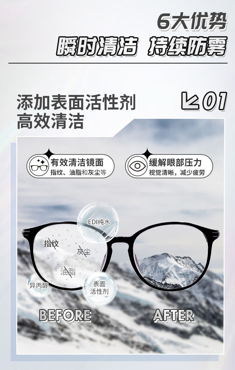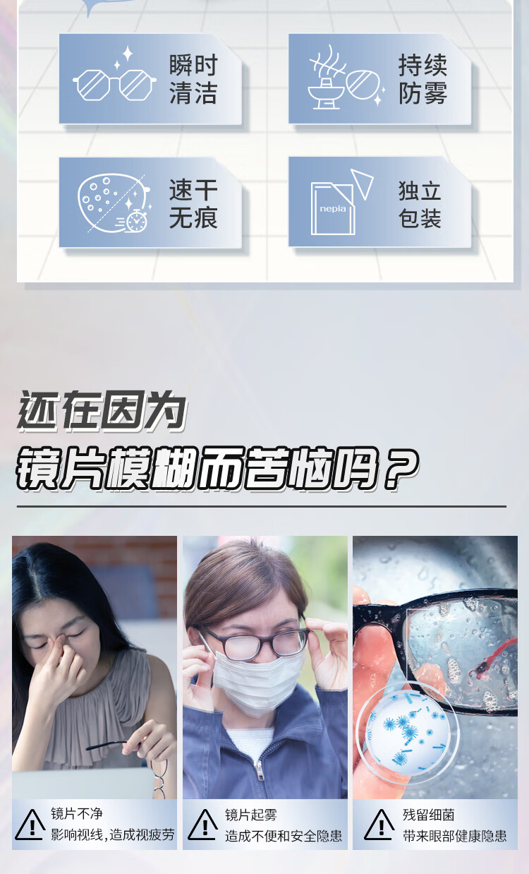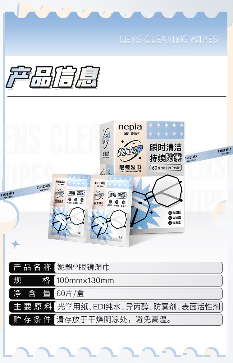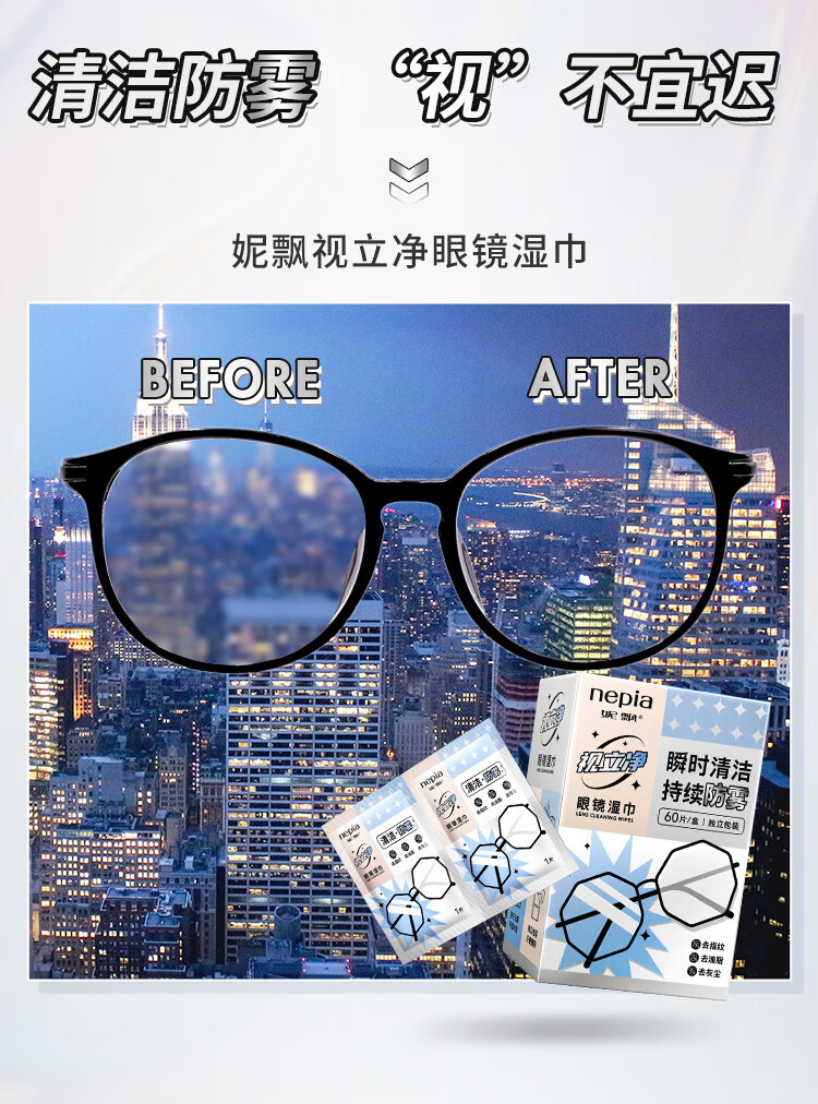妮飘(Nepia)眼镜湿巾持久高效防雾杀菌率99.9%便携清洁擦镜纸独立包装60片/盒_MW