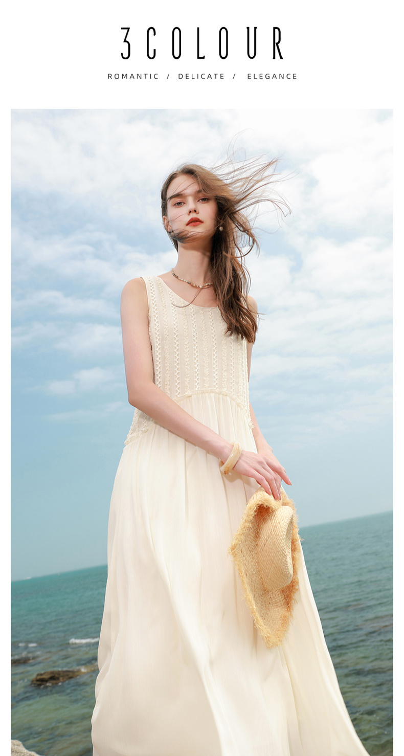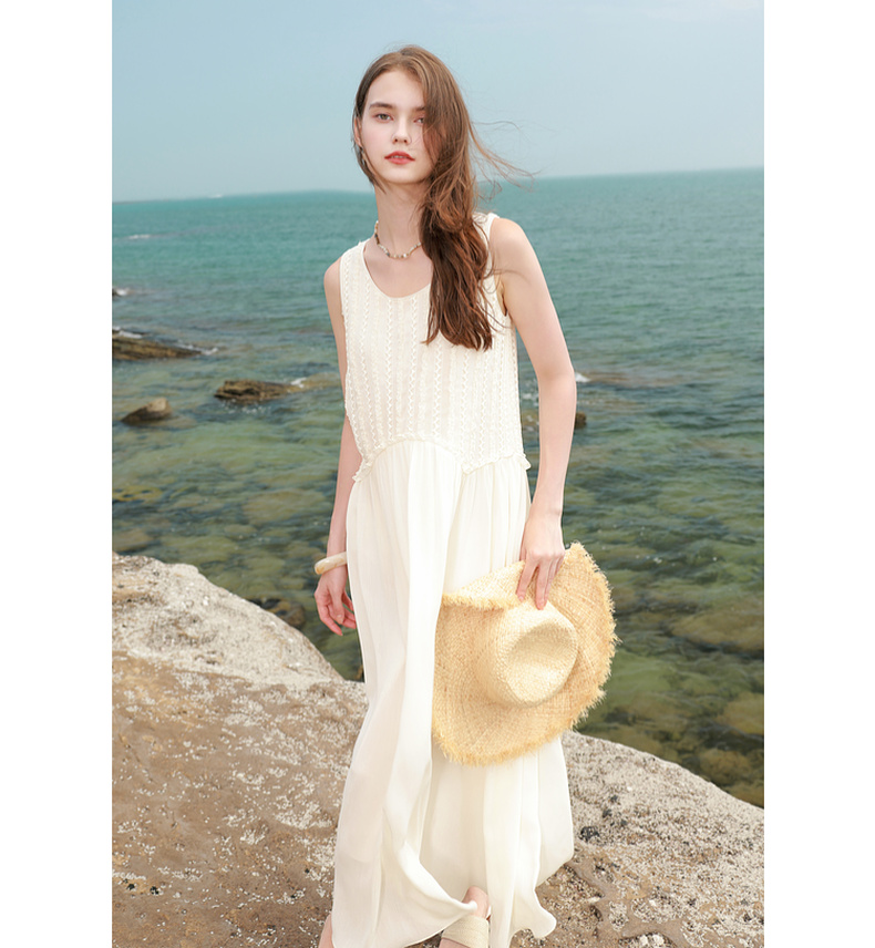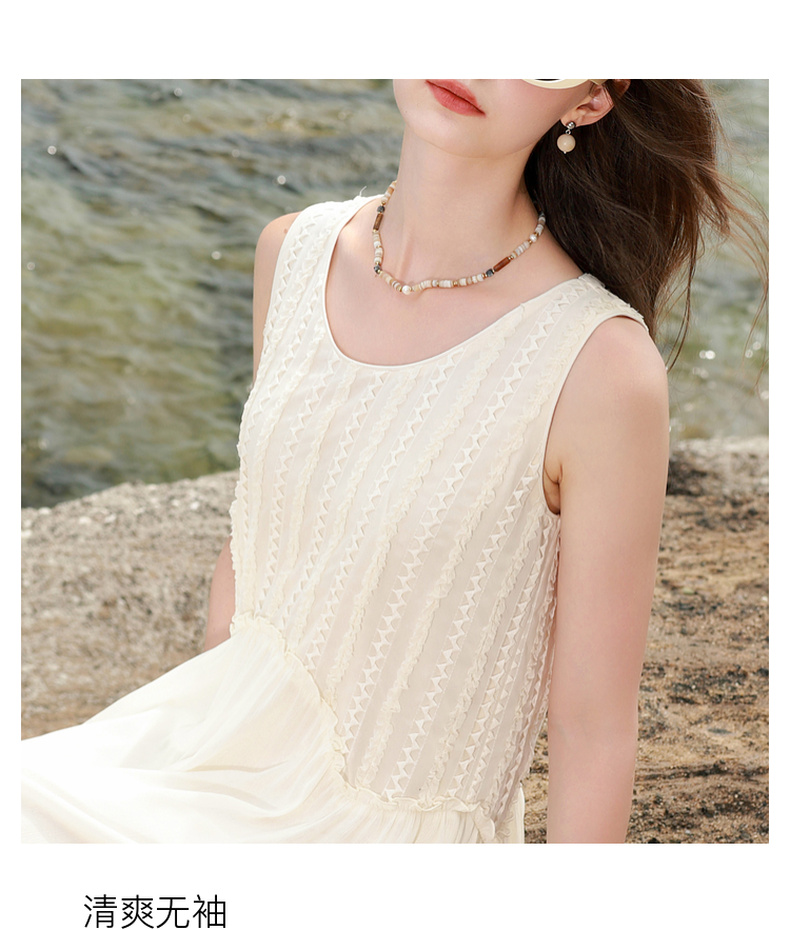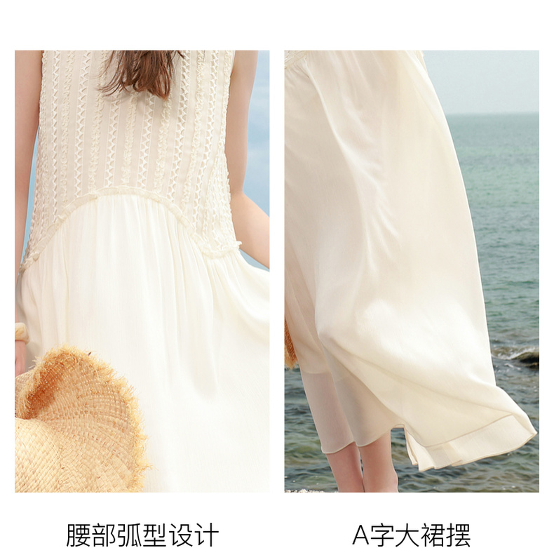 三彩2025夏季新款无袖连衣裙盘带绣花雪纺A字裙背心长裙M