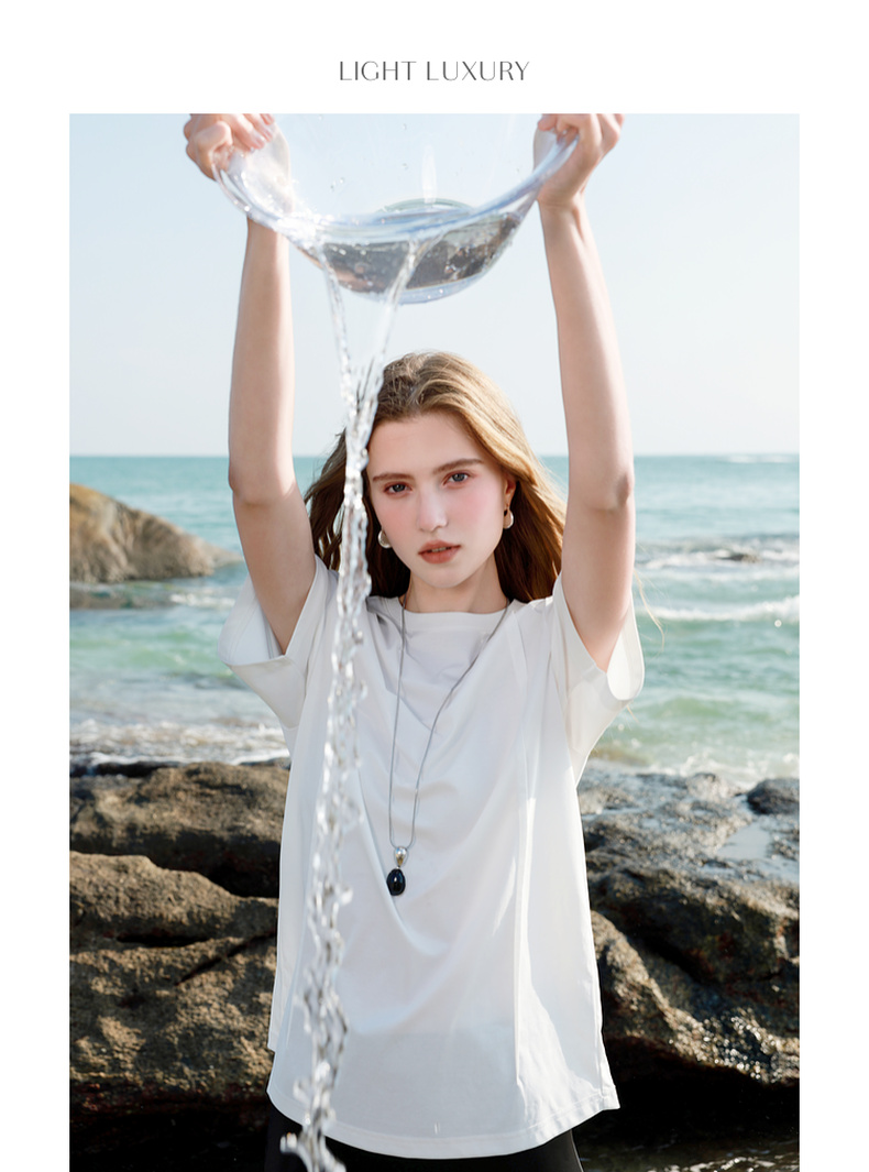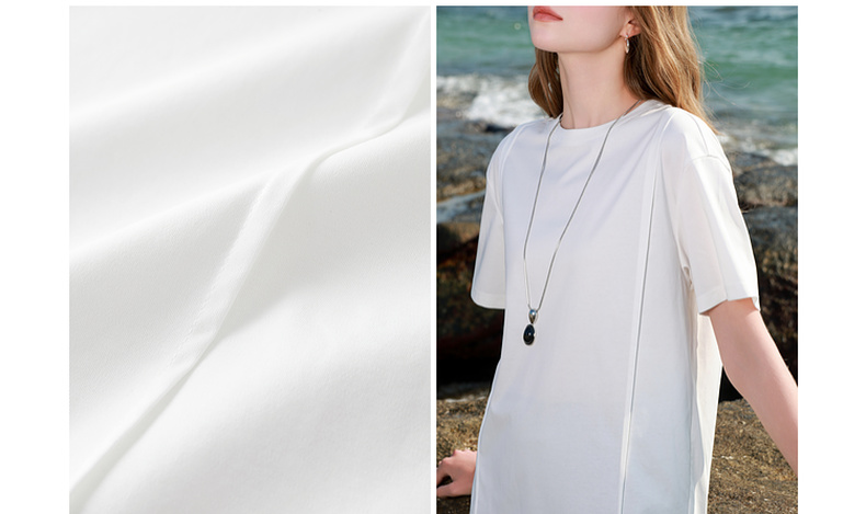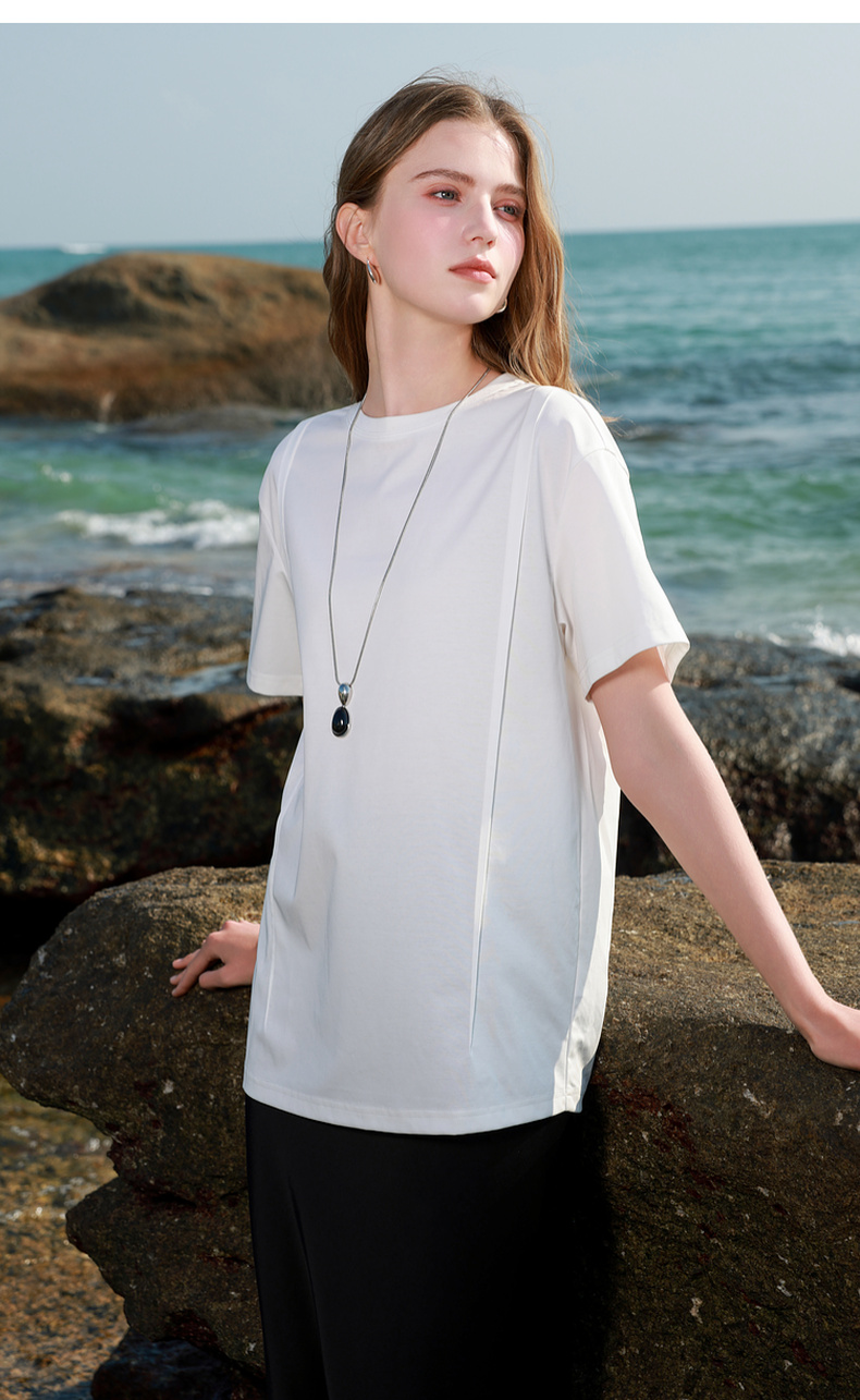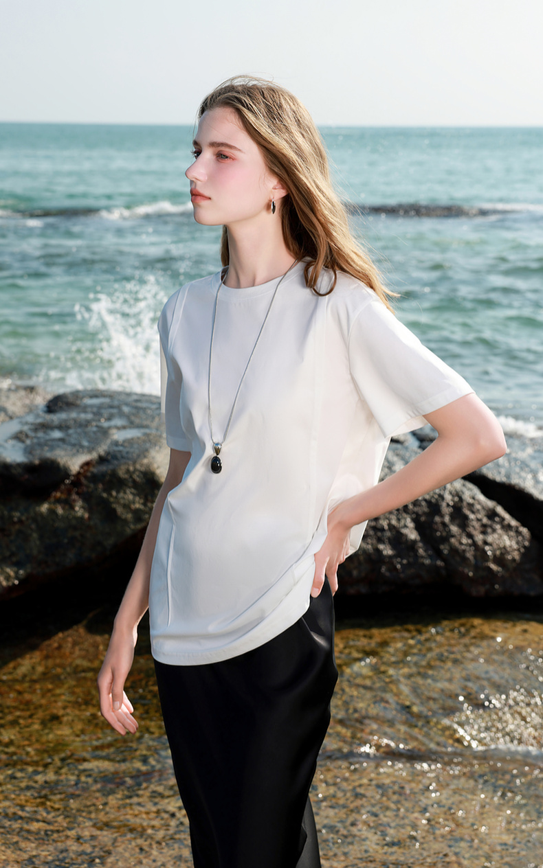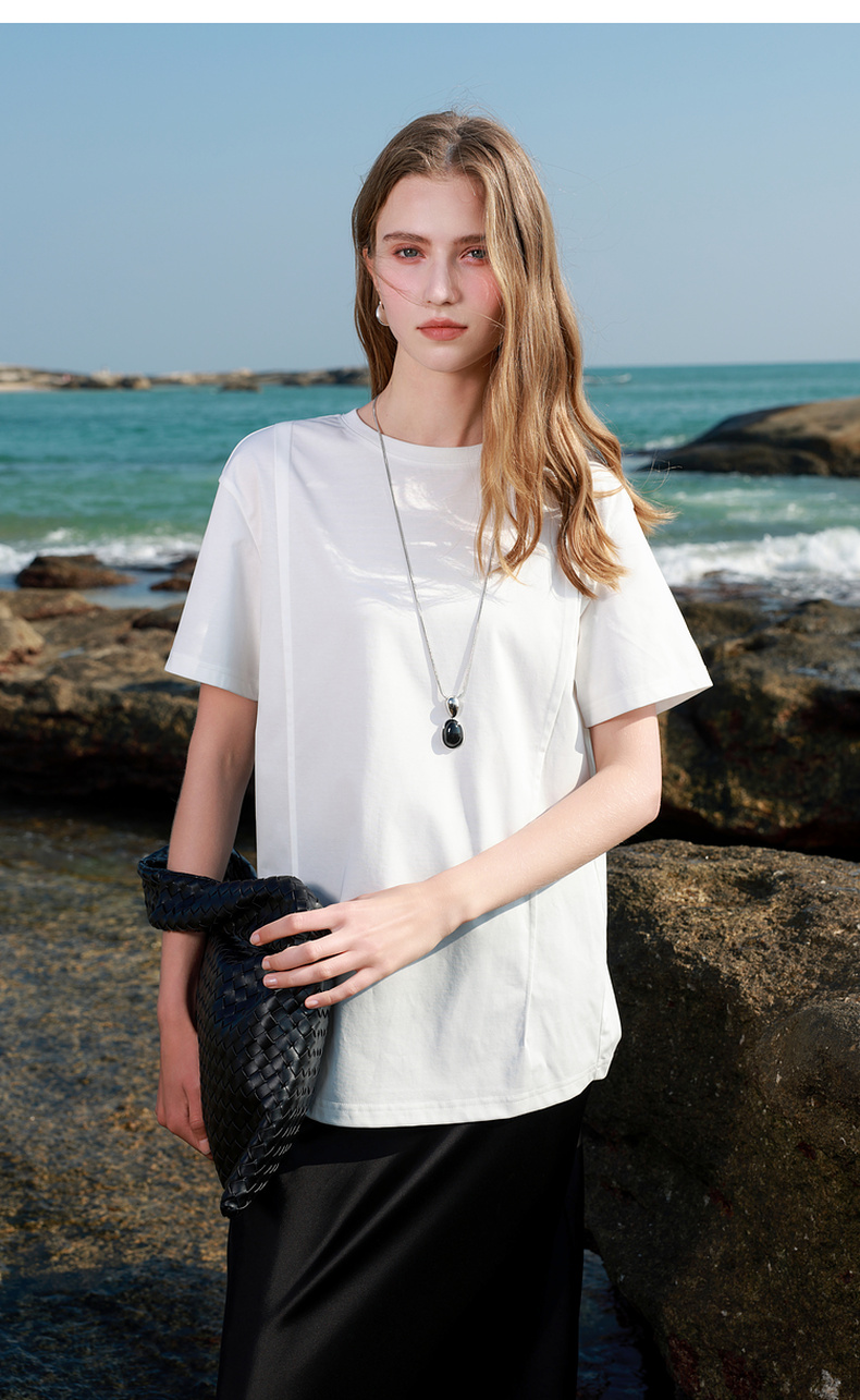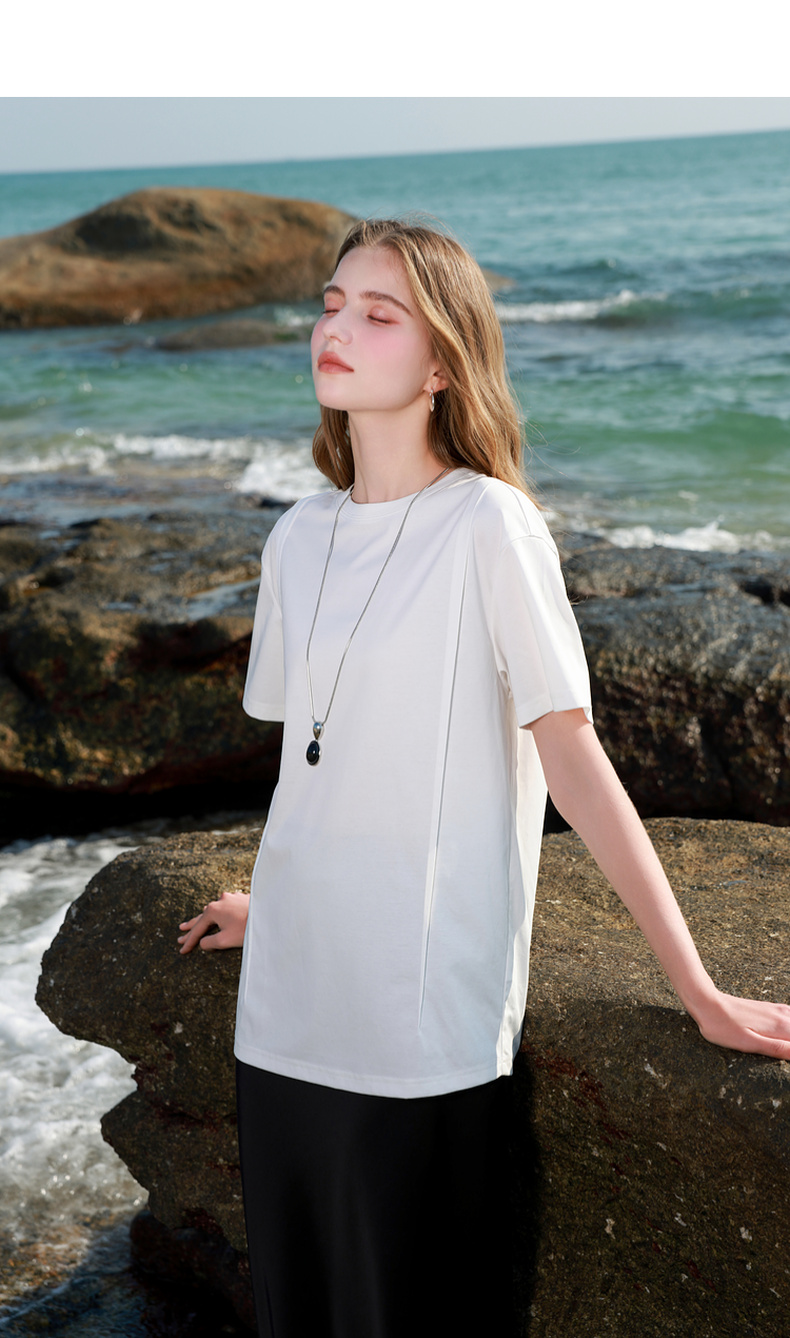 三彩2025春季新款100支长绒棉宽松圆领白T恤纯色落肩袖套头衫S
