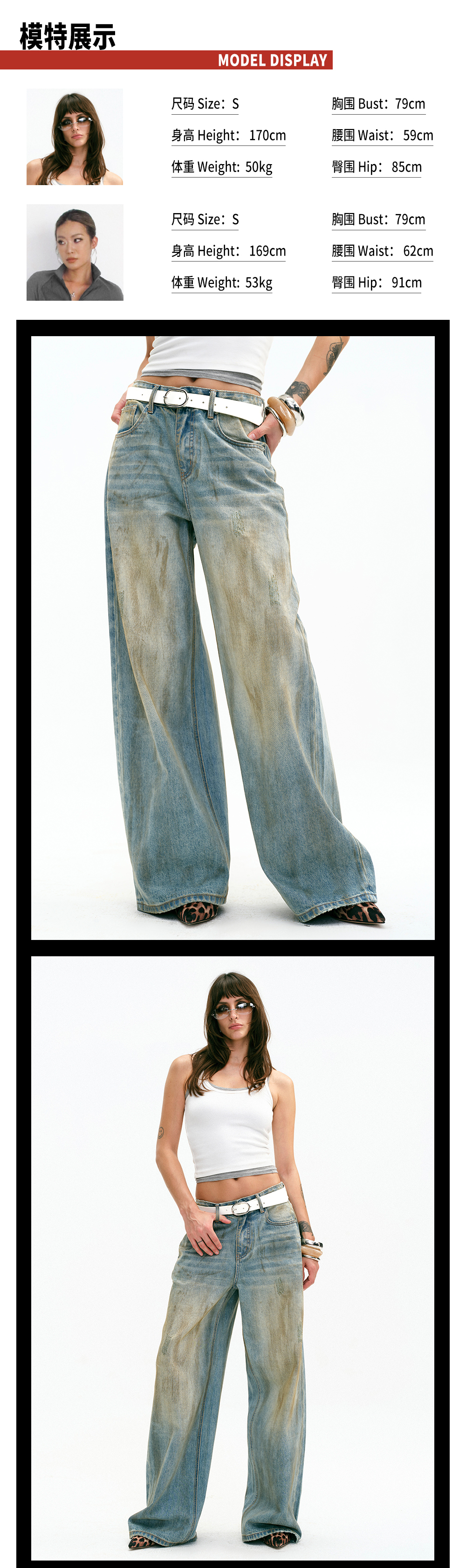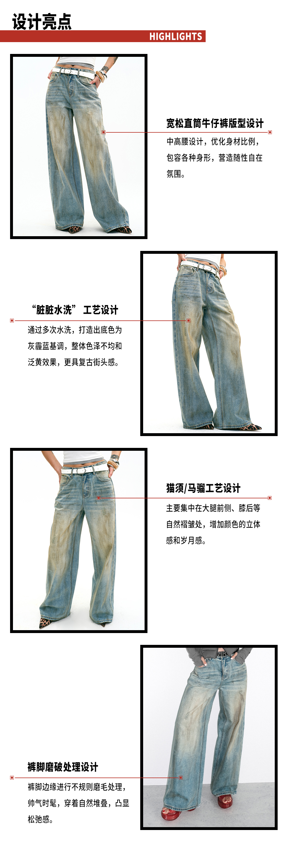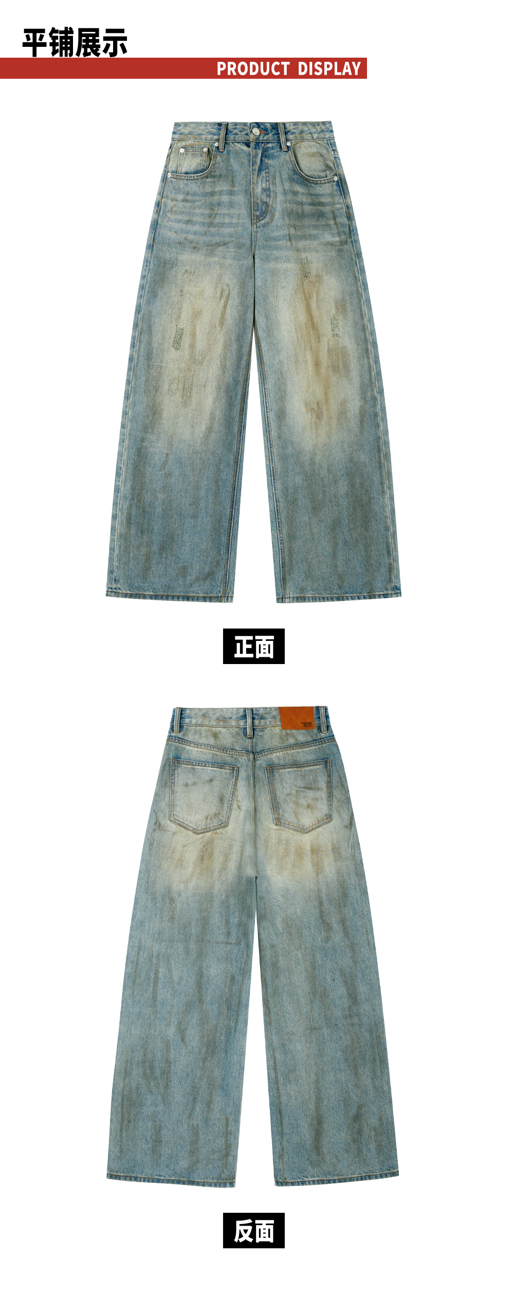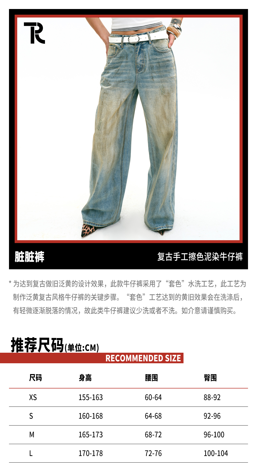 TR她热 脏脏裤 蓝色做旧复古休闲显瘦泥染脏脏裤直筒牛仔裤