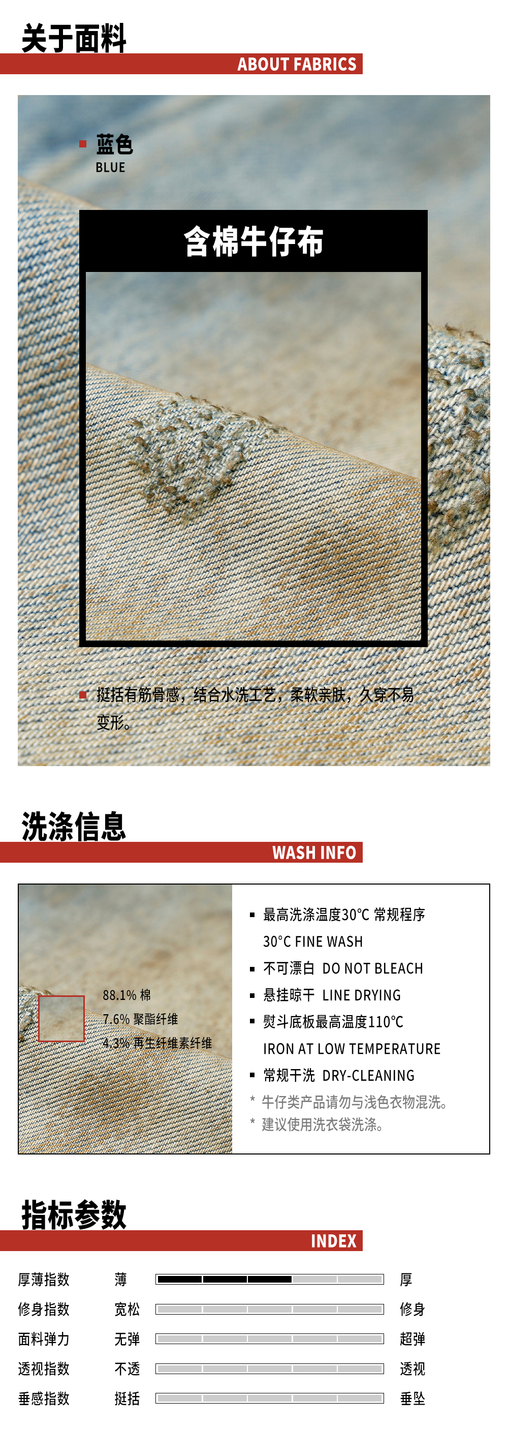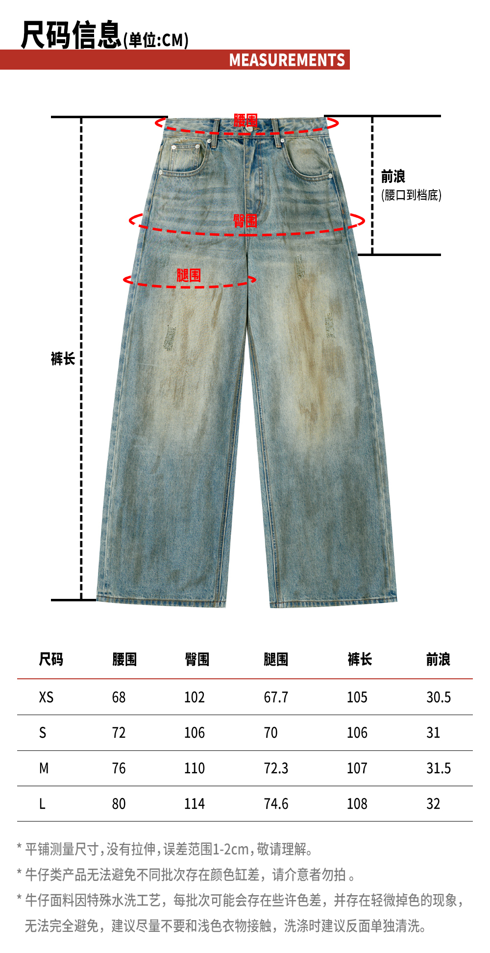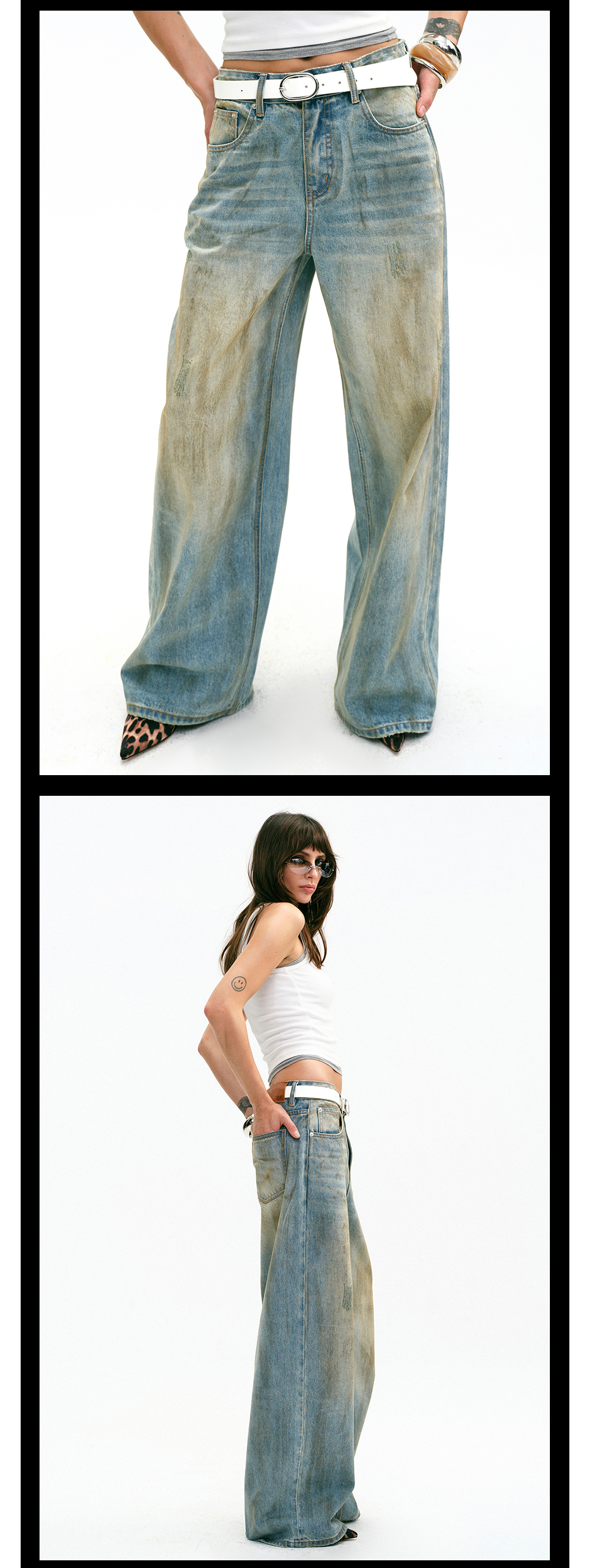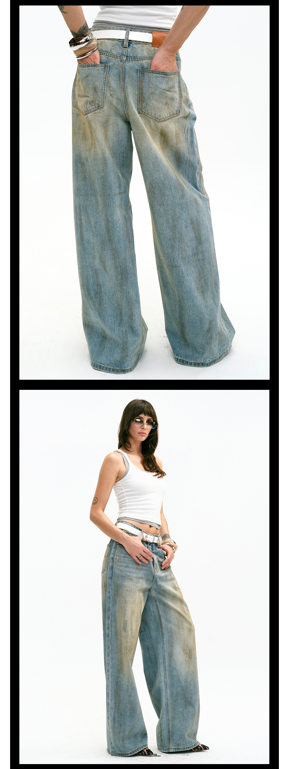 TR她热 脏脏裤 蓝色做旧复古休闲显瘦泥染脏脏裤直筒牛仔裤