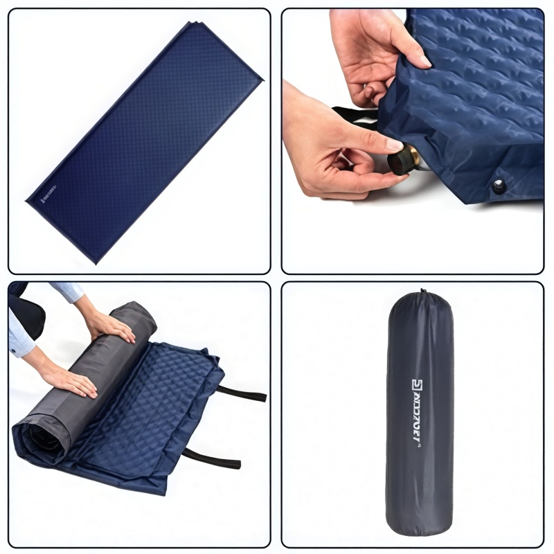 收纳:首先,将睡垫压平在地上。其次,扭转通风口使其放气,然后旋转并折叠以压缩。慢慢卷起睡垫。然后慢慢将卷起的睡垫放入包装袋。将所有睡垫放入包装袋后,用带子将包装袋收紧。