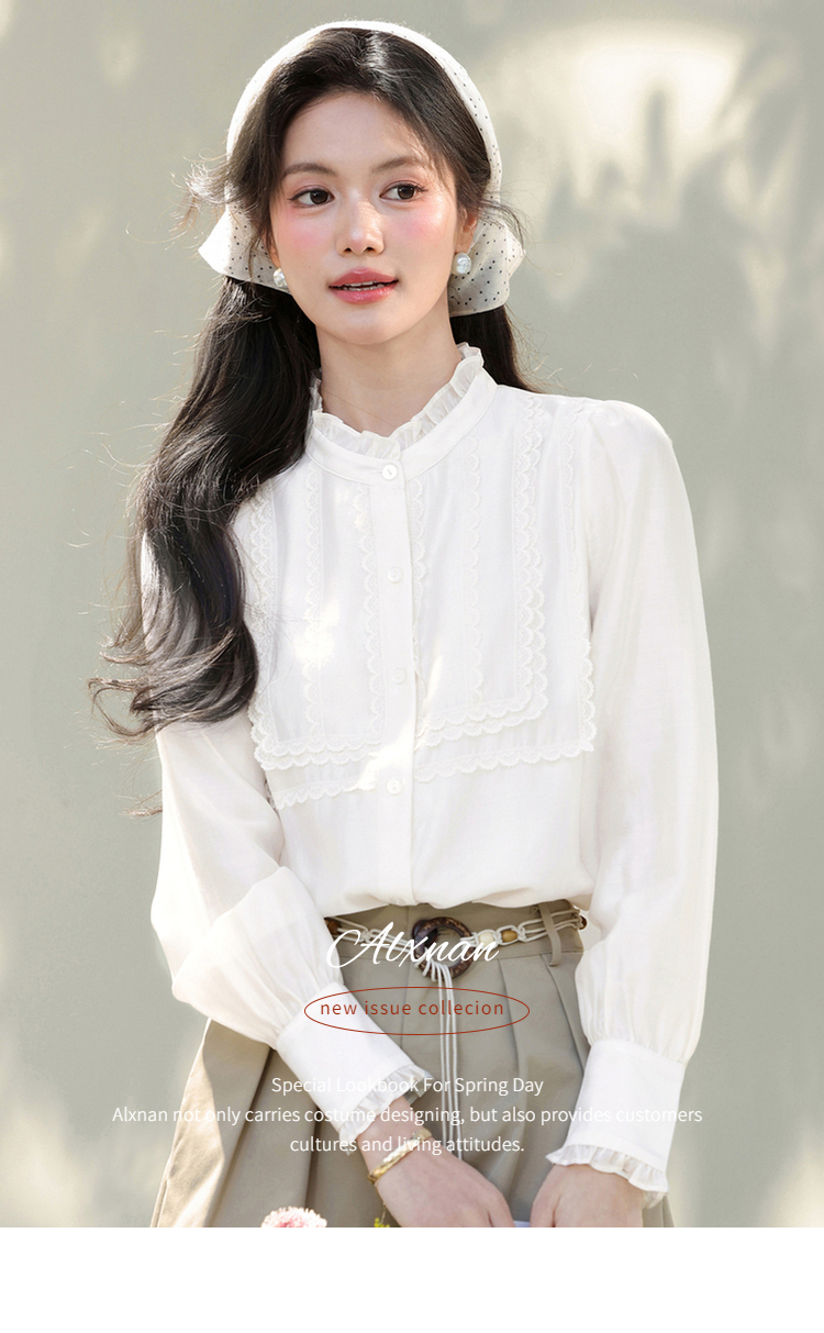 鹿向南「清韵芳姿」杏色半高领衬衫女春季减龄洋气内搭长袖款上衣