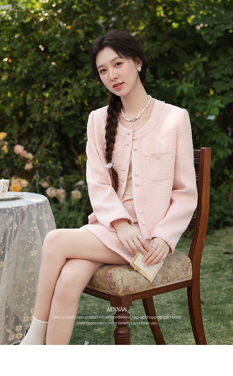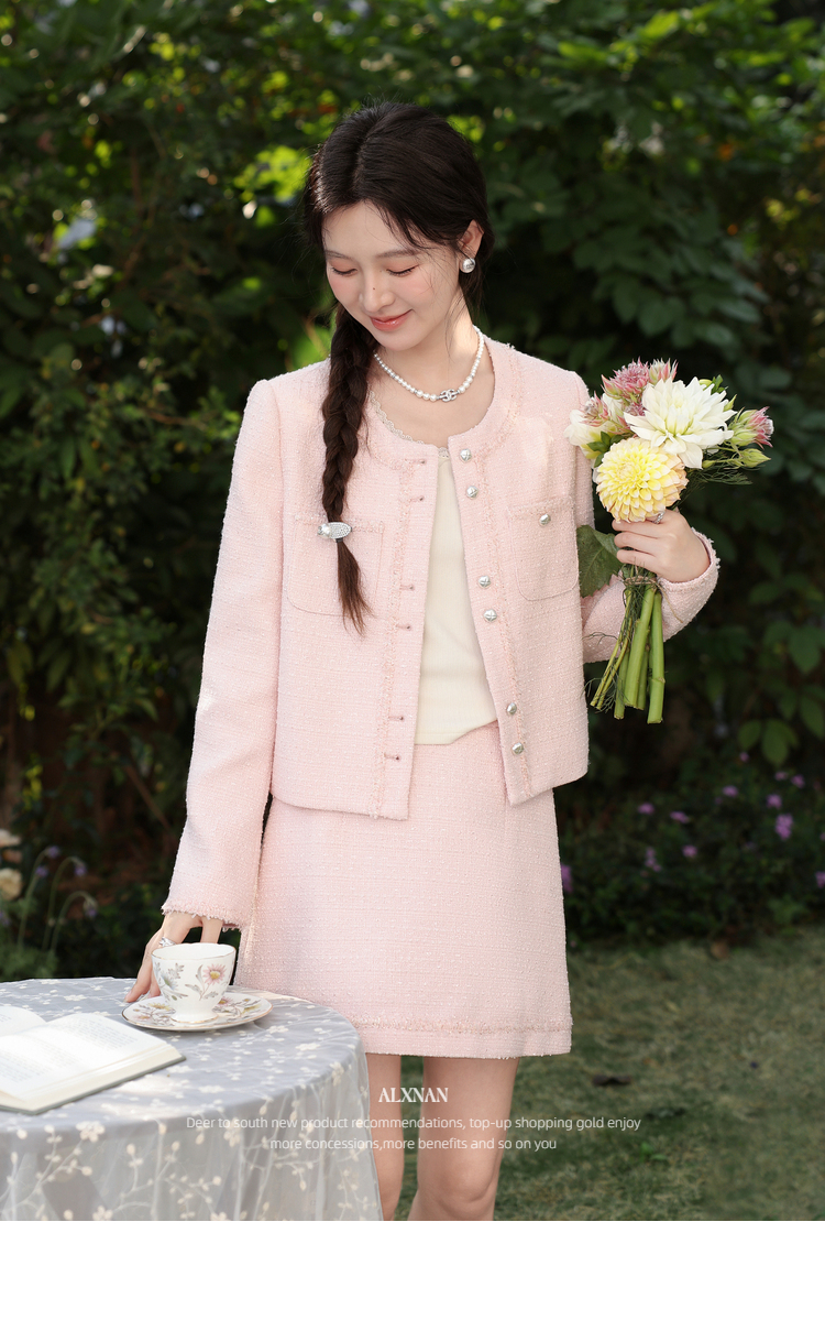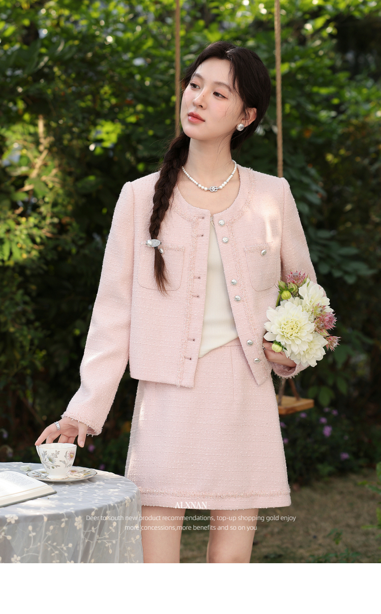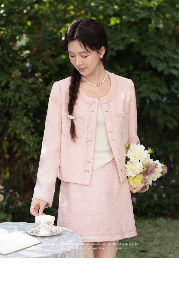 鹿向南「悄然心动」粉色长袖短外套显瘦短半裙春季新款时尚套装女