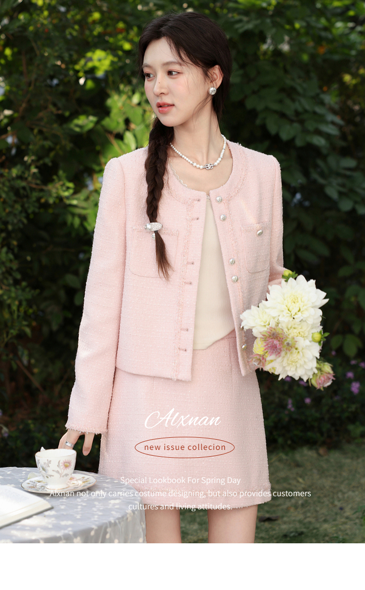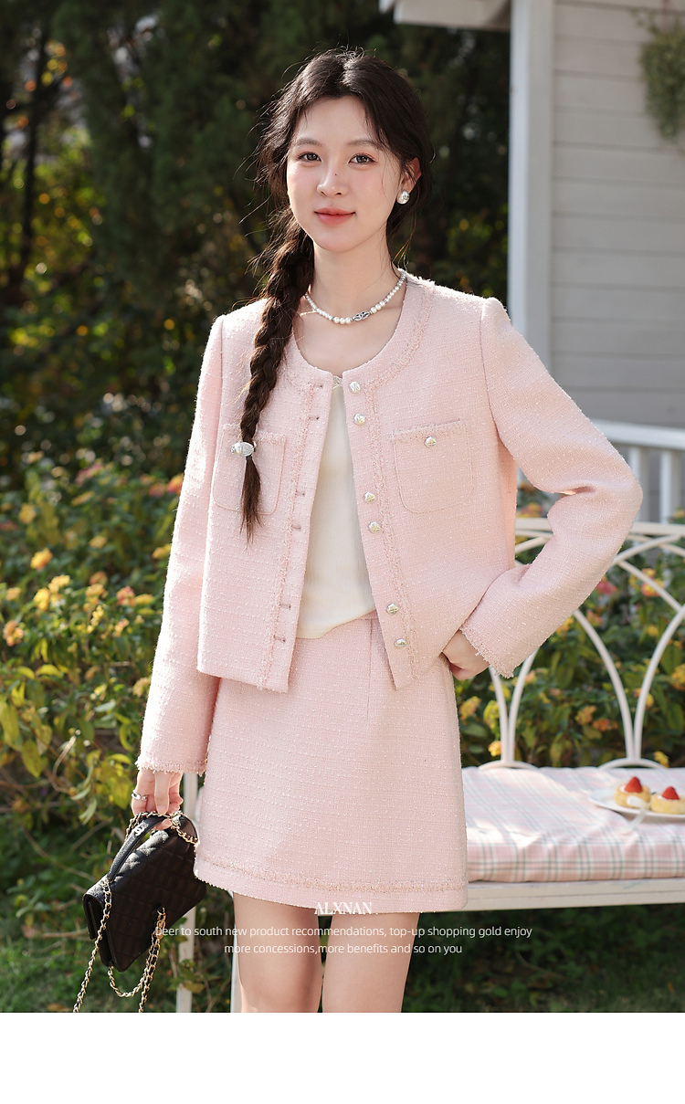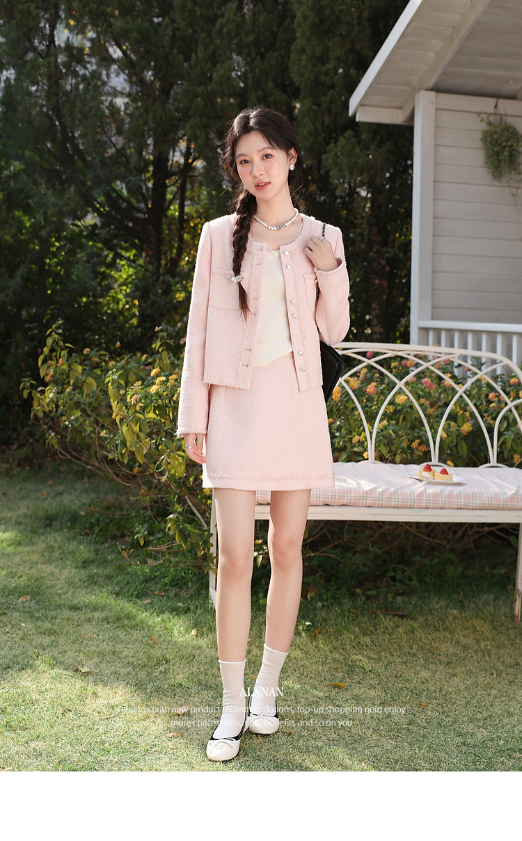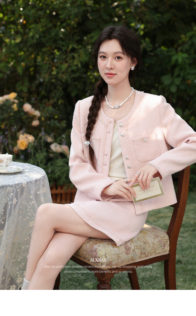 鹿向南「悄然心动」粉色长袖短外套显瘦短半裙春季新款时尚套装女