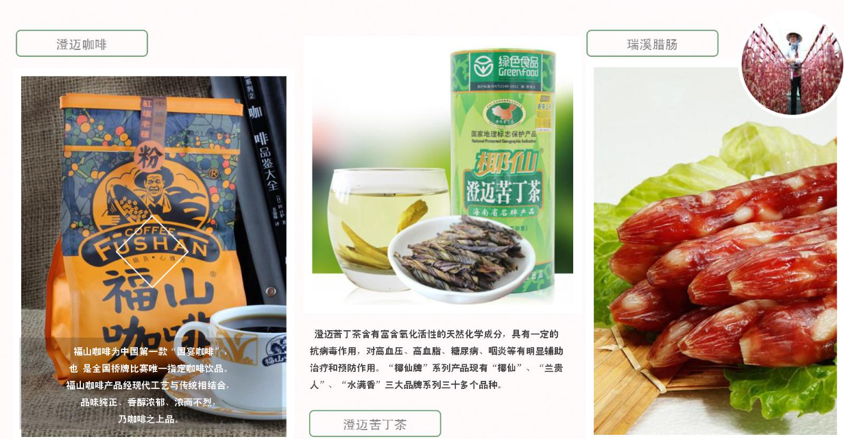 同时还有丰富多彩的人文情怀令人忘返,如驰名海内外的福山咖啡、红坎陶艺园,以及名优特产桥头无核荔枝、澄迈福橙、桥头富硒地瓜、无籽蜜柚、万昌苦丁茶、瑞溪牛肉干、福山烤乳猪、澄迈福牛、白莲鹅、永发乳羊、老城海鲜等几十种。