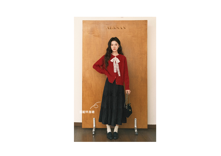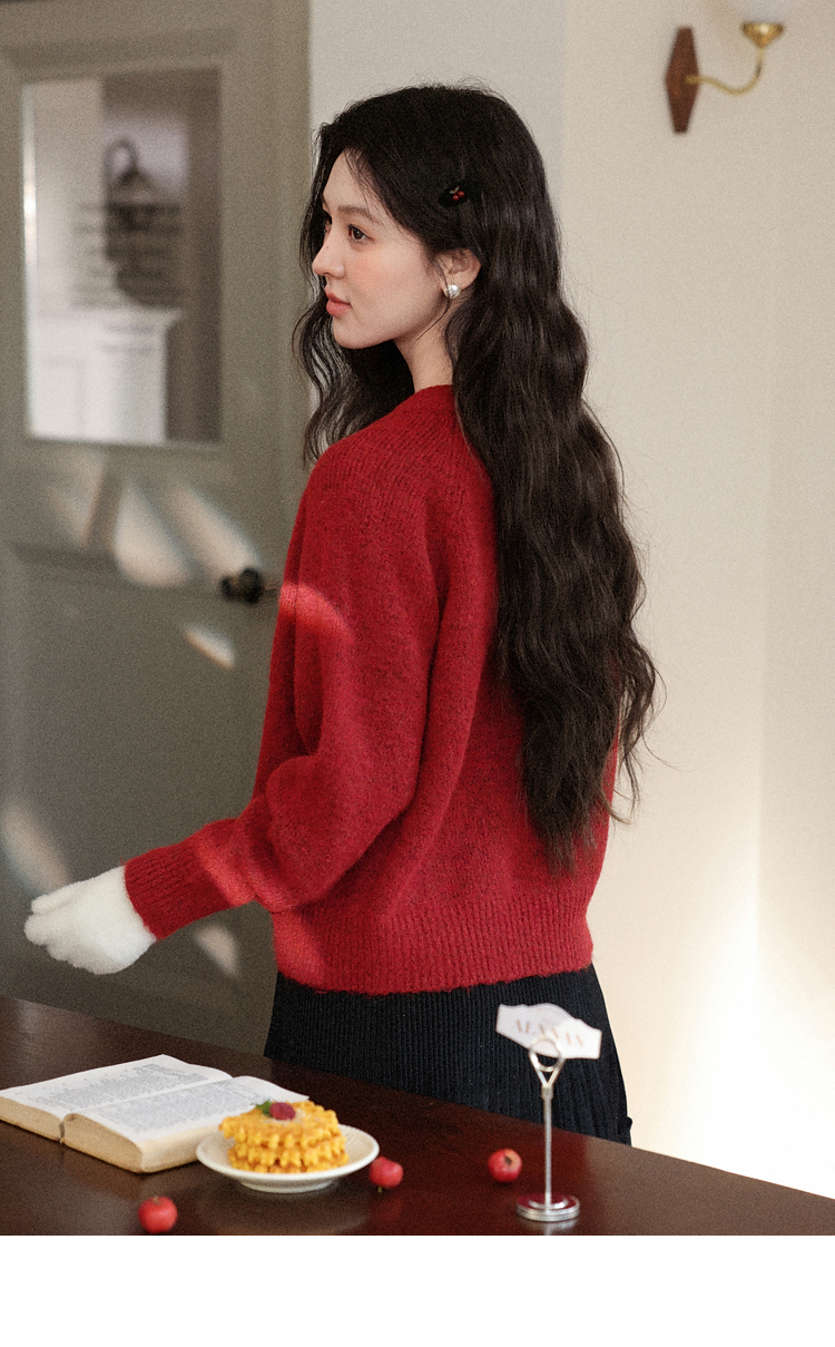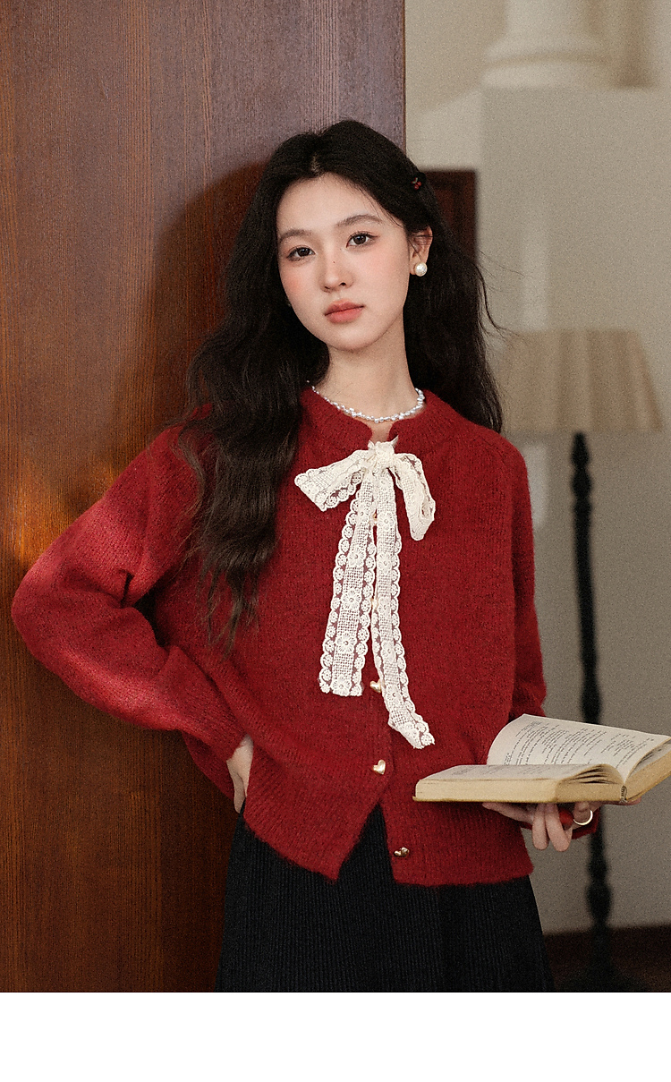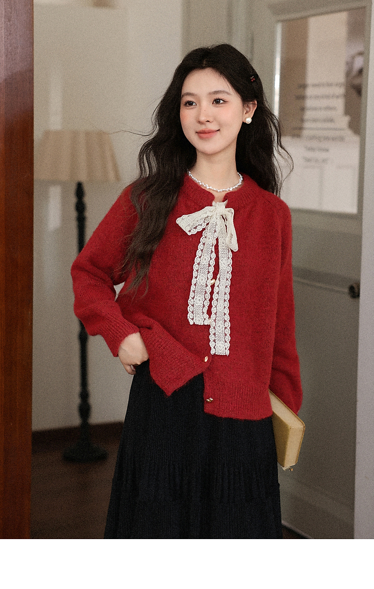 鹿向南「玫瑰庄园」红色蕾丝系带毛衣女秋新款软糯慵懒风长袖上衣